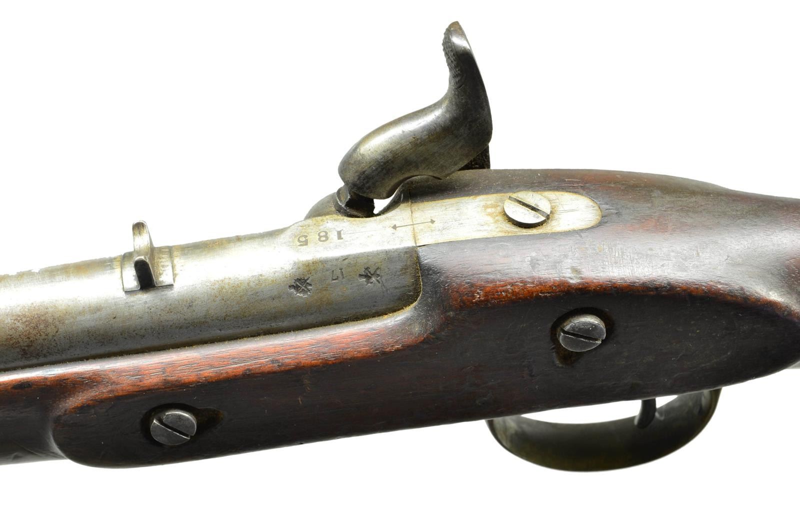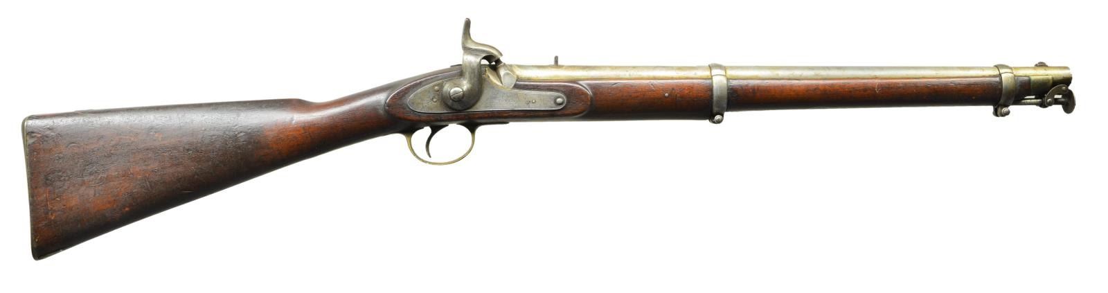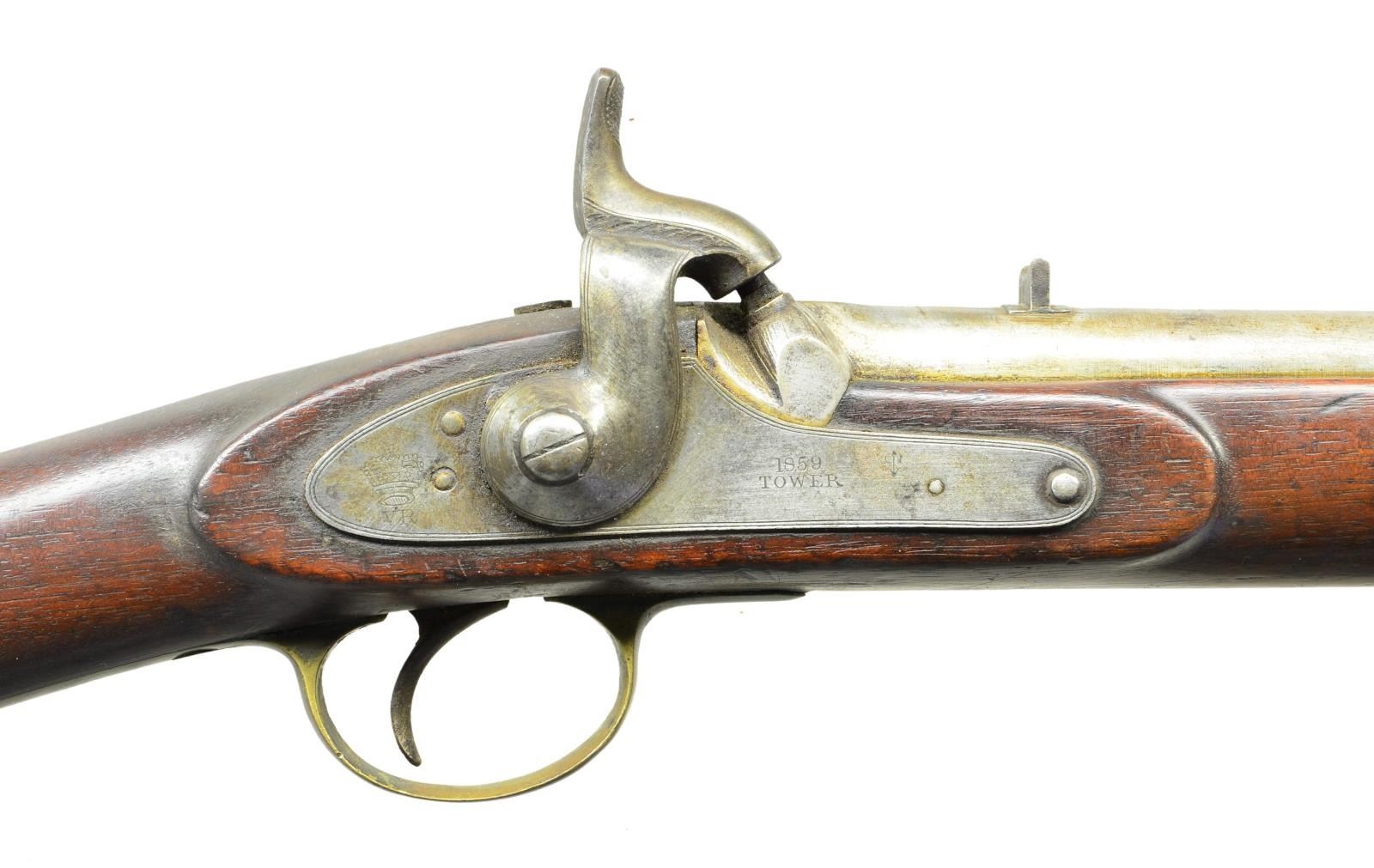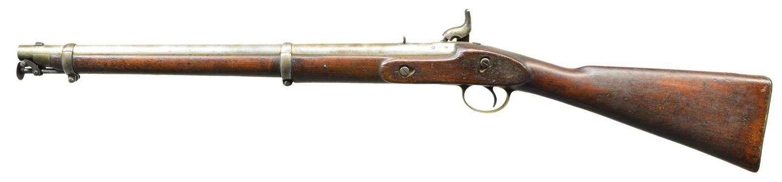 CARBINE. 17 bore. S#185. 36.5” overall, 21” barrel with British military proofs, “17” gauge (about .64cal), “185”, iron mounted, fixed rear sight, 2 barrel bands, captured swivel loading assembly, “VR” cypher, “1859 / TOWER” and broad arrow proof on lock. Made with no provision for sling. CONDITION: very good to fine overall, gray smooth metal, stock sound with arsenal marking and proofs, well fit, missing the 2 inset lock escutcheons, mechanics fine, smooth clear bore. (01-21509/JS). ANTIQUE. $2,000-2,500.