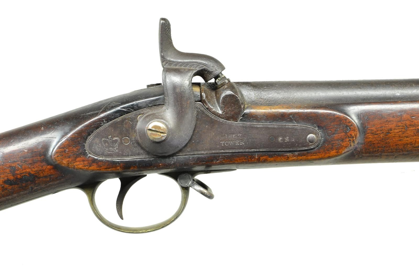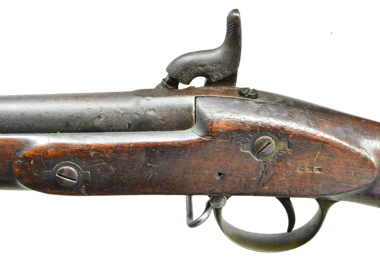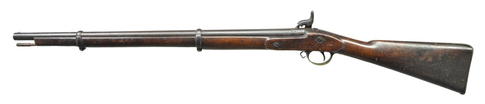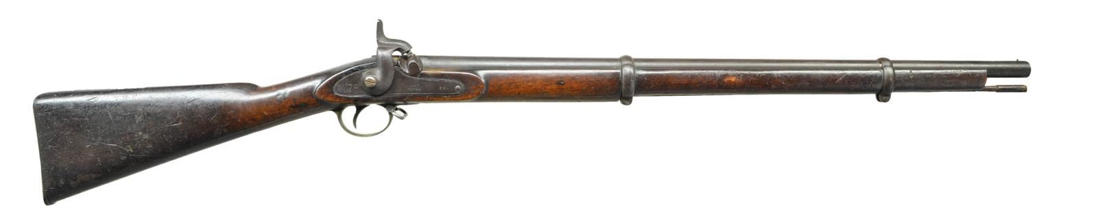 Cal. 577. NSN. Originally rifle musket, cut down to 44” overall, 28” barrel, spurious “CSA” stamp on lock, butt plate, and in stock, wood ramrod, originally .577cal, reamed out to .59cal. CONDITION: good to very good in shortened configuration, good mechanics, clear smooth bore. (01-21510/JS). ANTIQUE. $600-800.