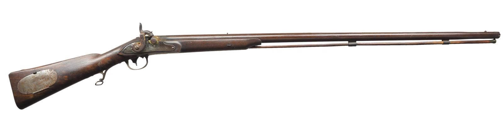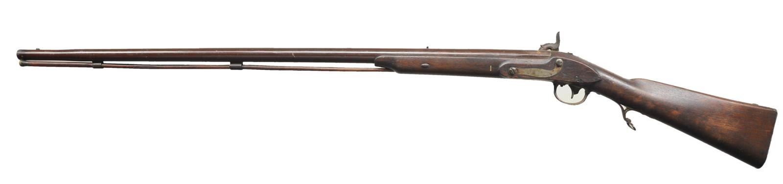 Cal. 58. S# NSN. Bbl. 36" smooth bore of 58 caliber; originally 54 rifled. Mfg. 1824 per lock plate and top tang. Flayderman reference indicates 1821-1823. Correct lock plate markings plus "Vt.", "US" and "JN" at rear of barrel. Left flat of stock has "JW" cartouche. "A.V" on stock behind trigger guard. Top of buttplate "US" marked. Pattern models made at Harper's Ferry and contracts given to various suppliers including Derringer, 2 Johnsons (Robert for this rifle plus R & JD) and others. 5,000 made by R. Johnson; 39,067 by all contractors. Conversions to percussion generally performed in 1840's and they were often used in the Civil War. Usually referred to as the "Common Rifle" to help differentiate them from the Hall's of the period. Configuration includes large oval patch box on right side of buttstock; this one stamped "JE" twice to read from top or bottom. Inside of patchbox is "XVIIII" that may represent "19" assuming "IXX" not known to applicator. Trigger bar, sear and bridle numbered 4. CONDITION: good general appearance with forward portion of stock removed. Barrel has brown to plum tone from refinishing. All markings very clear. Light oxidation throughout with brown tone on patch box cover. Poor bore. Inoperable due to broken lockplate parts; sear split at pivot plus cracked bridle. (01-21767/NW). ANTIQUE. $650-900.