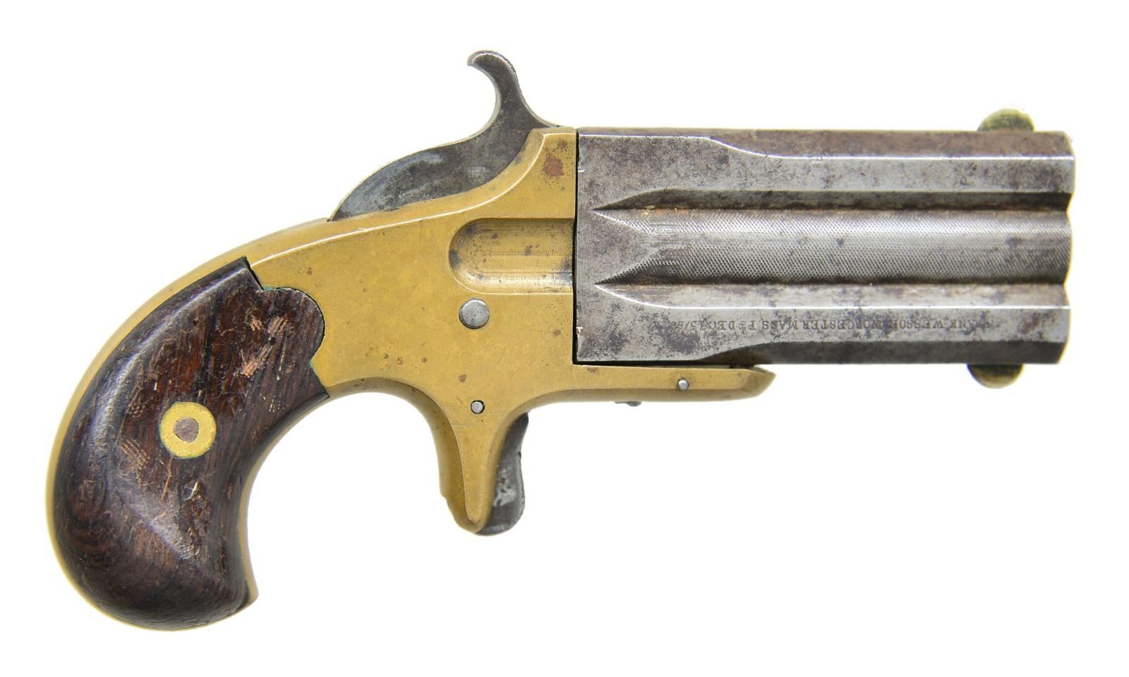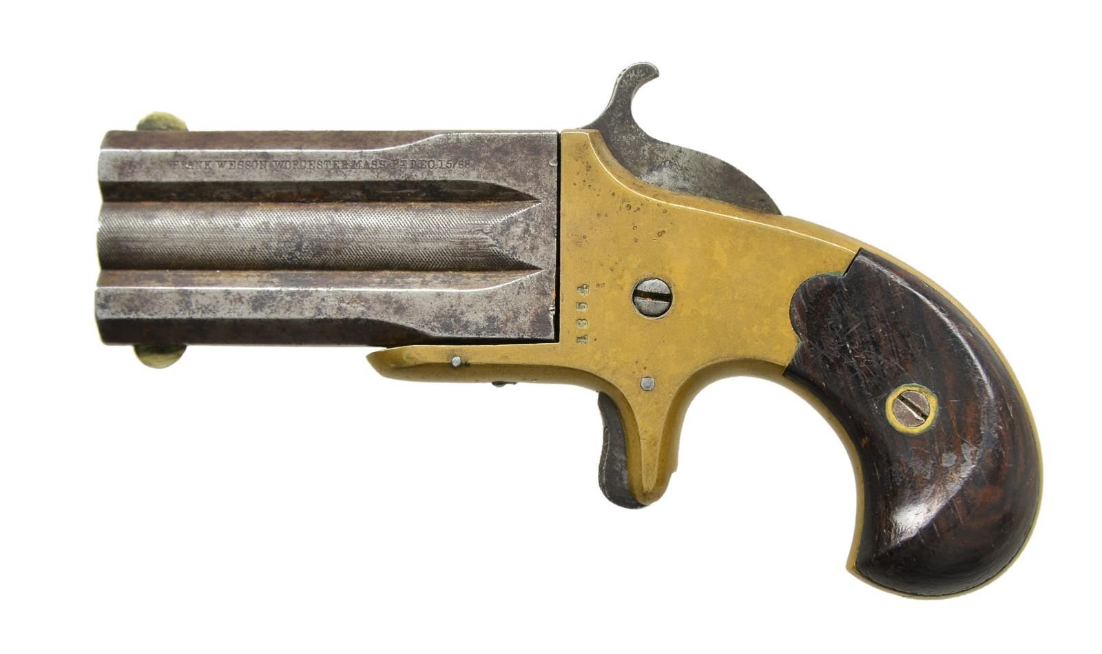 PISTOL. Cal. 32 Short RF. S# 1354. Bbls. 2 1/2" fluted marked on both sides " FRANK WESSON WORCESTER MASS pt. DEC 15/68". Nickel silver circular front sights & knurling to middle section of bbl. Brass spur trigger frame. 2 Piece rosewood grips. CONDITION: good overall. bbl. has gray/brown patina appearing w/ light pitting. Brass has mustard patina appearance w/ minor marks throughout. Good grips w/ flaking varnish & marks. Fair bore w/ pitting. (01-21561/MD). ANTIQUE. $400-600.
