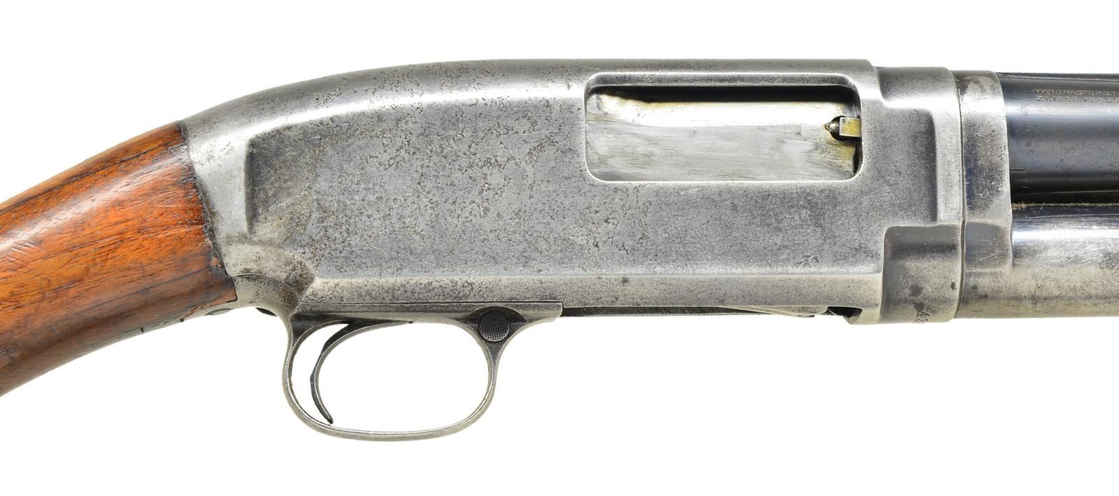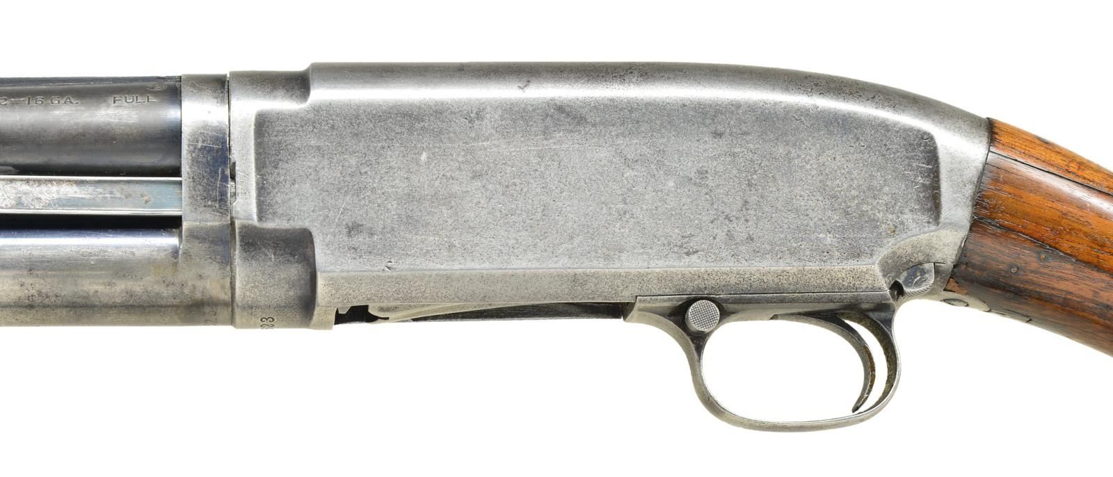 Cal. 16 ga. S#43623. 1912 action with M12 marked bbl. Nickel Steel w/ solid rib, shortened to 23" W/ Cyl. choke. Original choke marking is Full. Small round grooved forearm & early style pistol grip stock w/ original butt plate. Mfg. 1914. CONDITION: Bbl & mag tube have 50% dull fade blue. Action has faded to gray showing very light pitting on right side. Age darkened forarm shows heavy wear. Stock is chipped & cracked at head w/ nail & plastic wood repairs. Hammer will drop before action is closed & must be repaired to be safe. S# is removed from bbl. ext. Good bright bore. (21-1981/DS). CURIO. $350-500.