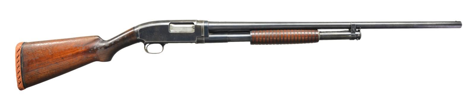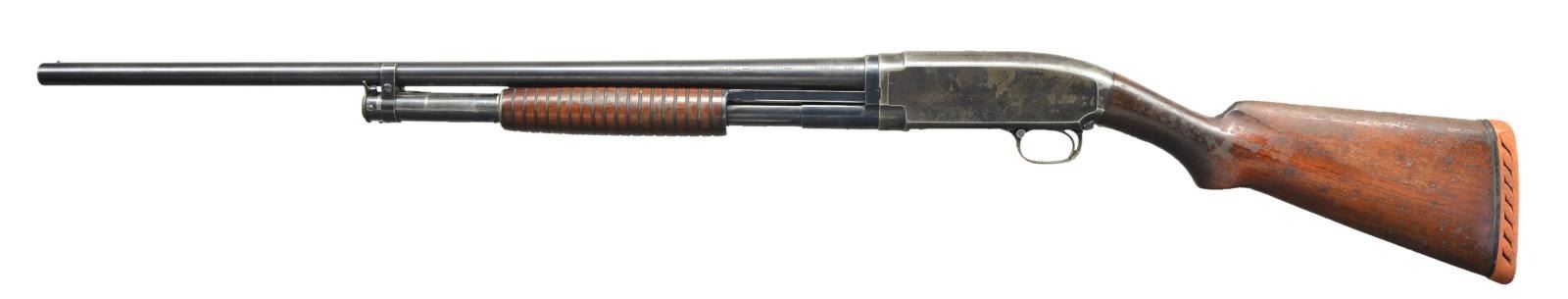 Cal. 12 Ga. S# 378059. Bbl. 28" 2 9/16” chamber & choked “MOD”. S#s match on receiver & Bbl. extension. Front bead sight, blued finish, 18 groove forend & smooth pistol grip buttstock. LOP to recoil pad is 14 3/8”. CONDITION: Bbl. retains about 85% blue; receiver about 40%, each w/ scattered rust, fine pitting and marks. Stock set also has an added finish; butt has water spotting & the buttpad is dried, misshapen & has no visible makers mark. Bore is fair to good; reasonably bright w/ scattered light pitting. (22-3703/CW). CURIO. $250-350.