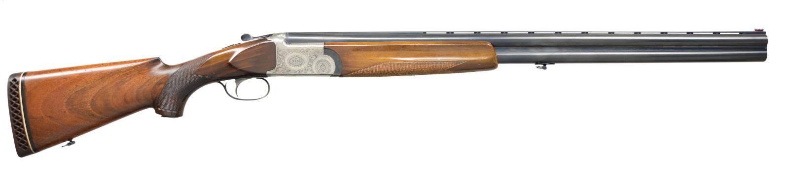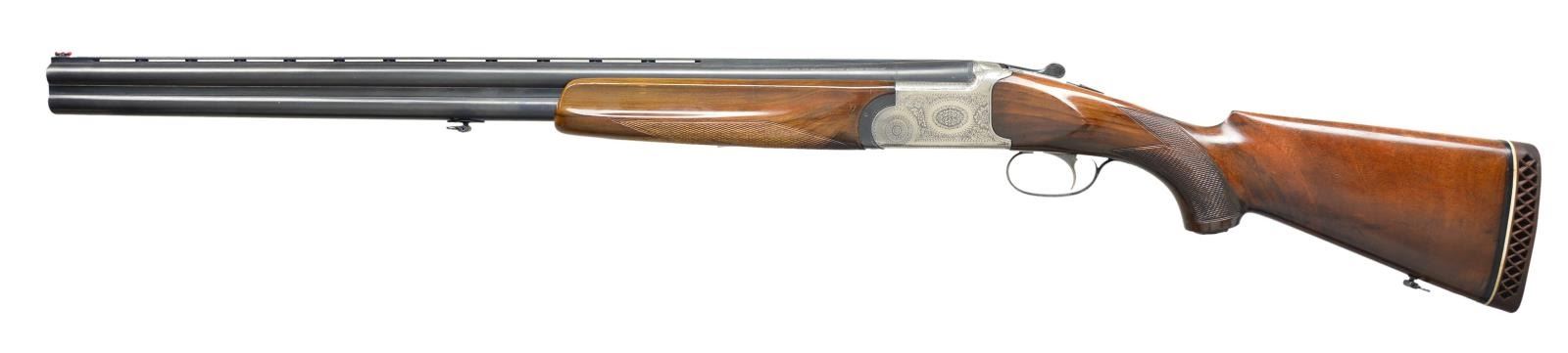 Cal. 12 Ga. 2 3/4" S# 39741. The 27 3/4" mono-bloc barrels with narrow ventilated rib are choked mod & full. Left side of top barrel is marked with Mauser name & address. Bottom of mono-bloc is stamped with Italian nitro proofs. Coin finished low profile O/U boxlock action features non-selective single trigger and non-automatic safety. Action is decorated with etched rose & scroll at about 80% coverage. Pistol grip buttstock of somewhat stump figured European walnut measures 13 1/2" over open sided white line pad. Point pattern checkering is at grip & a steel tag engraved M. S. is nailed to bottom of grip. Matching target type one piece forend has Deeley type release. MEASUREMENTS: STOCK: DAH: 2 1/4". DAC: 1 3/8". CAST: neutral. LOP: 13 1/2". WEIGHT: 7 lb. 6 oz. UNATTACHED ACCESSORIES: black plastic case. CONDITION: very good retaining about 85% of original finish overall, with many scratches & marks in all factory finishes. Shiny bores, mechanically good. (22-5051/MGM). MODERN. $600-1,000.