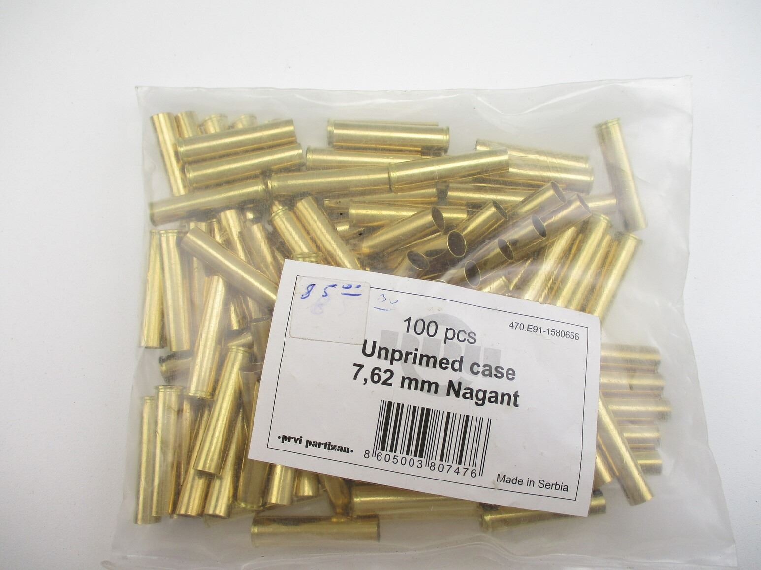 NON-PRIMED 7.62MM NAGANT CASES LOT, 100 CASES (STATED ON BAG, NOT CONFIRMED)