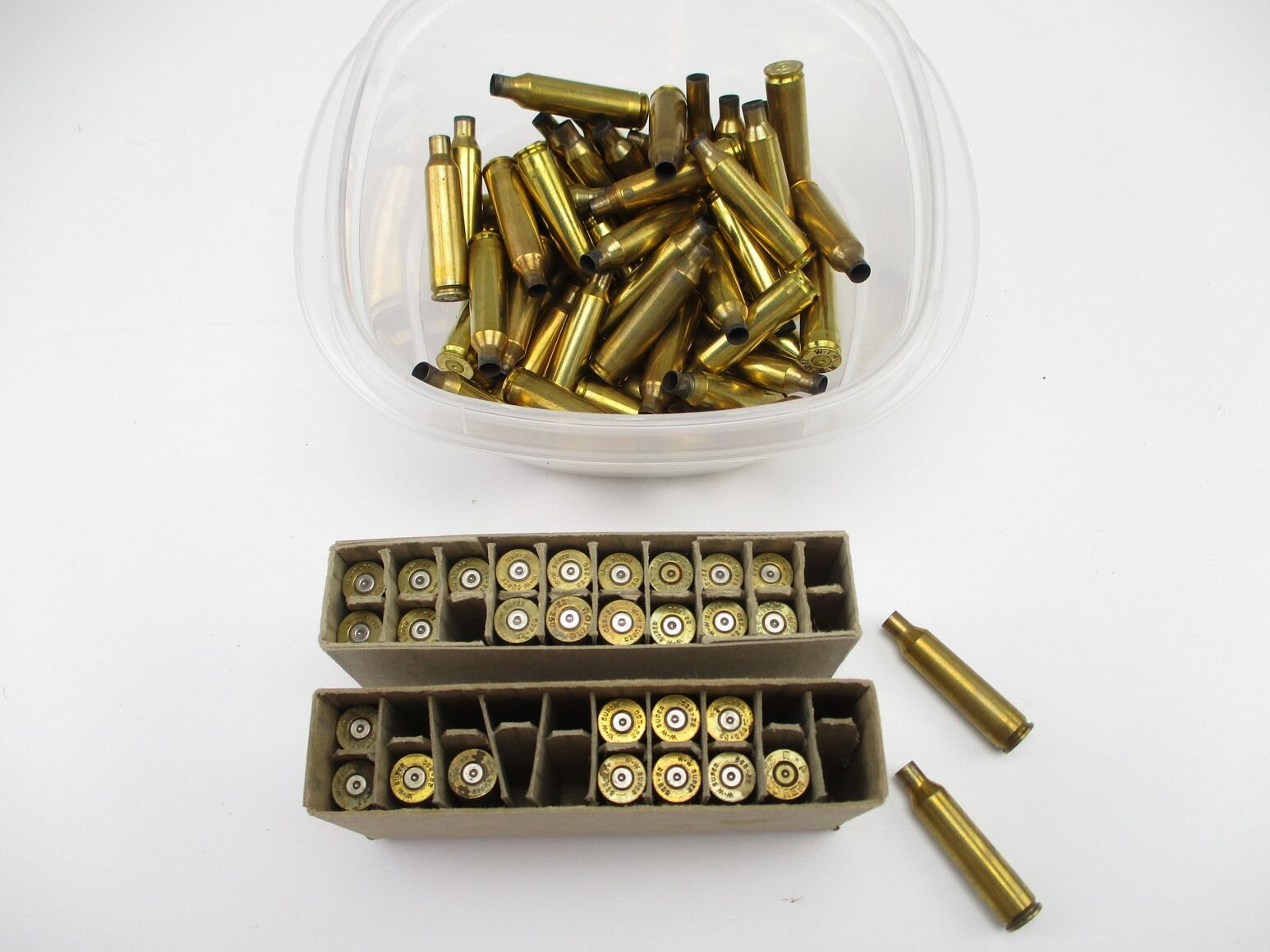 NON-PRIMED .22-250 CASES LOT, 86 BRASS CASES TOTAL, VARIOUS MFG'S