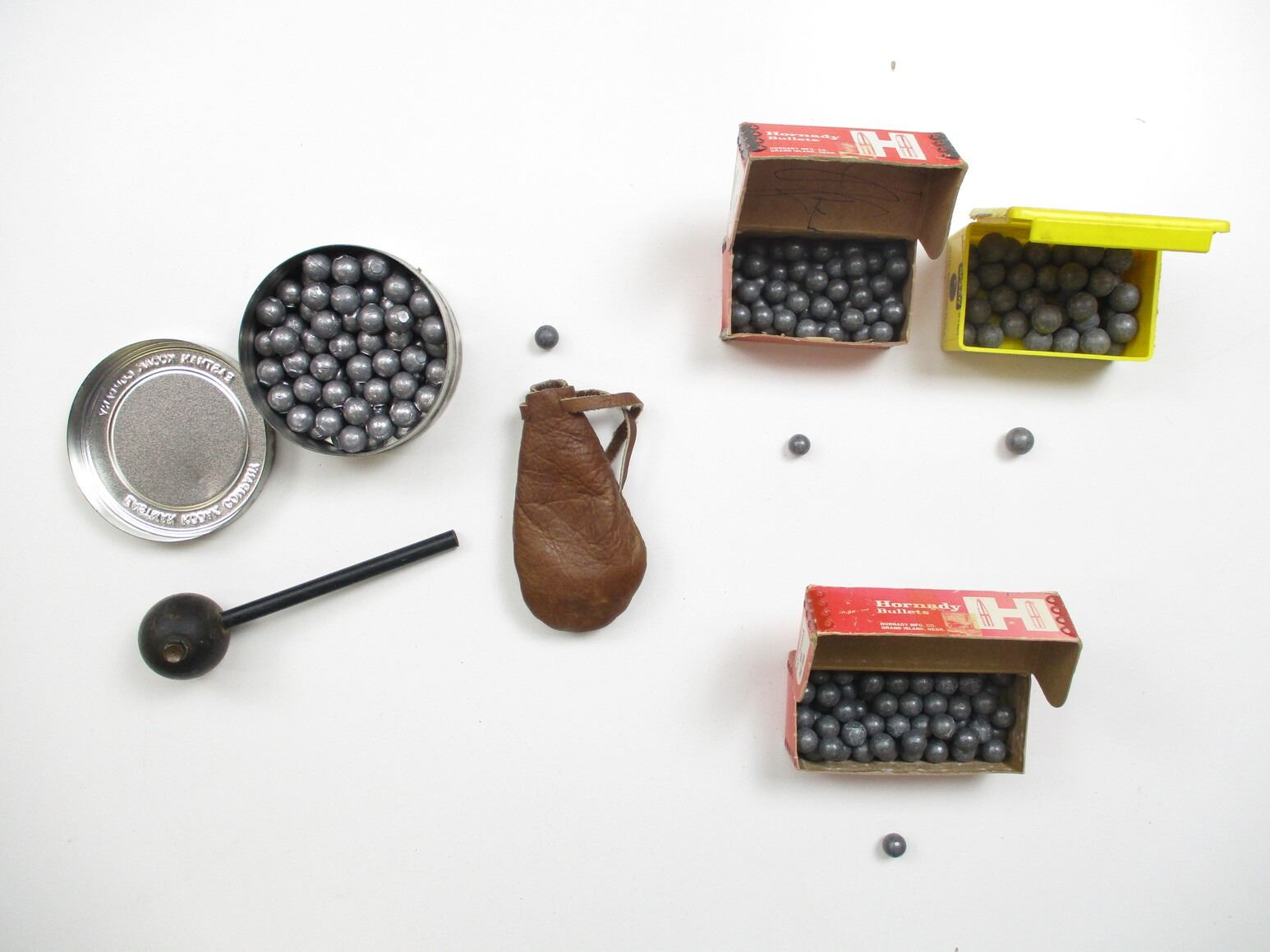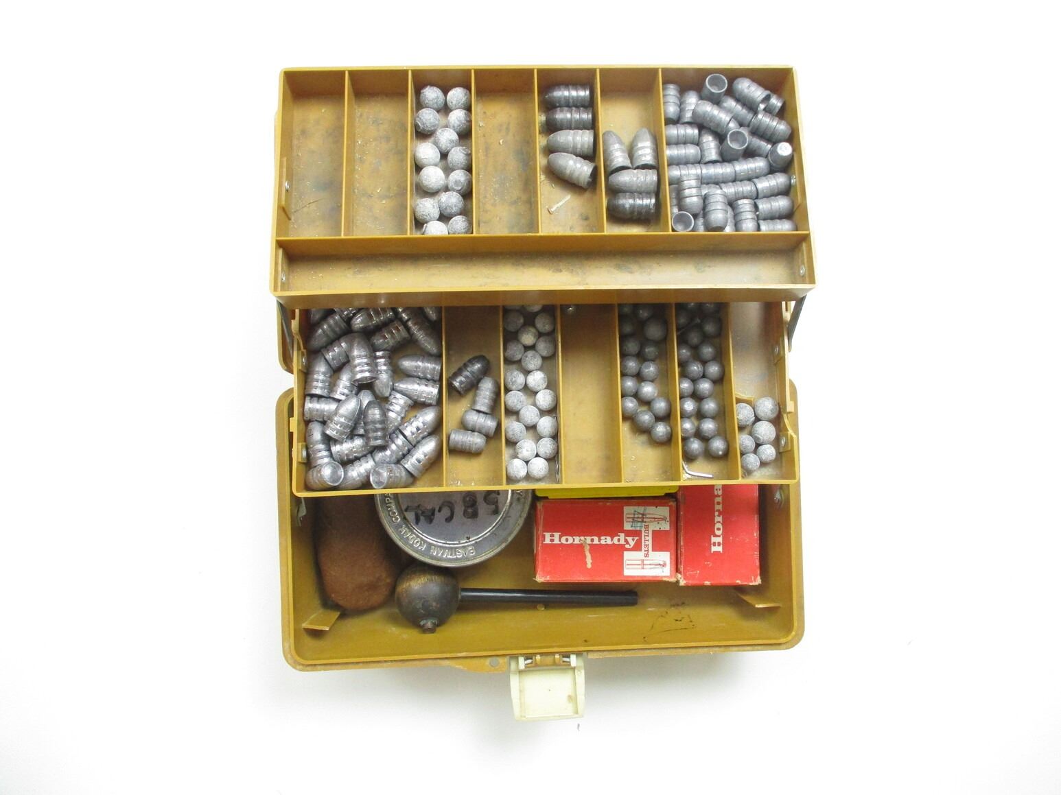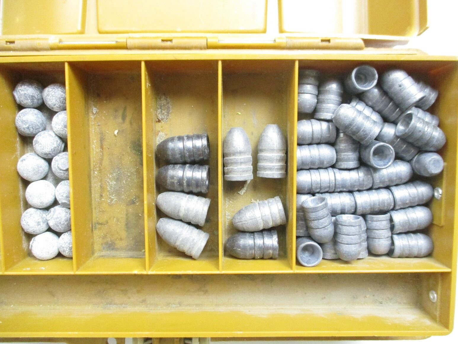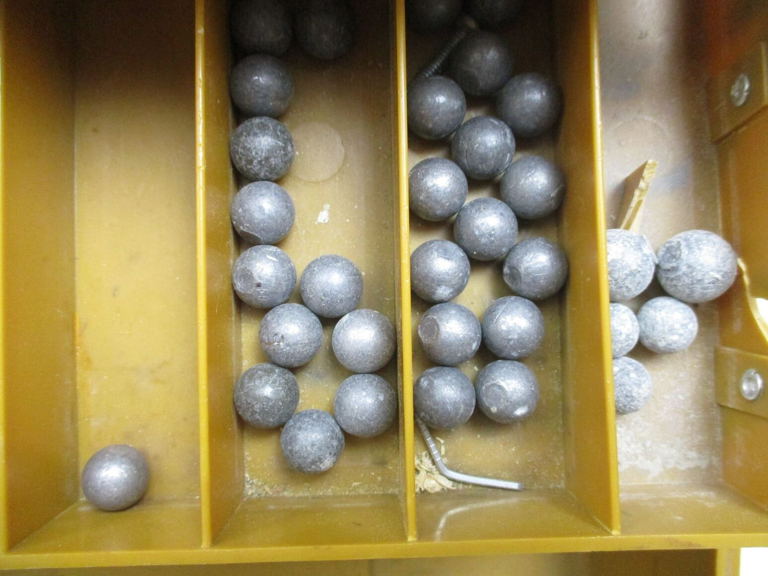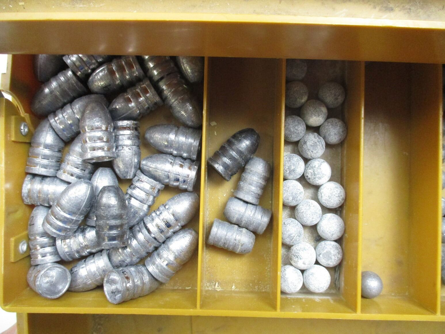 ASSORTED BULLETS LOT, APPROX 19.1 LBS, VARIOUS DIAMETERS INCLUDING: .575", .497", ETC., ALSO INCLUDES VARIOUS LEAD BALLS INCLUDING: .570", .488", ETC., LOT INCLUDES (1) BULLET STARTER, LOT ALSO INCLUDES (1) PLASTIC CONTAINER, APPROX 13" X 7.5" X 6"