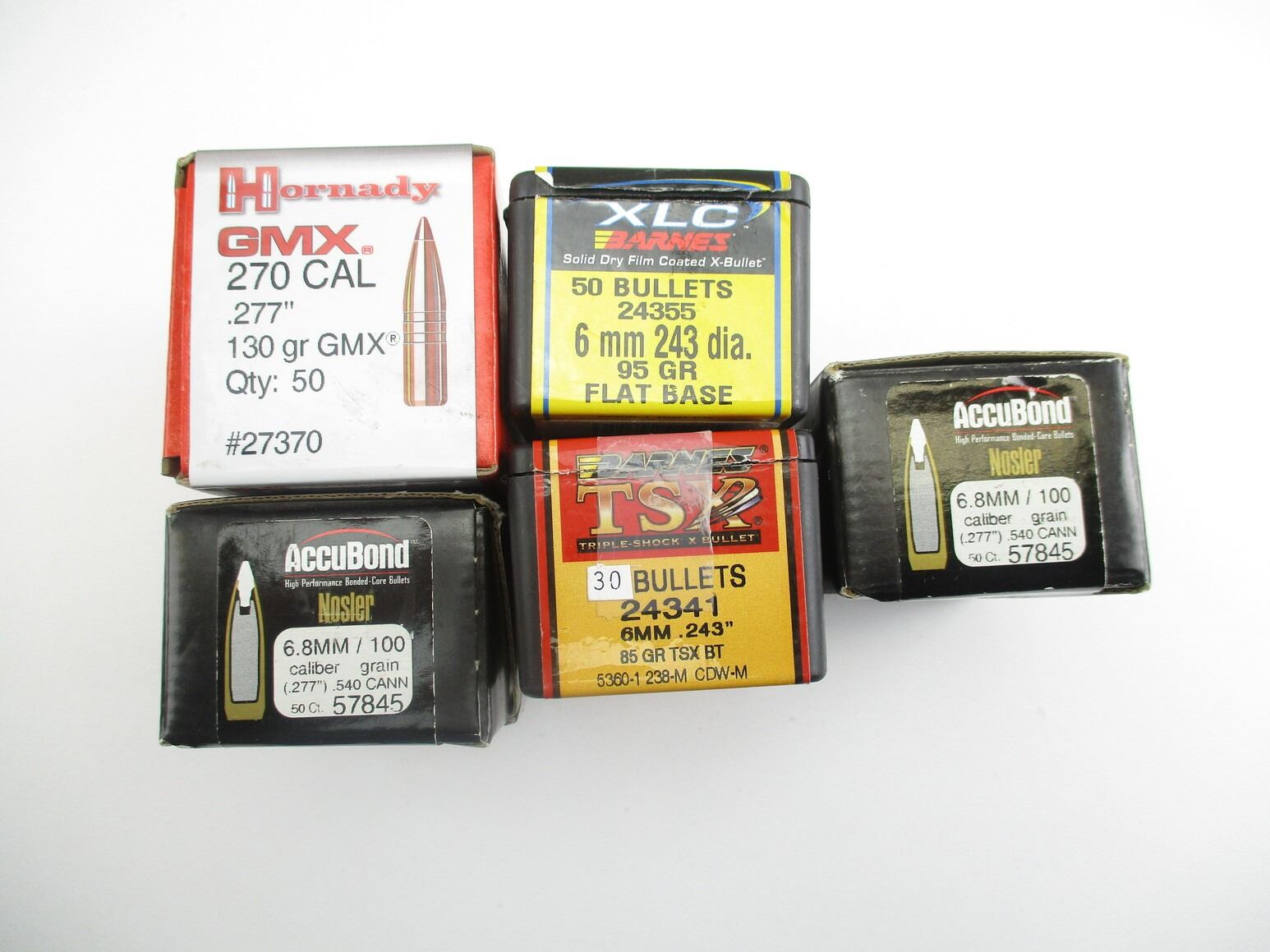 ASSORTED .270 CAL, 6MM CAL AND 6.8MM CAL BULLETS LOT, APPROX 3.7 LBS, HORNADY, BARNES, & NOSLER MFG'S