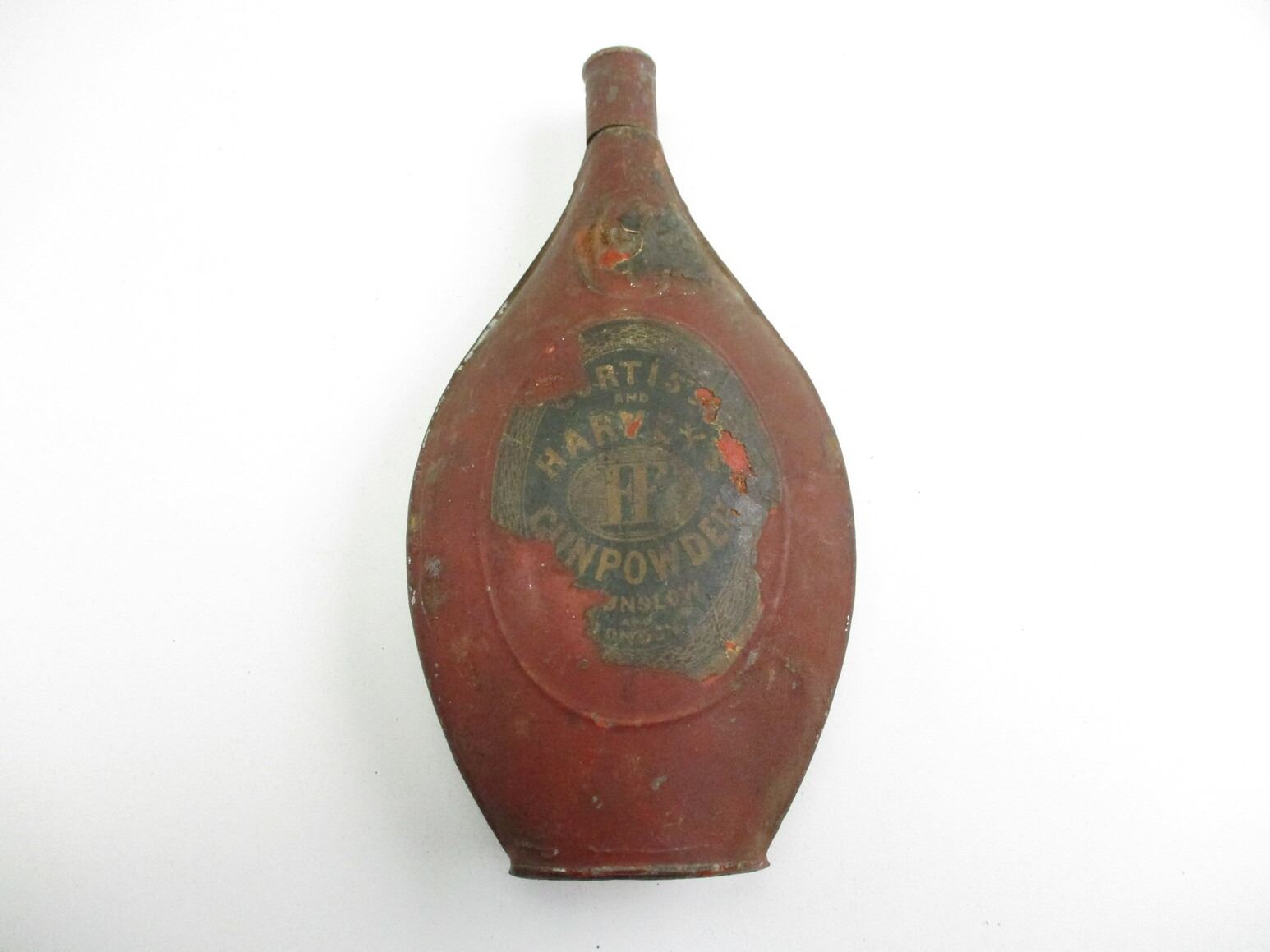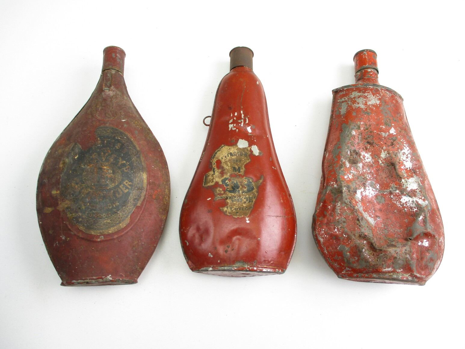 COLLECTIBLE EMPTY GUN POWDER FLASK LOT, LOT OF 3, (1) CURTIS'S AND HARVEY'S, (2) UNMARKED