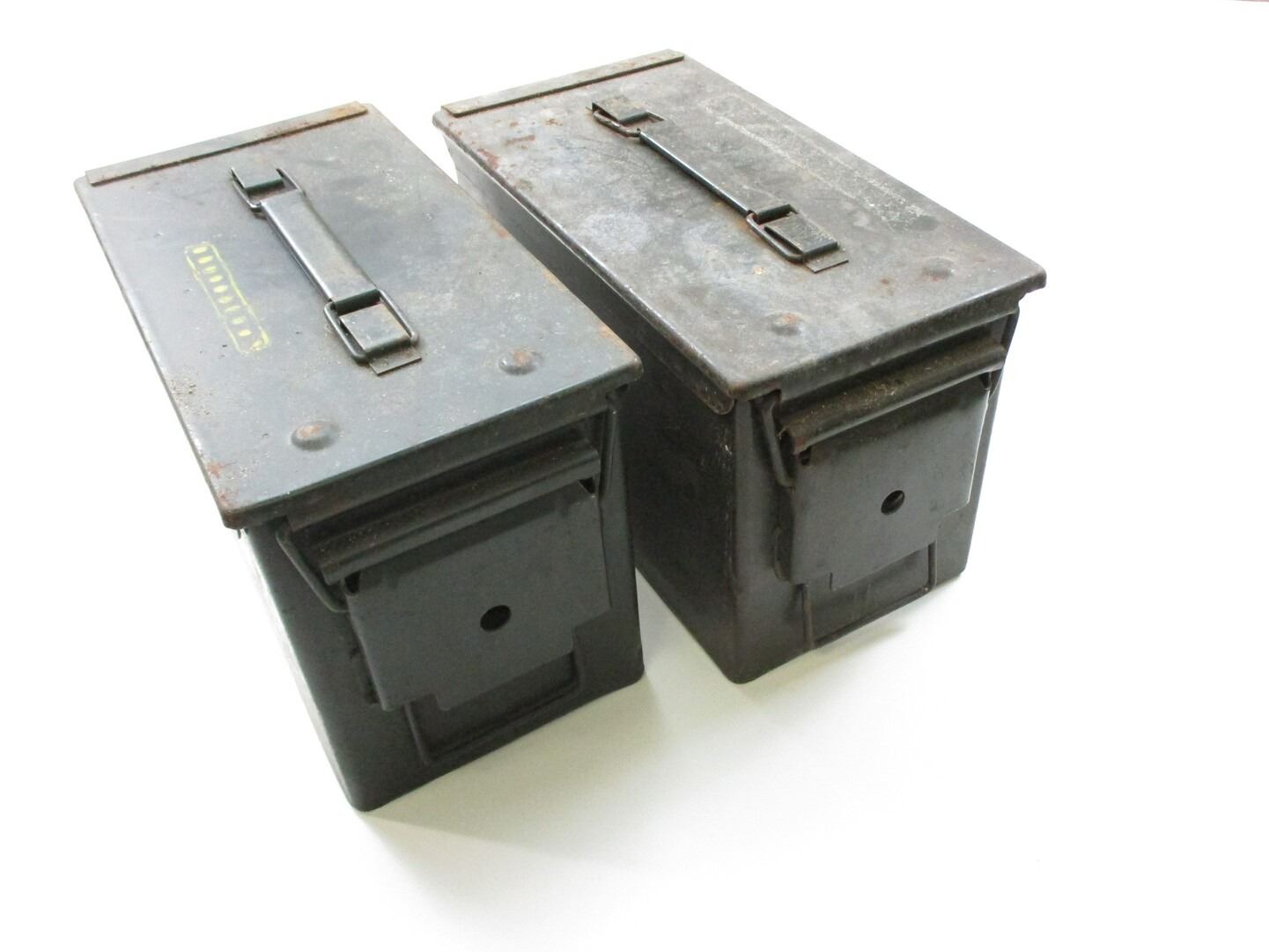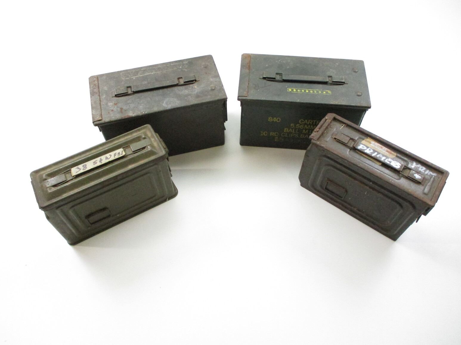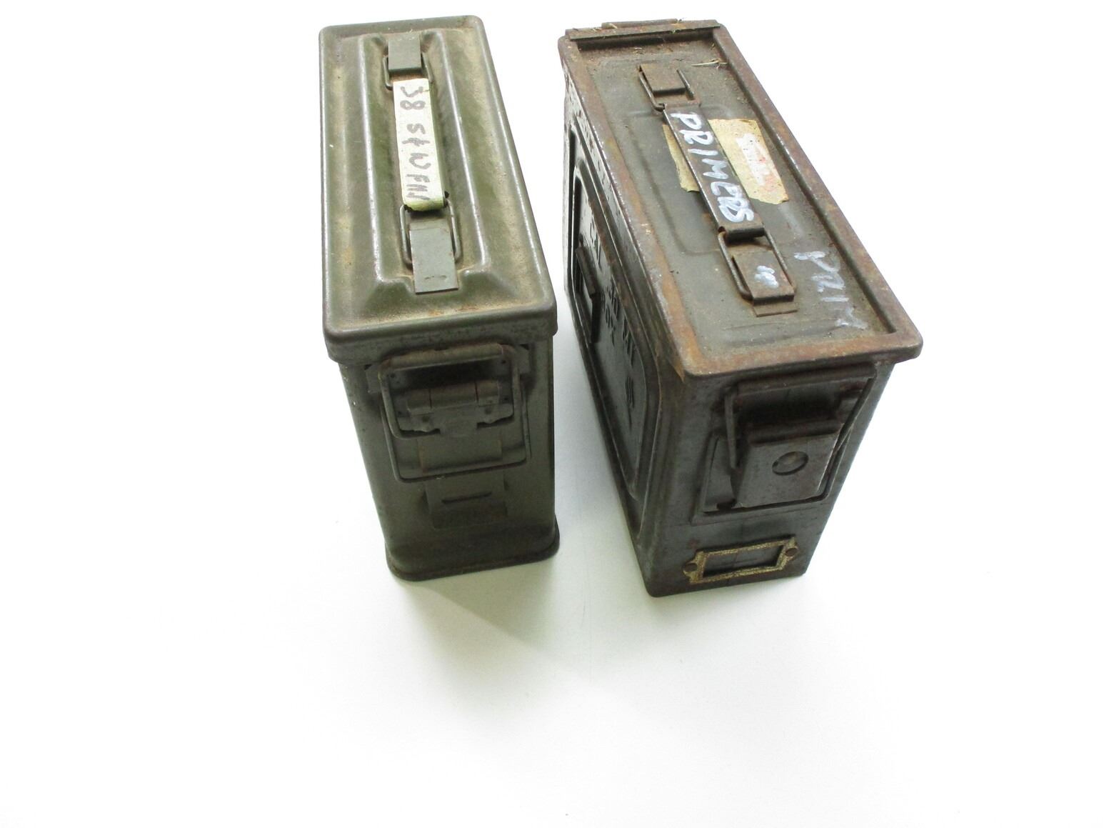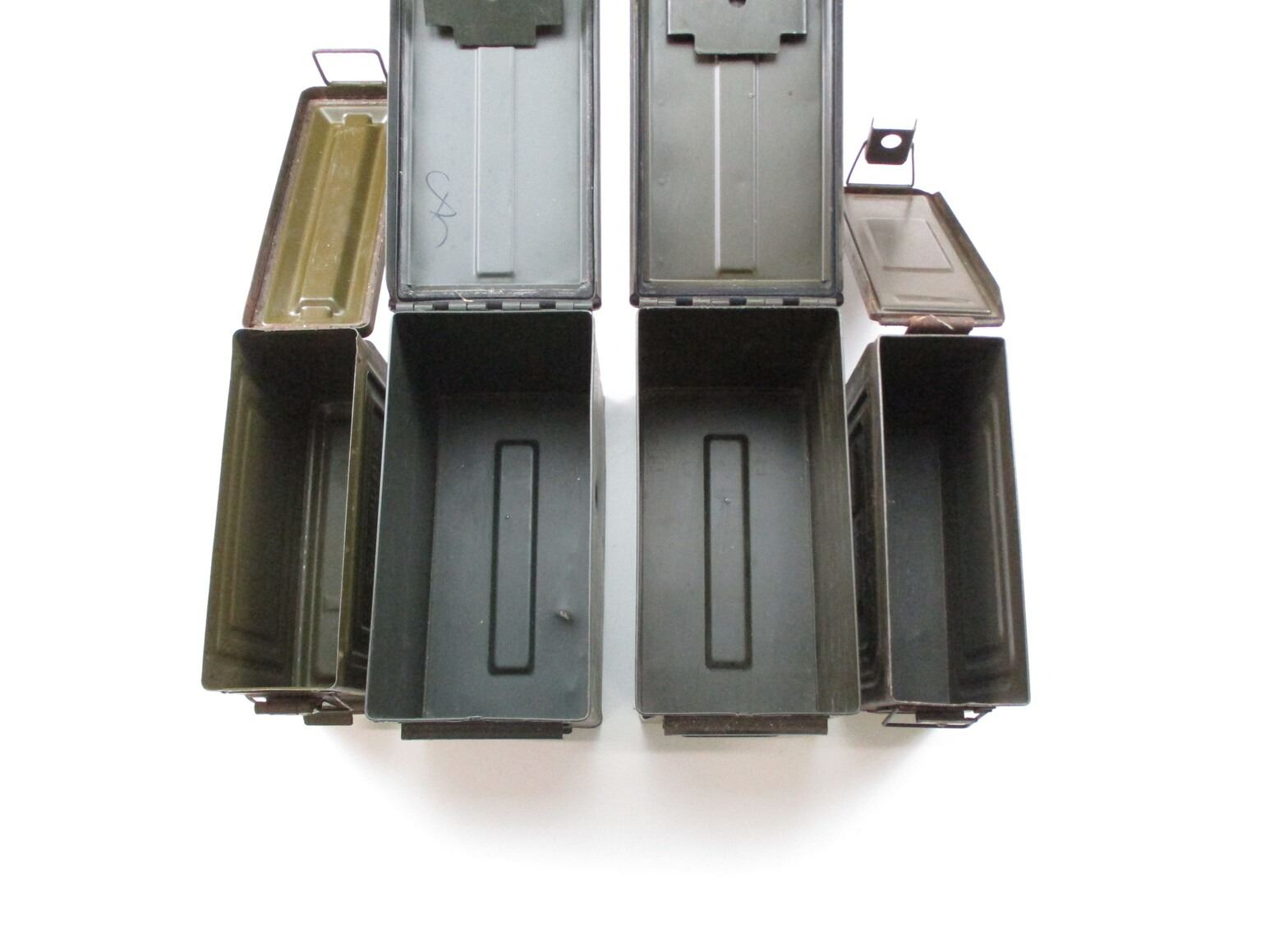 METAL AMMO TIN LOT, LOT INCLUDES; (2) GREEN METAL AMMO TINS, VARIOUS MARKINGS, APPROX. 11 3/4" x 6 1/8" x 7 1/4" & (2) GREEN METAL AMMO TINS, VARIOUS MARKINGS, APPROX. 10 1/4" X 3 3/4" X 7 1/8". SEE PHOTOS.