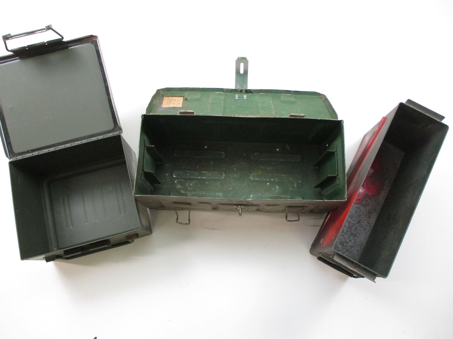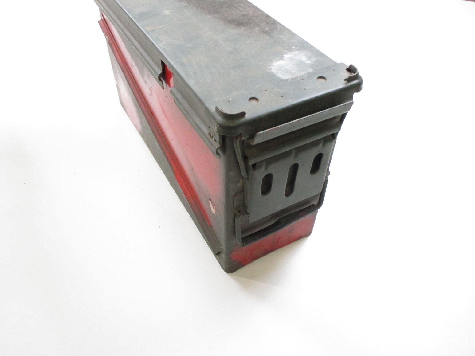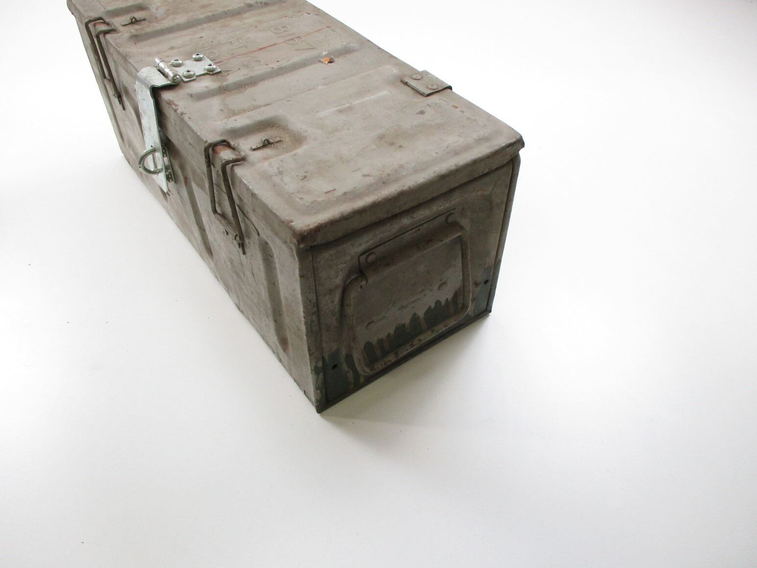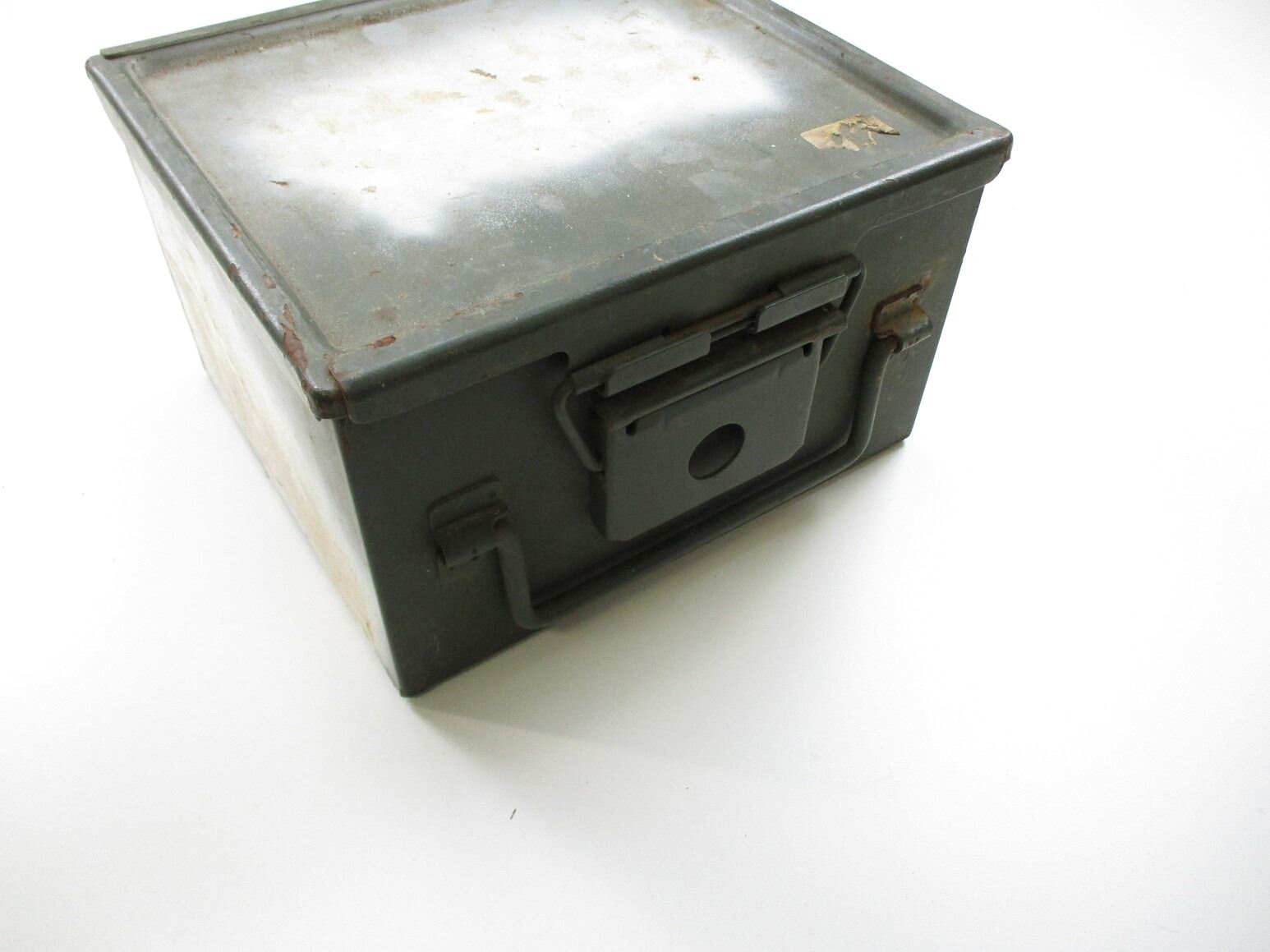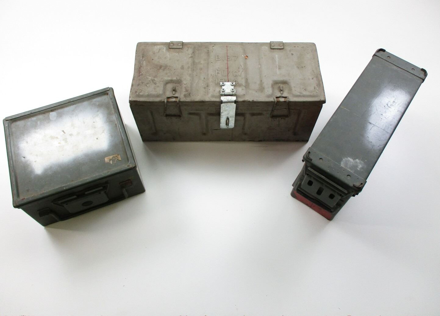 METAL AMMO TIN LOT, LOT INCLUDES; (1) GREY PAINTED AMMO TIN, VARIOUS MARKINGS, APPROX. 21 1/2" X 9 1/2" X 9 1/8", (1) GREEN AMMO TIN, VARIOUS MARKINGS, APPROX. 12 3/8" X 12 1/4" X 8" & (1) GREEN AMMO TIN, VARIOUS MARKINGS, APPROX. 19 1/4" X 6 3/8" X 10 1/4". SEE PHOTOS.