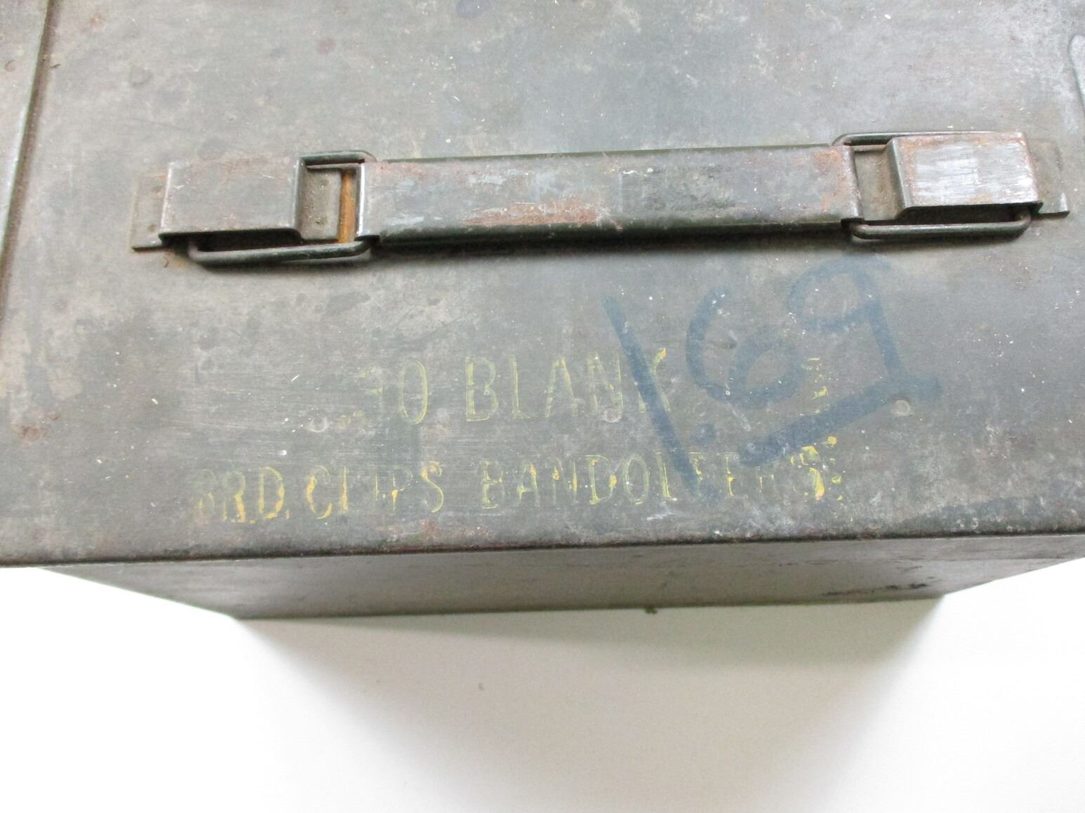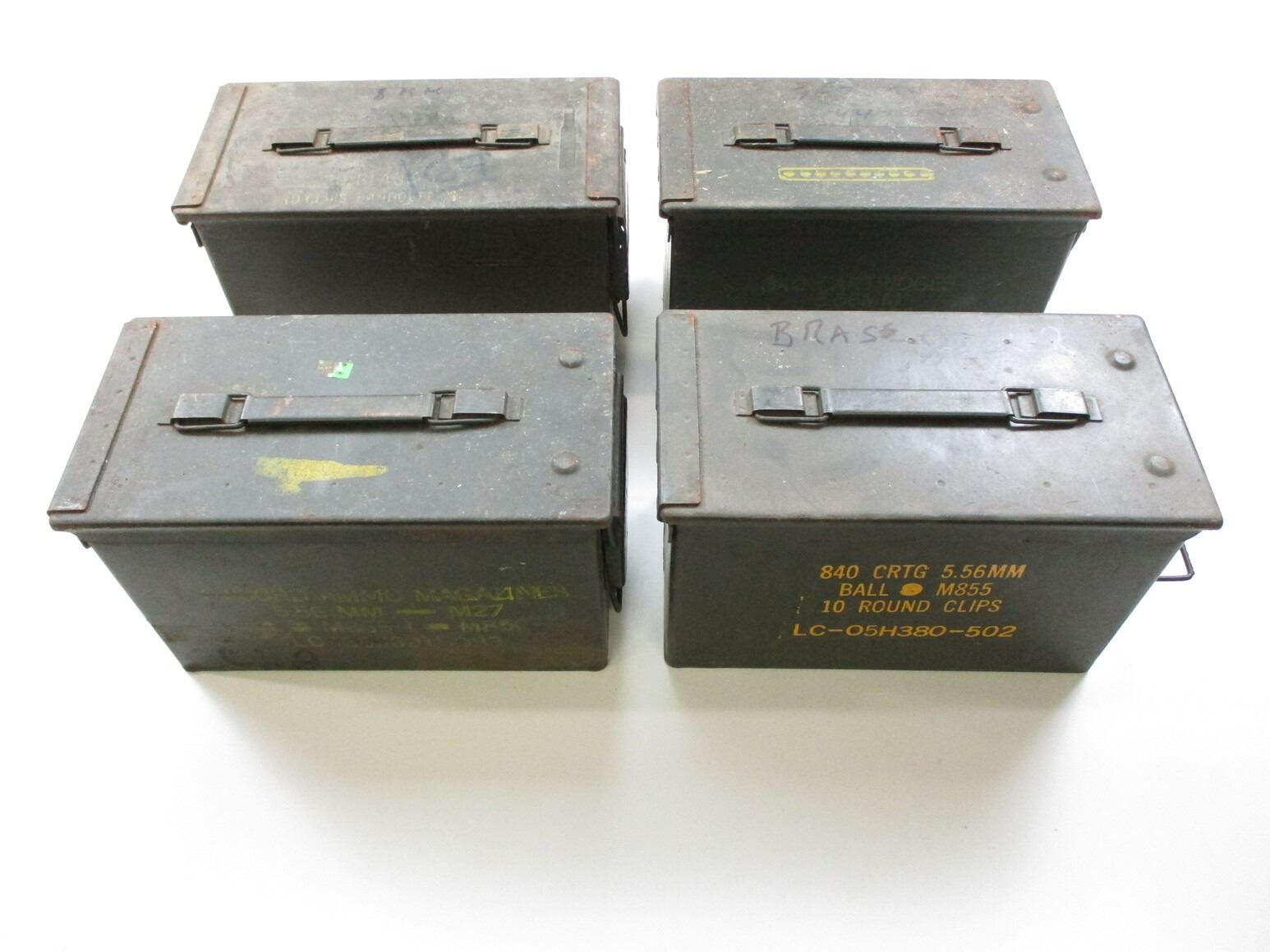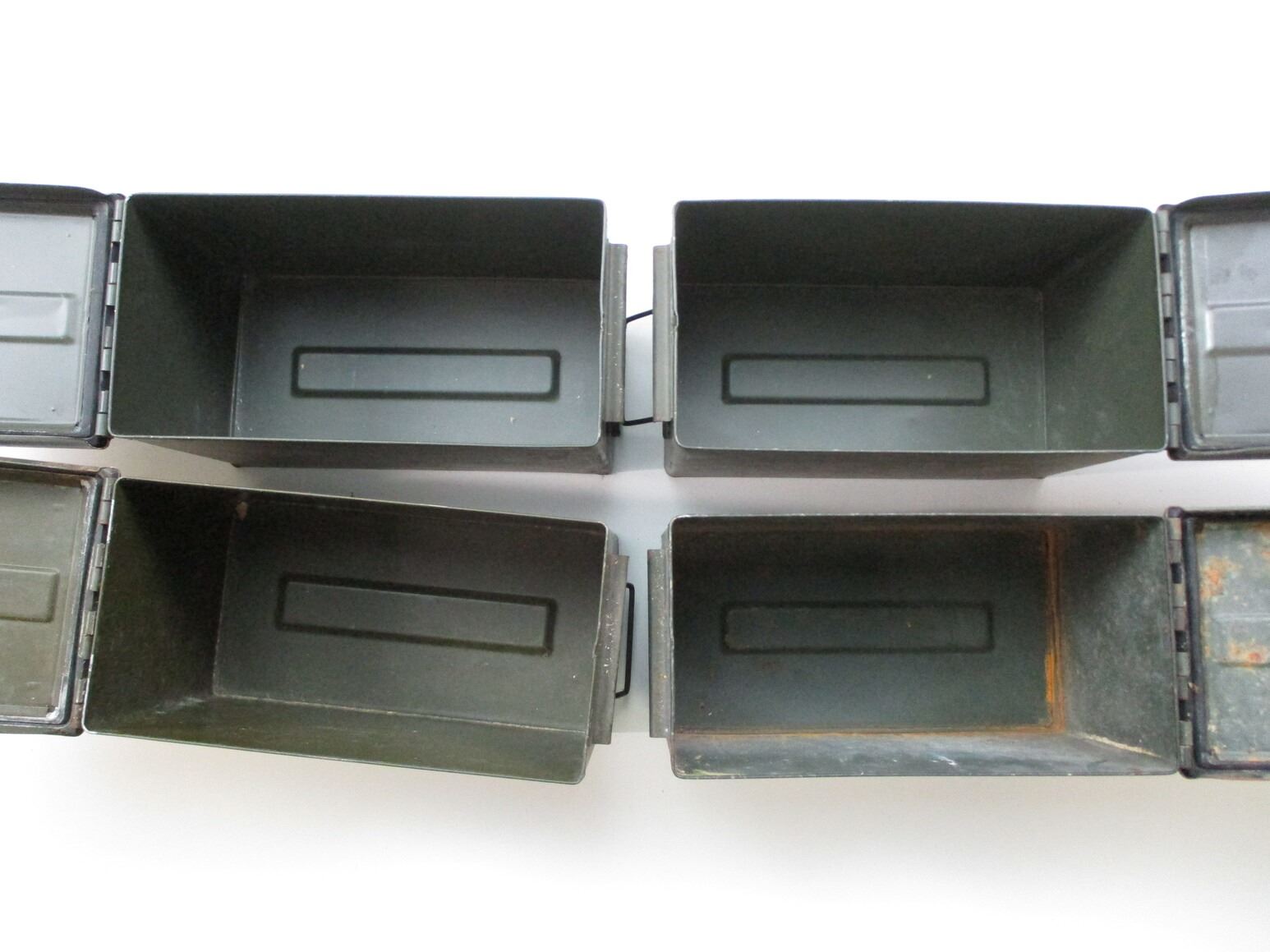 METAL AMMO TIN LOT, LOT INCLUDES; (4) GREEN AMMO TINS, WITH RUST & VARIOUS MARKINGS, APPROX. 12" X 6.25" X 7.5". SEE PHOTOS.