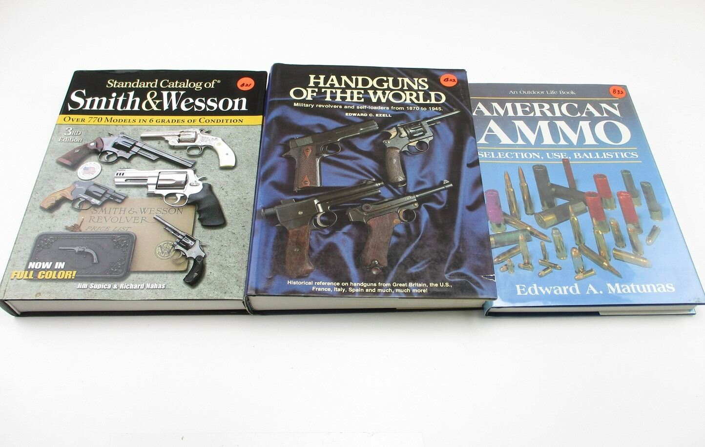 ASSORTED BOOK LOT, LOT INCLUDES: (1) "STANDARD CATALOG OF SMITH & WESSON" BY JIM SUPICA & RICHARD NAHAS, 3RD EDITION, 2006, ISBN 9780896892934, (1) "HANDGUNS OF THE WORLD: MILITARY REVOLVERS & SELF-LOADERS FROM 1870 TO 1945" BY EDWARD C. EZELL, 1981, ISBN 0811708160, (1) "AMERICAN AMMO: SELECTION, USE, BALLISTICS" BY EDWARD A. MATUNAS, 1989, ISBN 1556540604, SEE PHOTOS