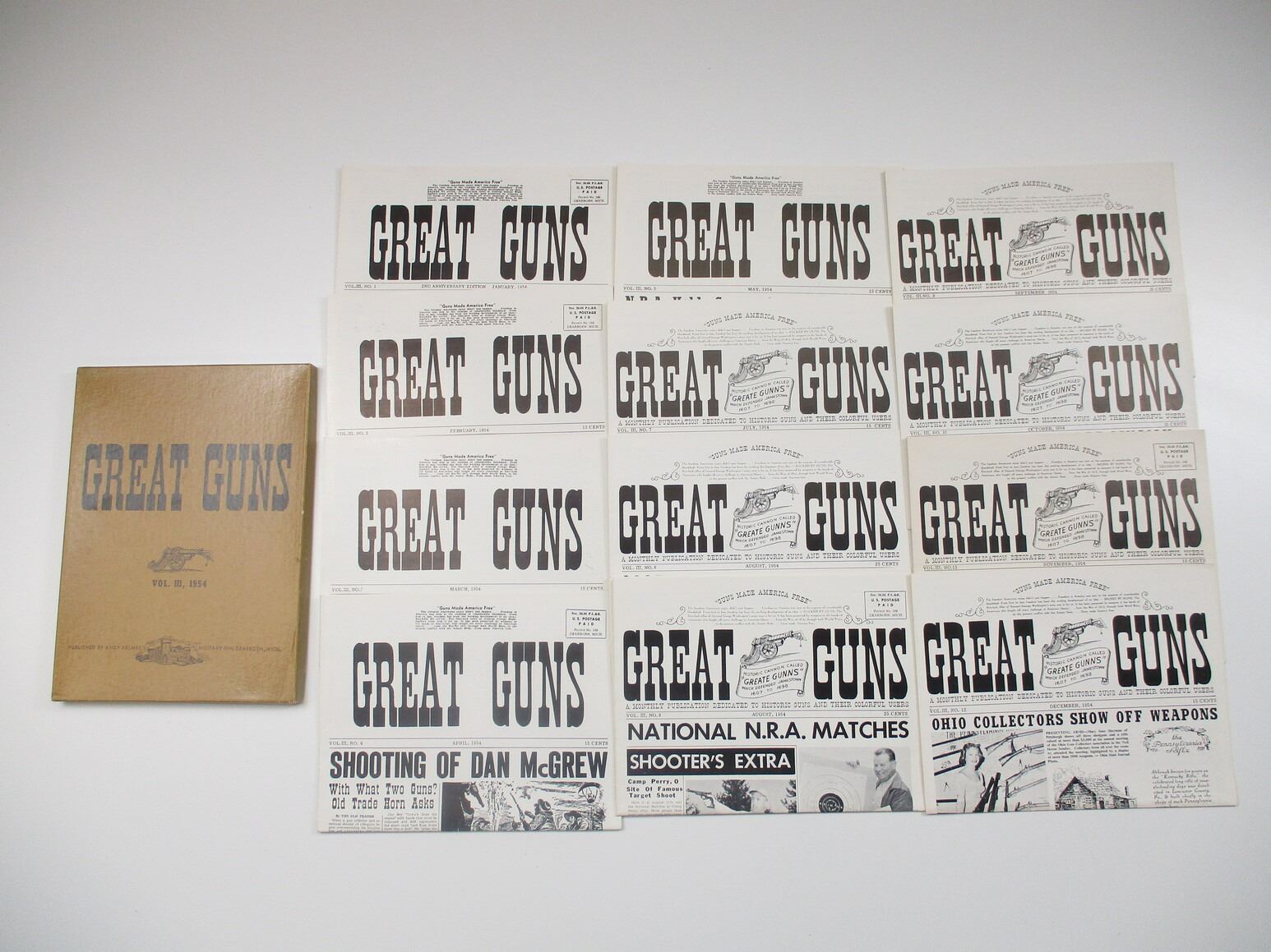 ASSORTED BOOK LOT, BOXED SET OF ANDY PALMER'S "GREAT GUNS" NEWSPAPER VOLUME III, 1954, JANUARY,FEBRUARY, MARCH, APRIL, MAY, JUNE, JULY, AUGUST, SEPTEMBER, OCTOBER, NOVEMBER, DECEMBER FROM MILITARY INN DEARBORN, MICHIGAN, SEE PHOTOS