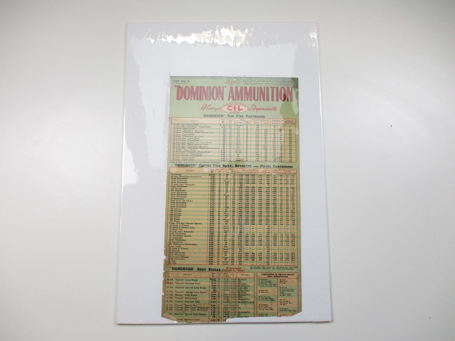 CIL POSTER LOT, CIL DOMINION AMMUNITION POSTER, LIST NO. 2, PLASTIC COVERED ON POSTER BOARD, APPROX. 20"X30", SEE PHOTOS