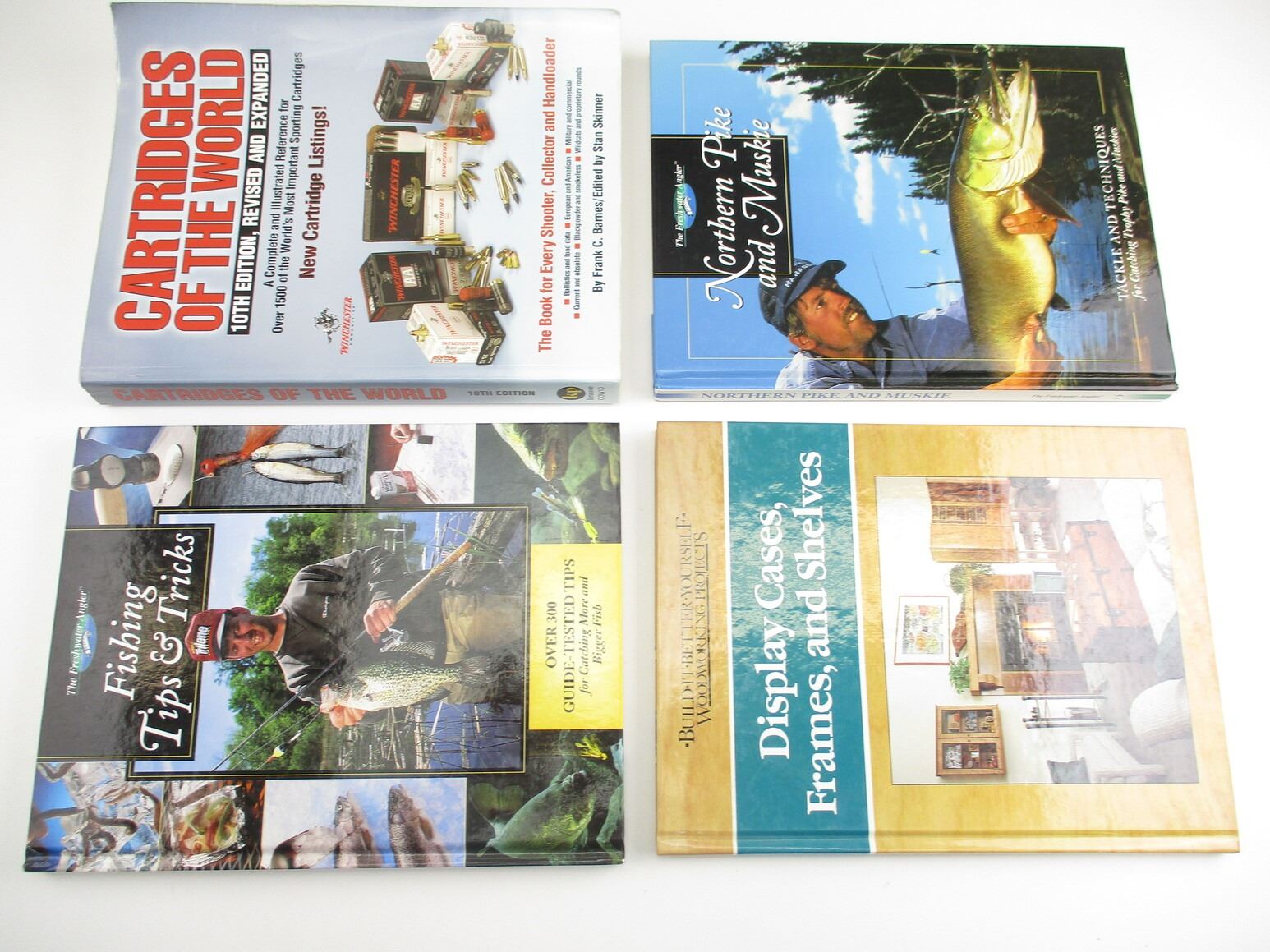 ASSORTED BOOK LOT, LOT INCLUDES; (1) "FISHING TIPS & TRICKS" BY THE FRESHWATER ANGLER, 1990, ISBN 9780865730335; (1) "NORTHERN PIKE AND MUSKIE" BY THE FRESHWATER ANGLER, 1992, ISBN 9780865730373; (1) "CARTRIDGES OF THE WORLD" 10TH ED. BY FRANK C. BARNES, 2003, ISBN 9780873496056; (1) "DISPLAY CASES, FRAMES, AND SHELVES" BY NICK ENGLER, 1989, ISBN 0878578439, SEE PHOTOS