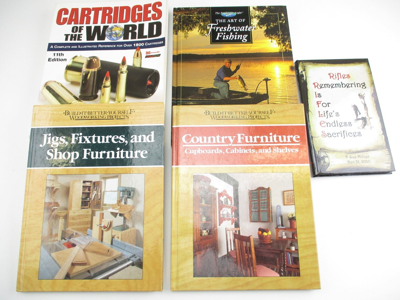 ASSORTED BOOK LOT, LOT INCLUDES; (1) "RIFLES: REMEMBERING IS FOR LIFE'S ENDLESS SACRIFICES" BY SUE MILNER, 2020, ISBN 9780995055629, SIGNED BY AUTHOR; (1) "THE ART OF FRESHWATER FISHING" BY THE FRESHWATER ANGLER, 1997, ISBN 9780865730724; (1) "COUNTRY FURNITURE: CUPBOARDS, CABINETS AND SHELVES" BY NICK ENGLER, 1990, ISBN 087857929X; (1) "JIGS, FIXTURES AND SHOP FURNITURE" BY NICK ENGLER, 1989, ISBN 0878578390; (1) "CARTRIDGES OF THE WORLD" 11TH ED. BY FRANK C. BARNES, 2006, ISBN 9780896892972, SEE PHOTOS