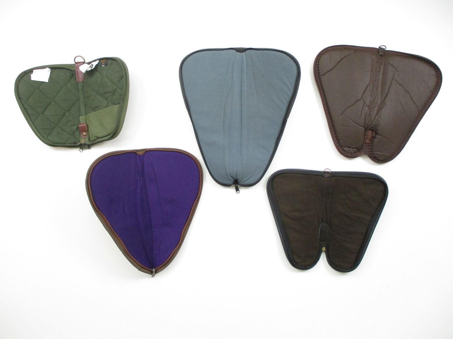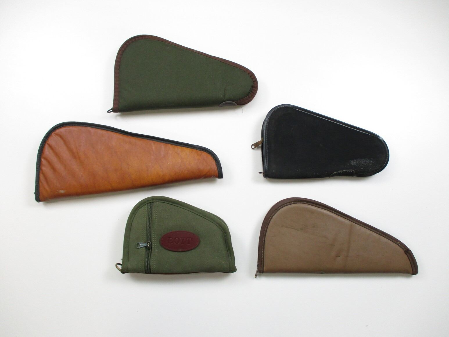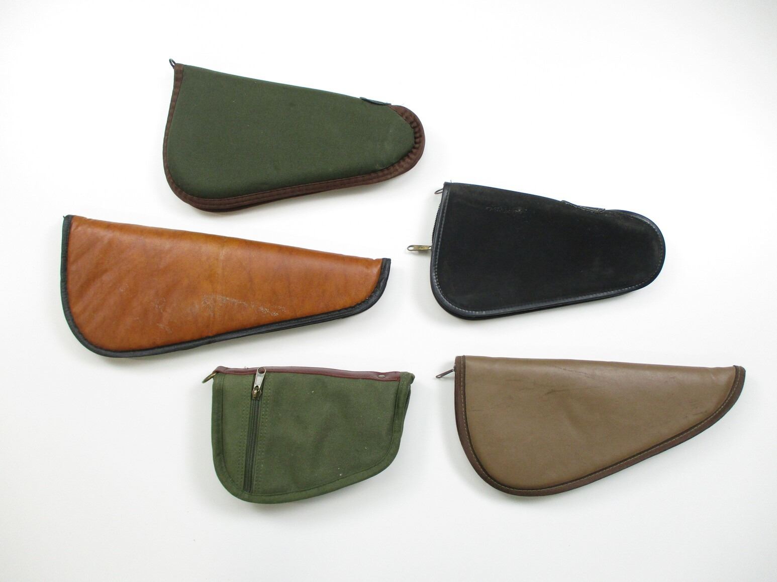 ASSORTED SOFT PISTOL CASES LOT, LOT OF 5, VARIOUS COLOURS, PADDED, OAL VARIES FROM 10" TO 17". SEE PHOTOS.