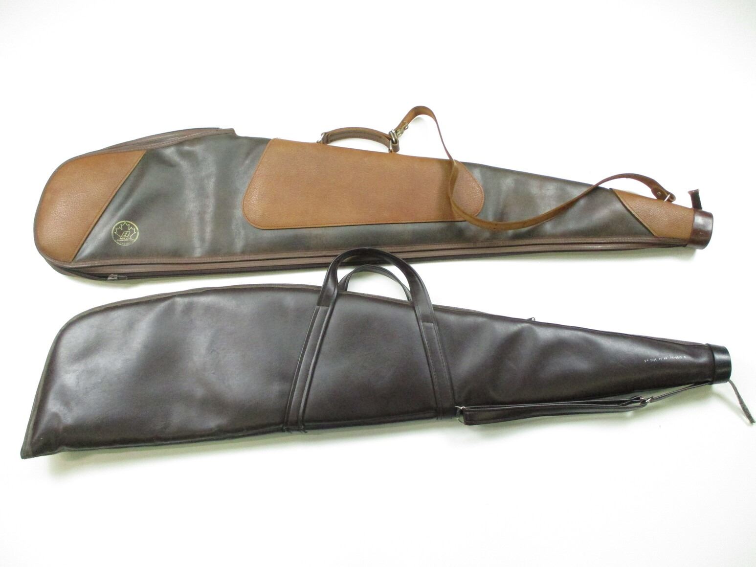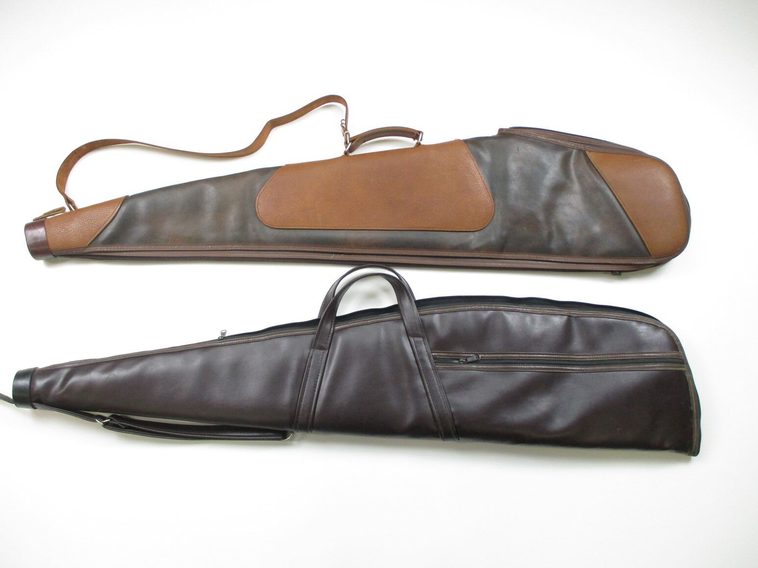 SOFT RIFLE CASE LOT, LOT OF 2: (1) BROWN VINYL, PADDED INTERIOR, OAL APPROX. 46"; (1) DK BROWN & LT. BROWN VINYL, PLUSH INTERIOR, OAL APPROX. 48", SEE PHOTOS