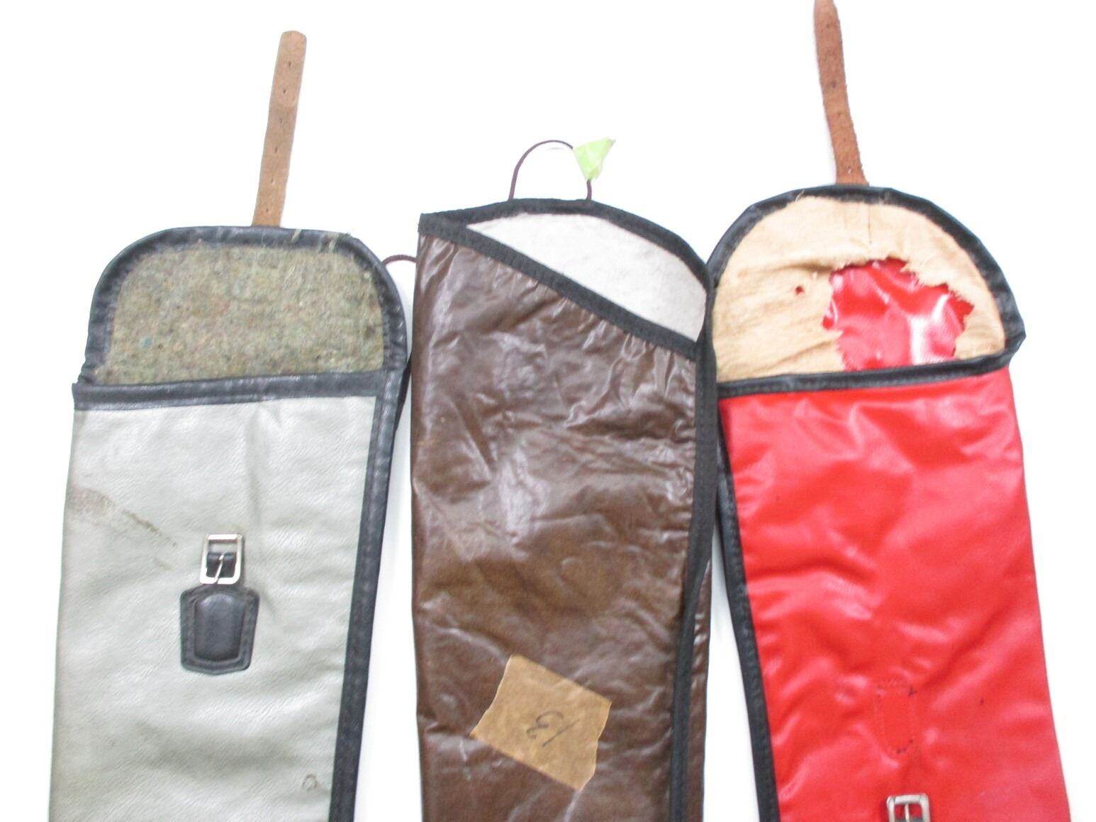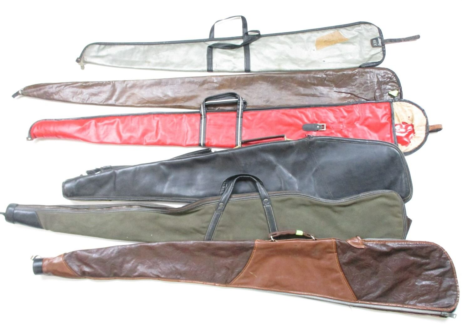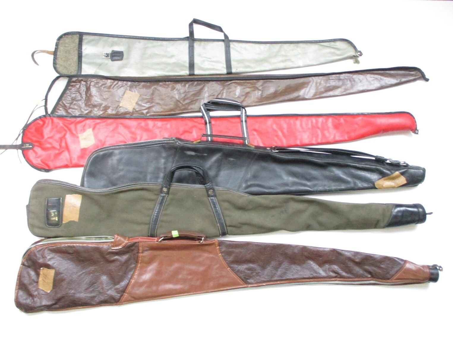 SOFT RIFLE CASE LOT, LOT OF 6: (1) BLACK LEATHER, PLUSH INTERIOR, WEAR & TEAR, OAL APPROX. 45"; (1) BROWNING, GREEN, CORDUROY LINED, WEAR & TEAR, OAL APPROX. 50"; (1) BROWN TOOLED VINYL, FLANNEL LINED, WEAR & TEAR, OAL APPROX. 52"; (1) COOPER LT GREEN VINYL SLEEVE STYLE, PLUSH INTERIOR, SMALL TEAR NEAR END, WEAR & TEAR, OAL APPROX. 40"; (1) BROWN SLEEVE STYLE, NO LINING, HOLE AT END, WEAR & TEAR, OAL APPROX. 50"(1) RED VINYL SLEEVE STYLE, CLOTH LINING RIPPED, WEAR & TEAR, OAL APPROX. 48", SEE PHOTOS