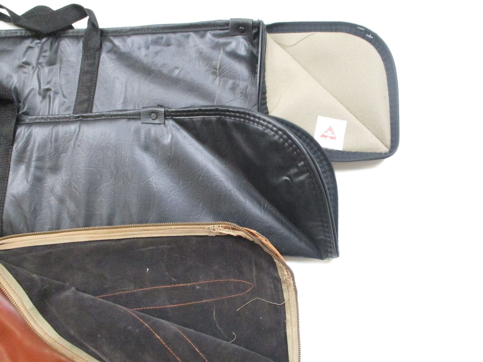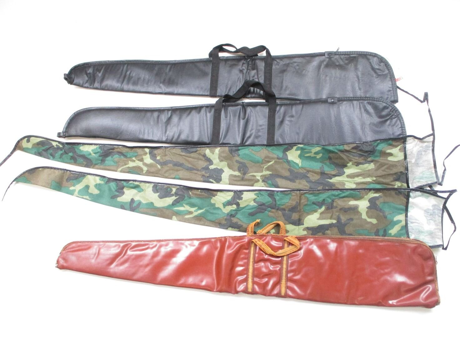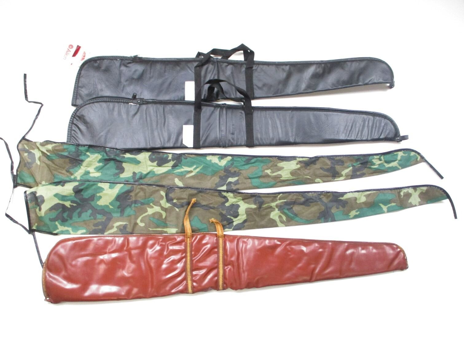 SOFT RIFLE CASE LOT, LOT OF 5: (2) BLACK VINYL SLEEVE STYLE, PADDED INTERIOR, OAL APPROX. 44"; (2) CAMO CLOTH SLEEVE STYLE, NO LINER, OAL APPROX. 50"; (1) BROWN VINYL SLEEVE STYLE, SOFT LINED, BROKEN HANDLE, DAMAGED ZIPPER, WEAR & TEAR, OAL APPROX. 45", SEE PHOTOS