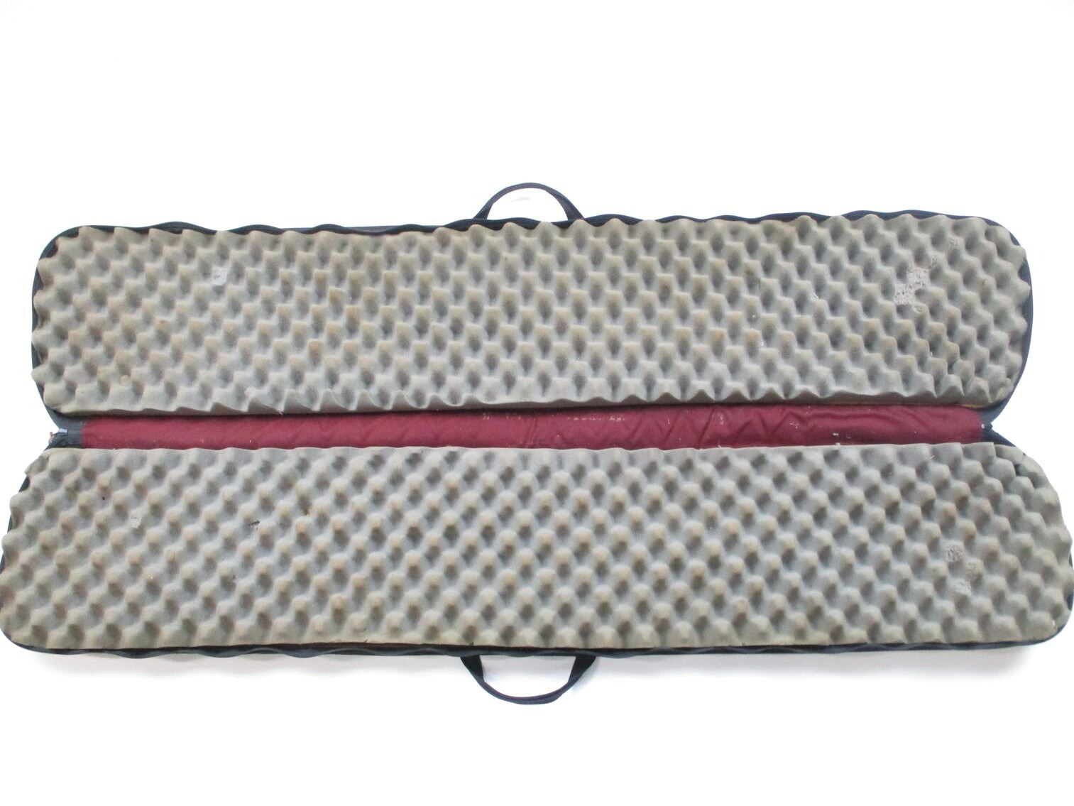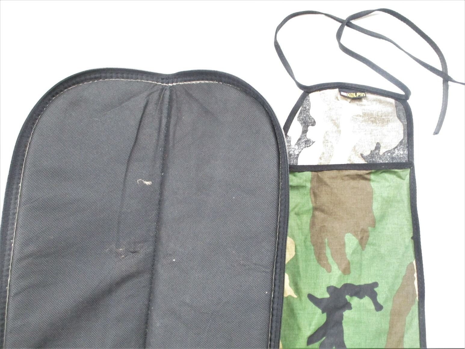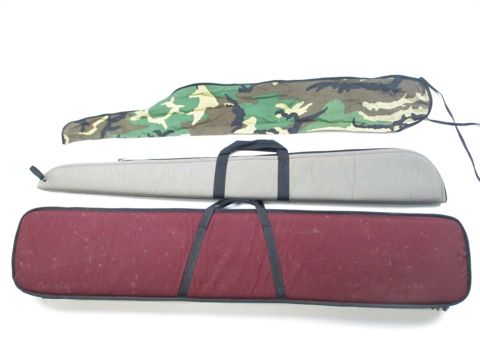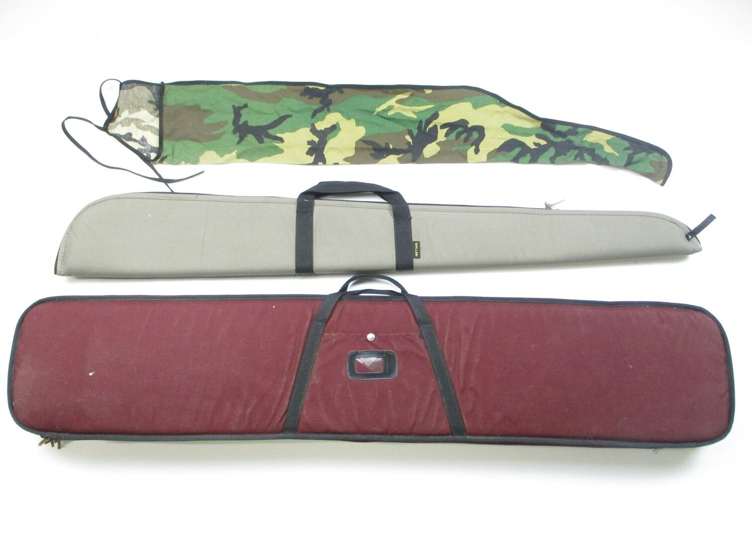 SOFT RIFLE CASE LOT, LOT OF 3: (1) DK. RED CLOTH COVERED HARD SHELL, PADDED INTERIOR, OAL APPROX. 54"; (1) ALLEN KHAKI CANVAS, PADDED INTERIOR, RIP IN LINING, OAL APPROX. 52"; (1) KOLPIN CAMO SLEEVE STYLE, UNLINED, OAL APPROX. 44", SEE PHOTOS