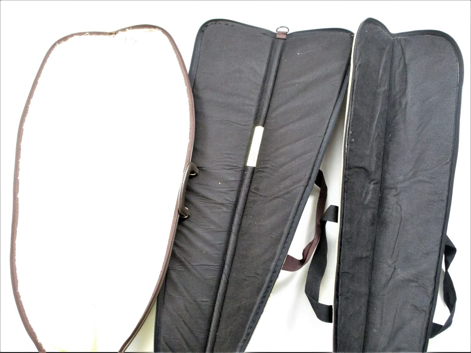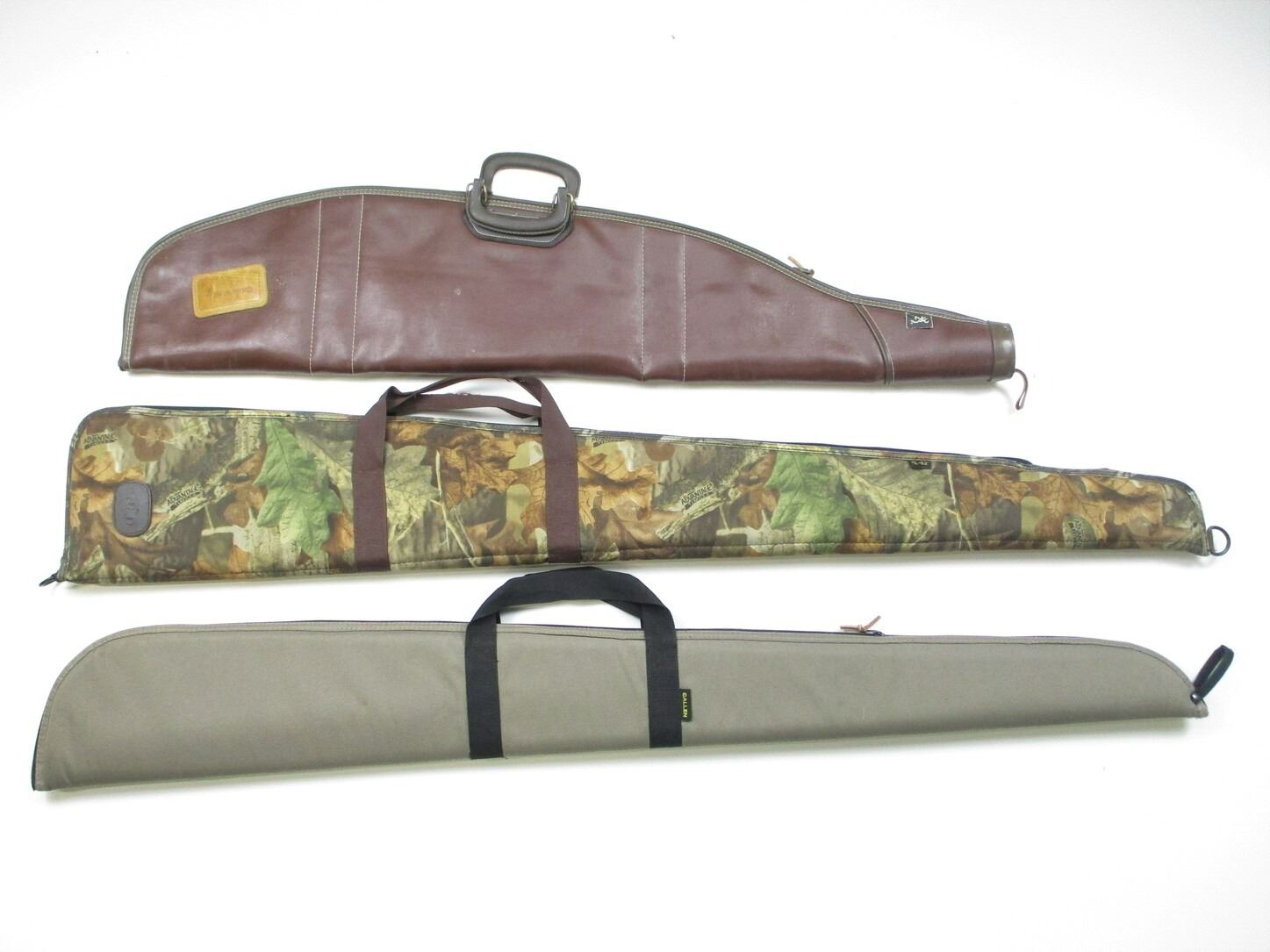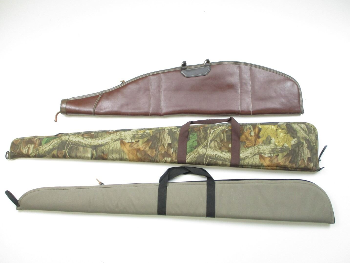SOFT RIFLE CASE LOT, LOT OF 3: (1) BROWNING BROWN VINYL, PLUSH INTERIOR, OAL APPROX. 42"; (1) ALLEN CAMO, PADDED INTERIOR, WEAR ON HANDLES, OAL APPROX. 52"; (1) ALLEN GREY, PADDED INTERIOR, OAL APPROX. 52", SEE PHOTOS