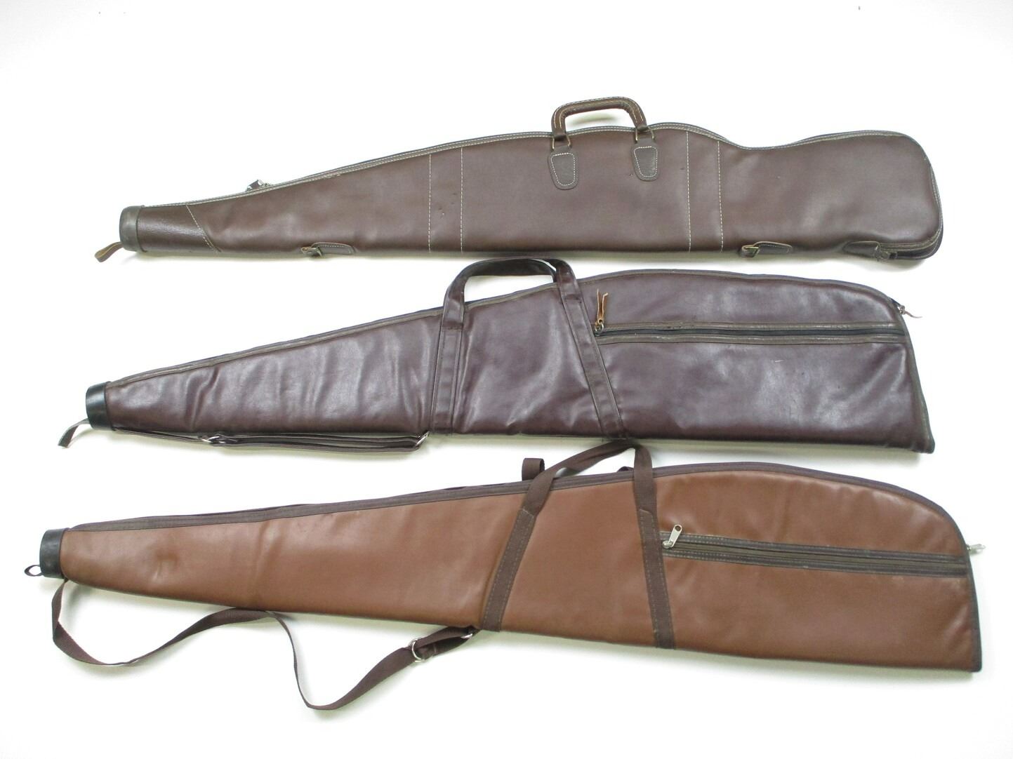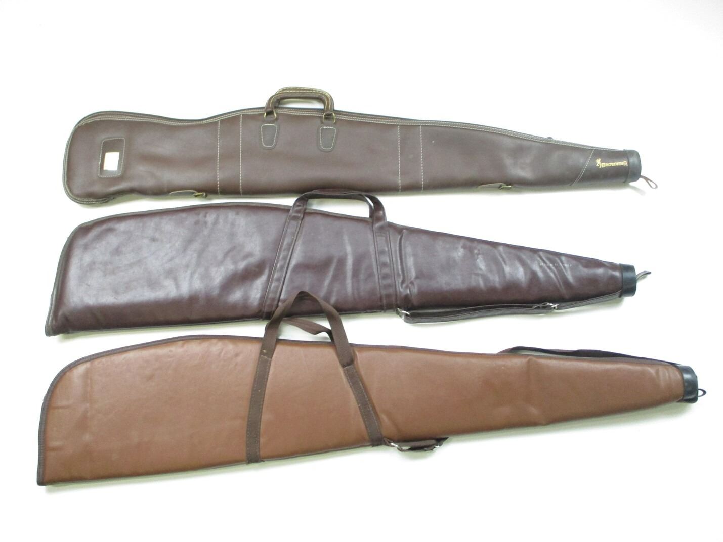 SOFT RIFLE CASE LOT, LOT OF 3: (1) BROWNING BROWN VINYL, FAUX SHEEPSKIN INTERIOR, SOME WEAR & TEAR, OAL APPROX. 46"; (1) BROWN VINYL, PADDED INTERIOR, OAL APPROX. 42"; (1) BROWN VINYL, PADDED INTERIOR, OAL APPROX. 48", SEE PHOTOS