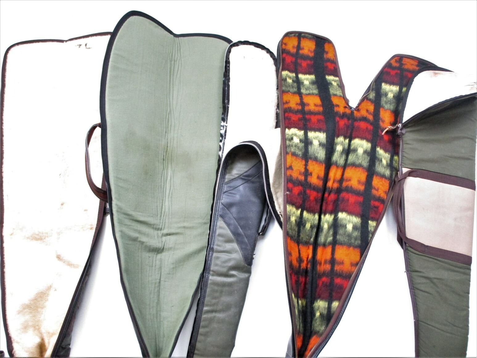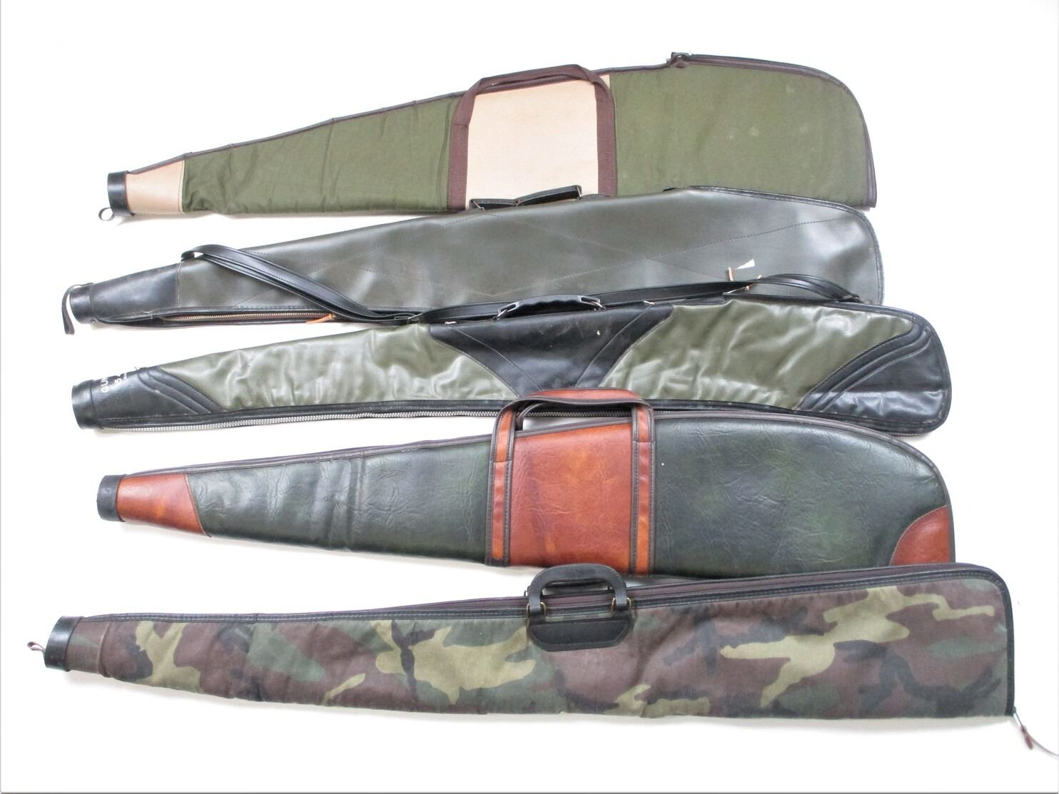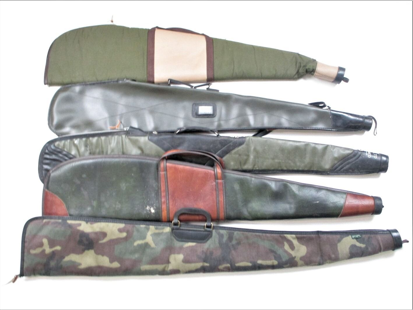 SOFT RIFLE CASE LOT, LOT OF 5: (1) BLACK SHEEP CAMO, PLUSH INTERIOR, OAL APPROX. 48"; (1) GREEN & BROWN VINYL, PADDED INTERIOR, OAL APPROX. 44"; (1) HUNGARIAN GREEN VINYL, PLUSH INTERIOR, WEAR & TEAR, OAL APPROX. 44"; (1) GREEN SLEEVE STYLE, PADDED INTERIOR, WEAR & TEAR, OAL APPROX. 44"; (1) GUNS LTD, GREEN & BLACK, PLUSH INTERIOR, WEAR & TEAR, OAL APPROX. 47", SEE PHOTOS