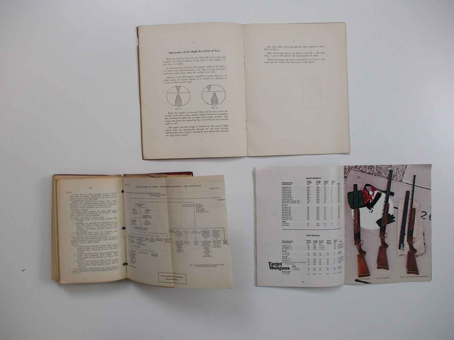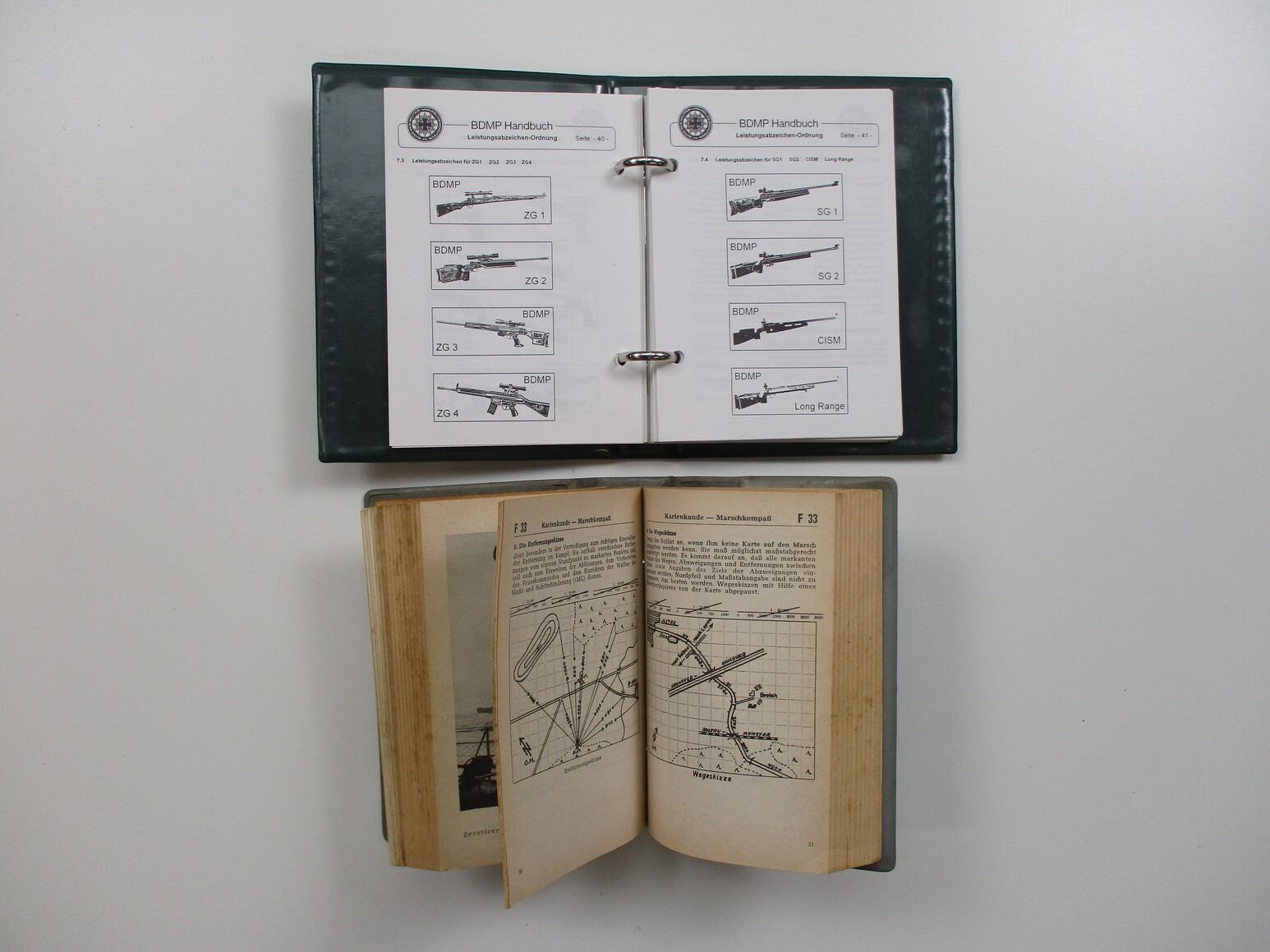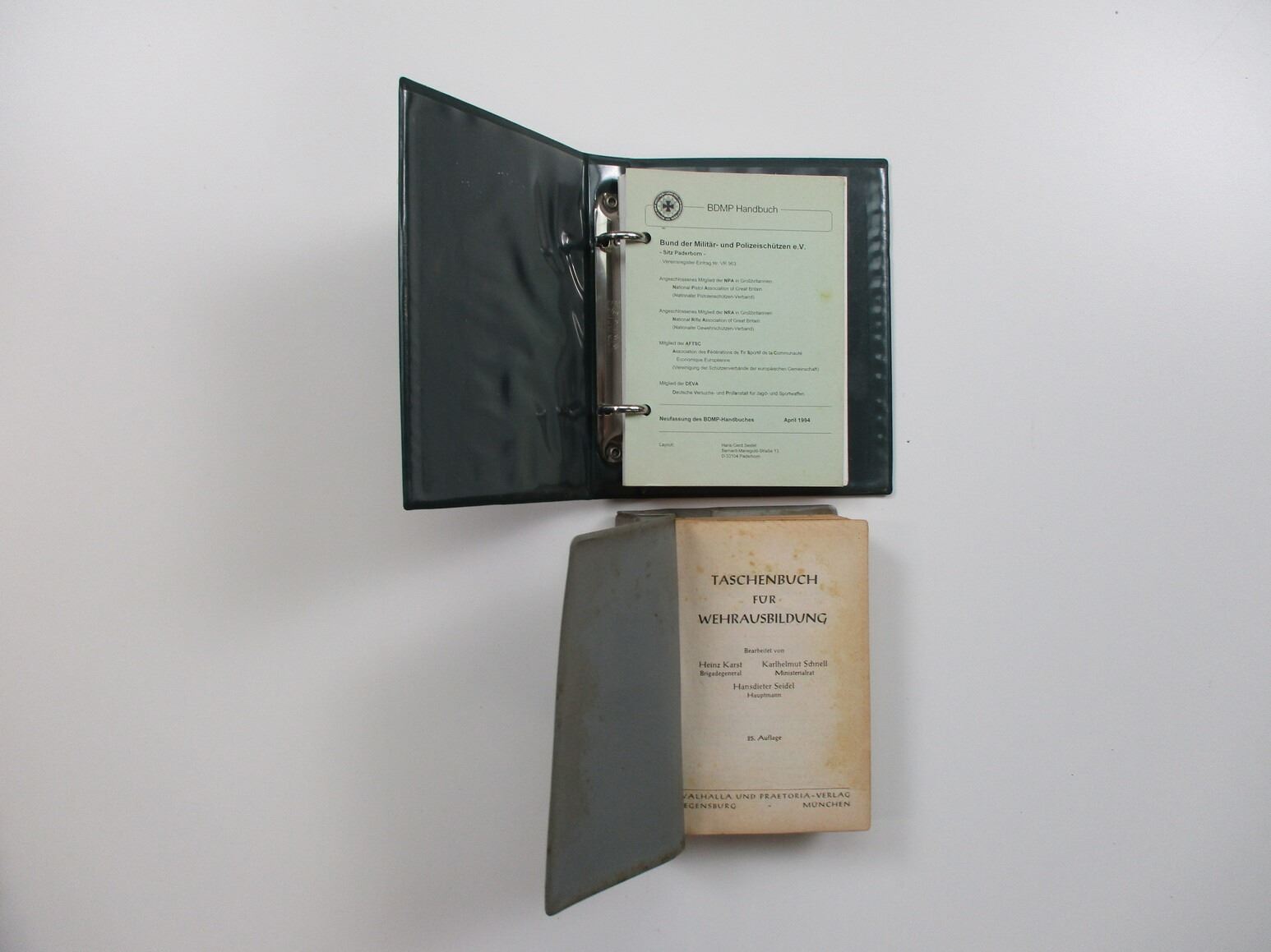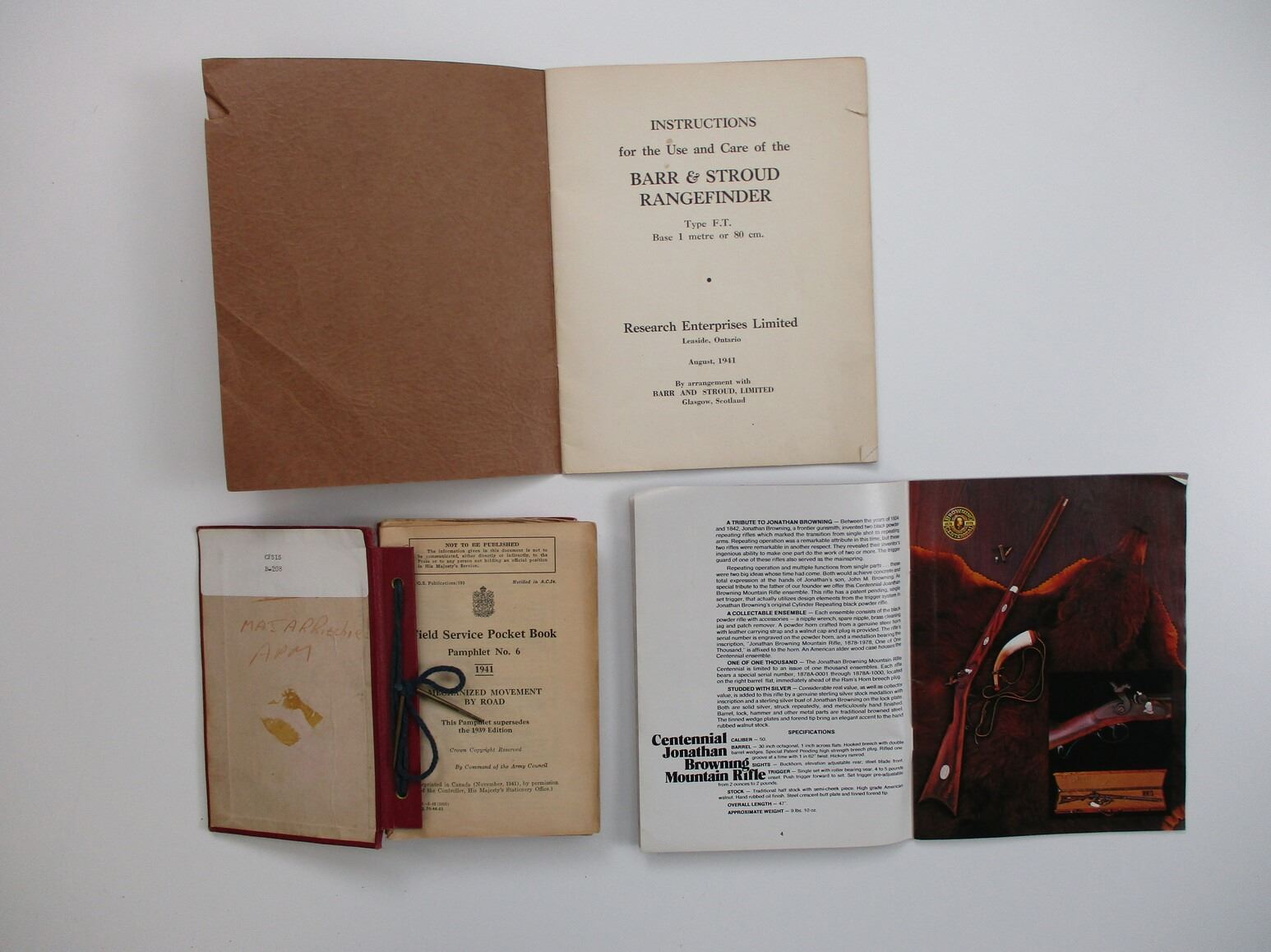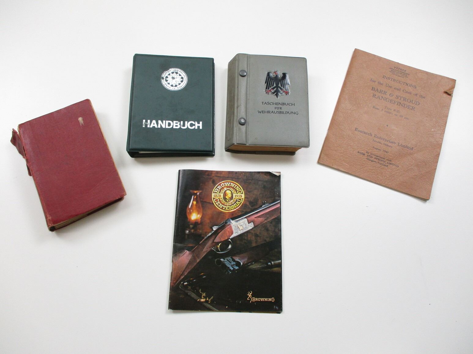 WWII BRITISH MILITARY MANUAL, ETC. BOOK LOT, LOT INCLUDES; (1) WWII FIELD SERVICE BOOK, HARD COVER, DATED 1938, (1) BARR & STROUD MANUAL, DATED 1941, (2) GERMAN MODERN MILITARY POLICE MANUALS, ETC. SEE PHOTOS.