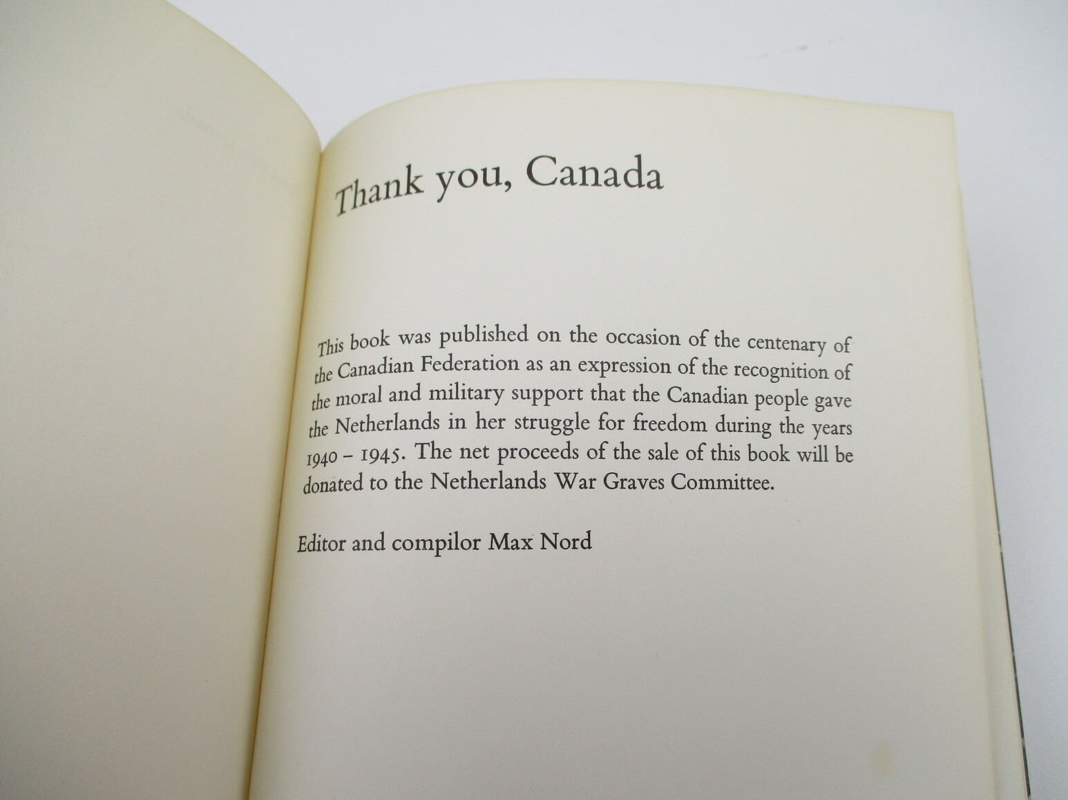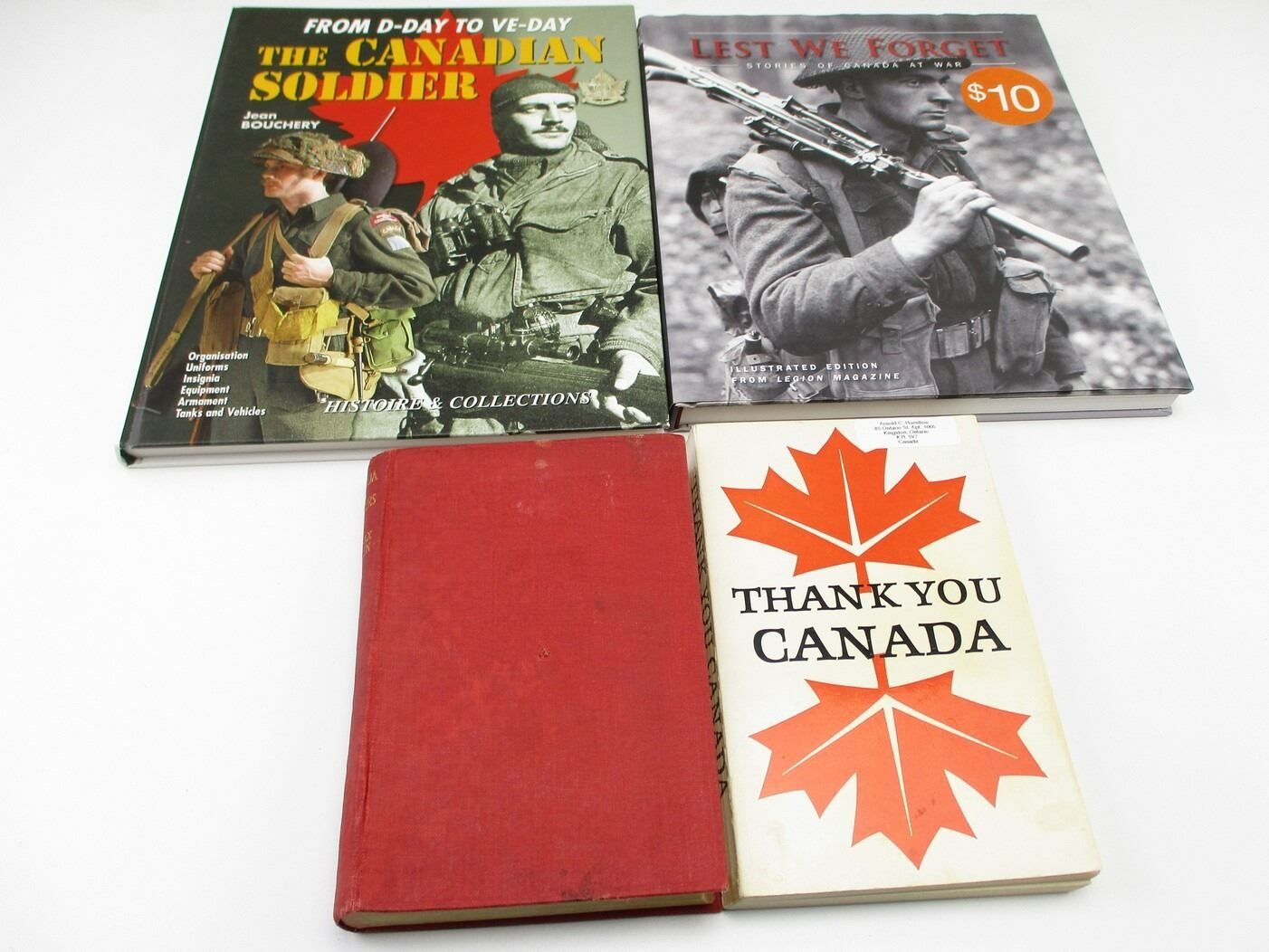 ASSORTED MILITARY BOOK LOT, LOT INCLUDES: (1) " THE CANADIAN SOLDIER IN NORTH-WEST EUROPE 1944-45" BY JEAN BOUCHERY, 2003, ISBN 9782913903517, (1) "LEST WE FORGET: STORIES OF CANADA AT WAR" PUBLISHED BY PROSPERO BOOKS, 2008, (1) "CANADA IN FLANDERS: THE OFFICIAL STORY OF THE CANADIAN EXPEDITIONARY FORCE" VOL. 1 BY SIR MAX AITKEN, 1916, (1) " THANK YOU CANADA", WRITTEN BY QUEEN JULIANA OF THE NETHERLANDS IN HONOUR OF CANADA'S CENTENNIAL IN 1967, SEE PHOTOS