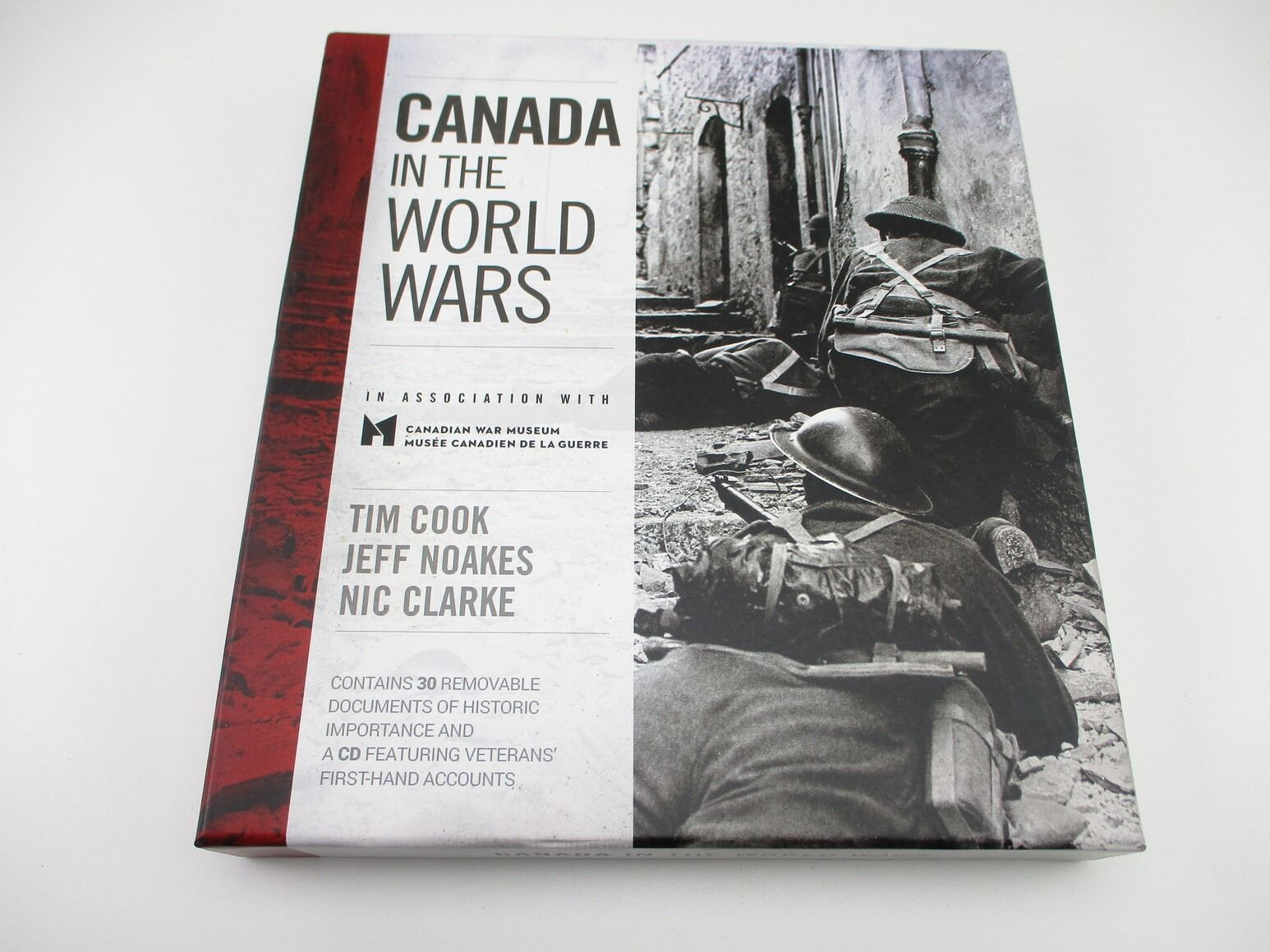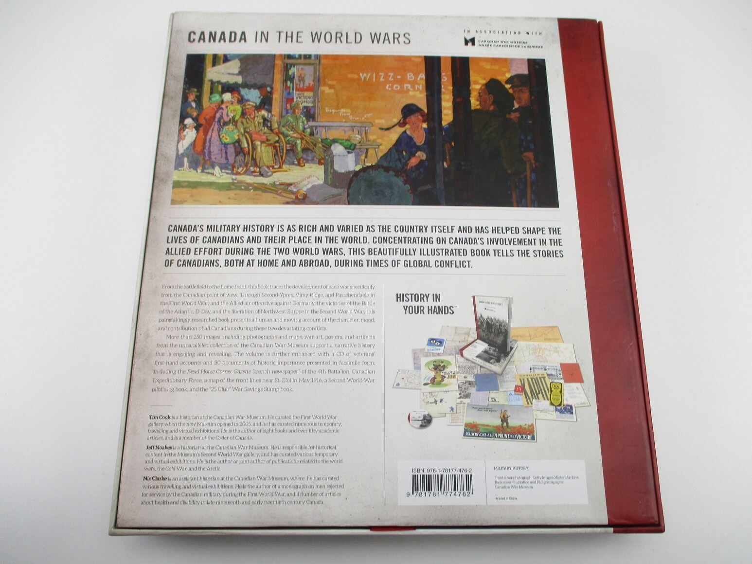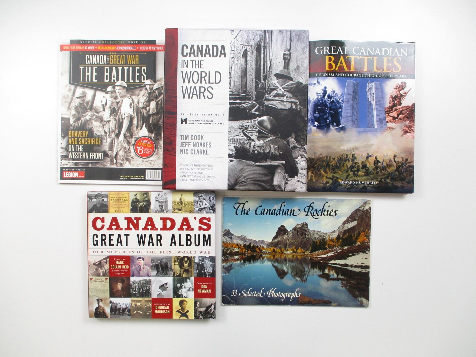 ASSORTED MILITARY BOOK LOT, LOT INCLUDES: (1) " CANADA IN THE WORLD WARS" BY TIM COOK, JEFF NOAKES & NIC CLARKE, IN ORIGINAL BOX WITH CD OF VETERANS' ACCOUNTS & REMOVABLE DOCUMENTS, ISBN 9781781774762, (1) GREAT CANADIAN BATTLES: HEROISM AND COURAGE THROUGH THE YEARS" BY EDWARD HUMPHREYS, 2008, ISBN 9781841939629, (1) " CANADA'S GREAT WAR ALBUM: OUR MEMORIES OF THE FIRST WORLD WAR" EDITED BY MARK COLLLIN REID, 2014, ISBN 9781443420150, (1) " THE CANADIAN ROCKIES: 33 SELECTED PHOTOGRAPHS", (1) CANADA AND THE GREAT WAR: THE BATTLES" PUBLISHED BY LEGION MAGAZINE, SEE PHOTOS