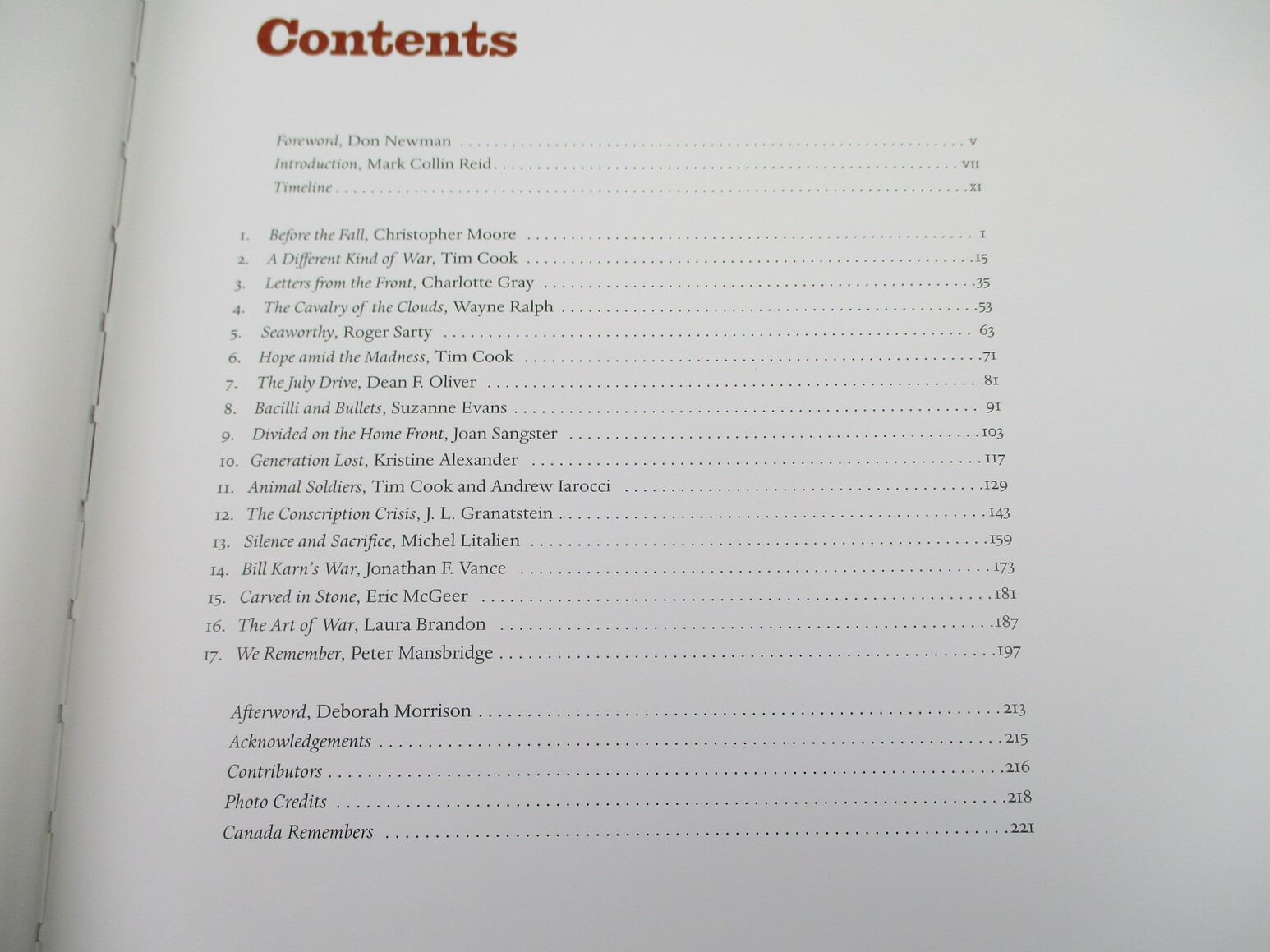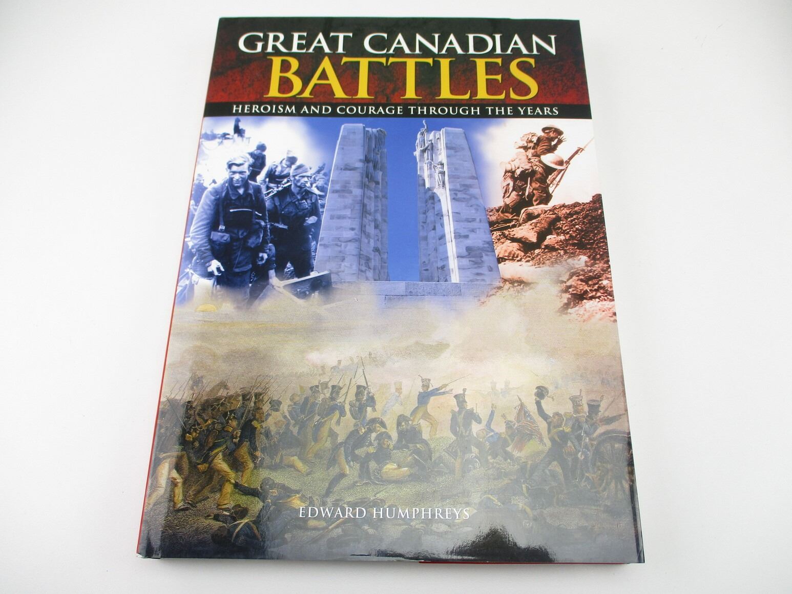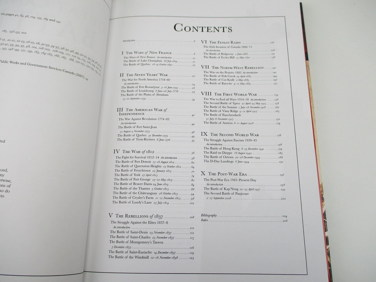 ASSORTED MILITARY BOOK LOT, LOT INCLUDES: (1) " CANADA IN THE WORLD WARS" BY TIM COOK, JEFF NOAKES & NIC CLARKE, IN ORIGINAL BOX WITH CD OF VETERANS' ACCOUNTS & REMOVABLE DOCUMENTS, ISBN 9781781774762, (1) GREAT CANADIAN BATTLES: HEROISM AND COURAGE THROUGH THE YEARS" BY EDWARD HUMPHREYS, 2008, ISBN 9781841939629, (1) " CANADA'S GREAT WAR ALBUM: OUR MEMORIES OF THE FIRST WORLD WAR" EDITED BY MARK COLLLIN REID, 2014, ISBN 9781443420150, (1) " THE CANADIAN ROCKIES: 33 SELECTED PHOTOGRAPHS", (1) CANADA AND THE GREAT WAR: THE BATTLES" PUBLISHED BY LEGION MAGAZINE, SEE PHOTOS