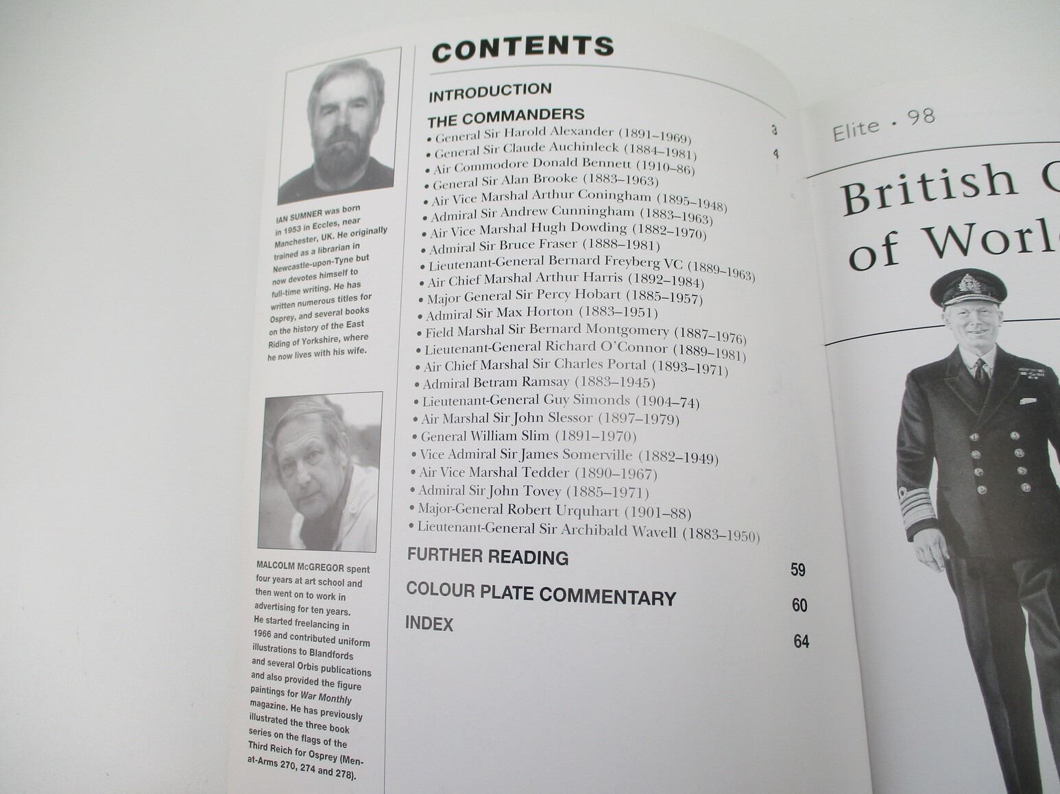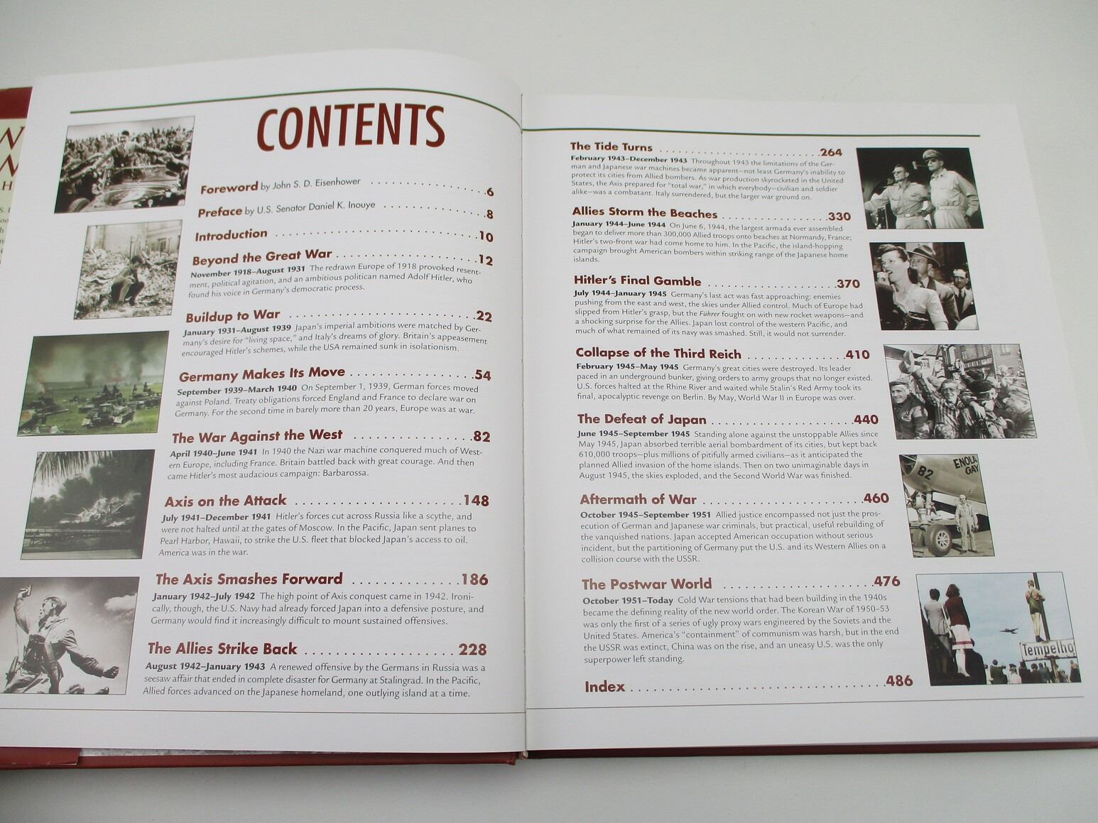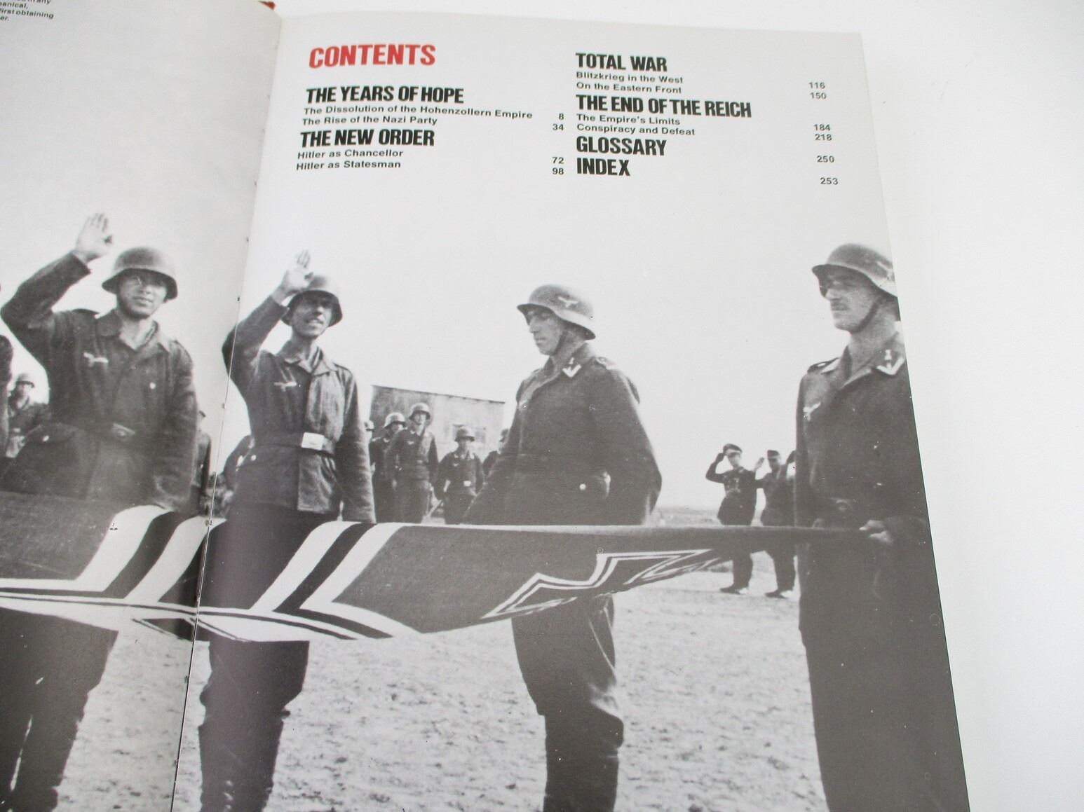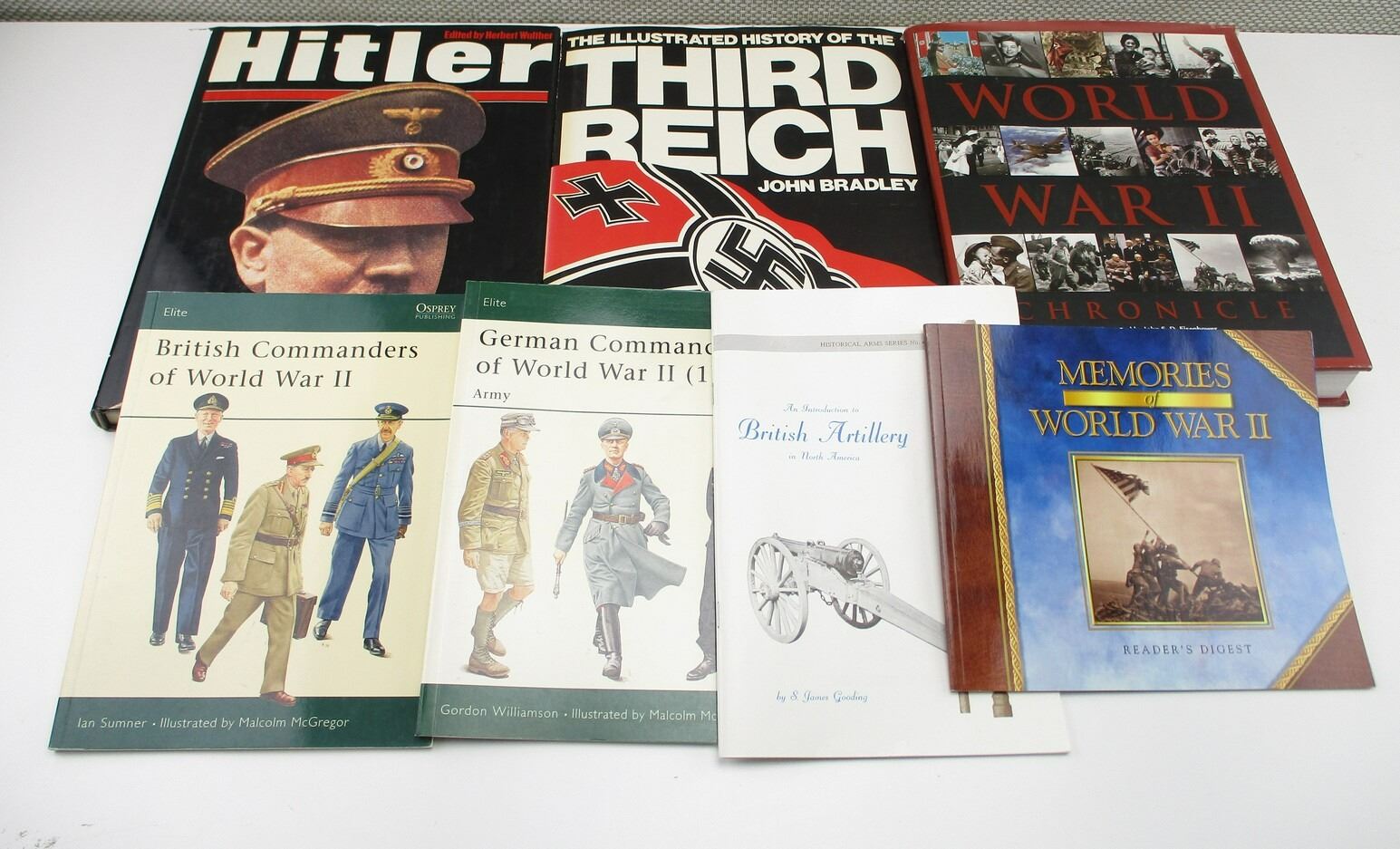 ASSORTED MILITARY BOOK LOT, LOT INCLUDES: (1) " HITLER" EDITED BY HERBERT WALTHER, 1978, (1) "THE ILLUSTRATED HISTORY OF THE THIRD REICH" BY JOHN BRADLEY, 1978, (1) "WORLD WAR II CHRONICLE" PUBLISHED BY LEGACY, SEVERAL WRITERS & CONSULTANTS, 2007, (1) "AN INTRODUCTION TO BRITISH ARTILLERY IN NORTH AMERICA" BY S. JAMES GOODING, #4 OF THE HISTORICAL ARMS SERIES, 1988, (1) "GERMAN COMMANDERS OF WORLD WAR II: ARMY" BY GORDON WILLIAMSON, 2005, (1) "BRITISH COMMANDERS OF WORLD WAR II" BY IAN SUMNER, 2003, (1) "MEMORIES OF WORLD WAR II" PUBLISHED BY READER'S DIGEST, SEE PHOTOS