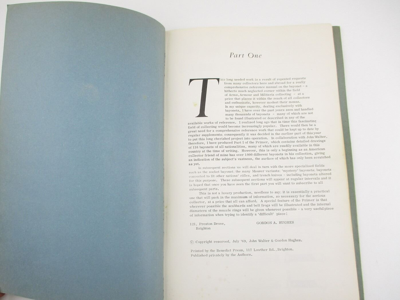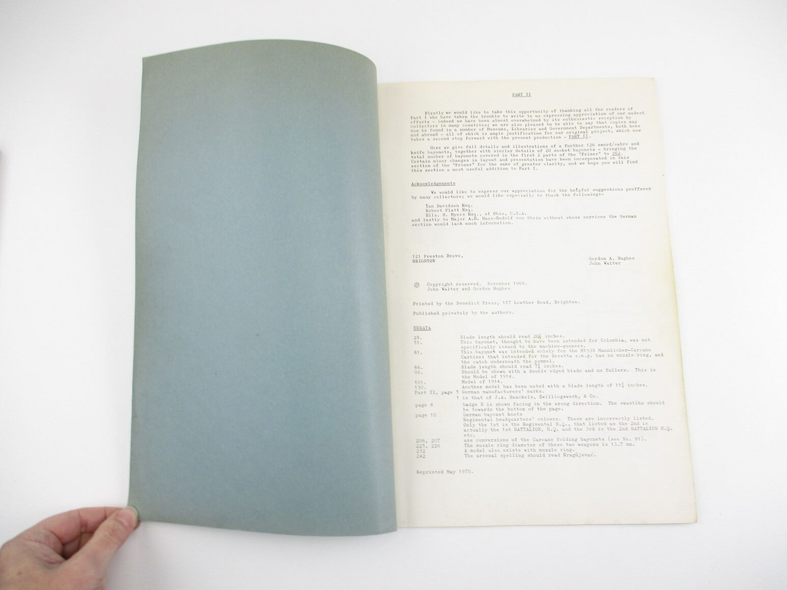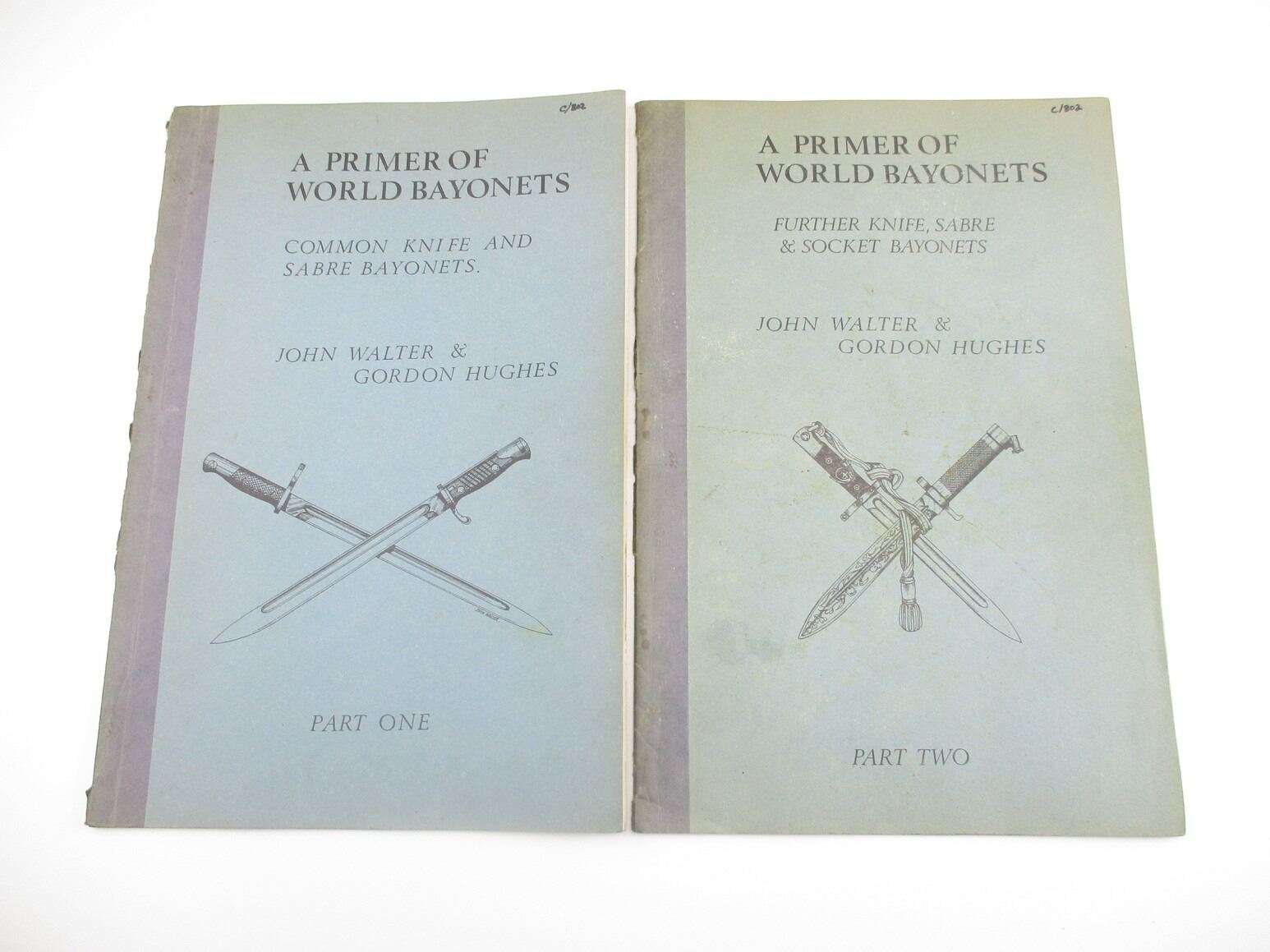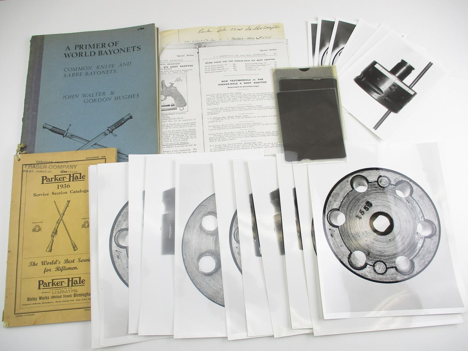 ASSORTED MILITARY BOOK LOT, LOT INCLUDES: (2) "A PRIMER OF WORLD BAYONETS: COMMON KNIFE & SABRE BAYONETS" PARTS 1&2, BY JOHN WALTER & GORDON HUGHES, 1969 & (1) "THE PARKER-HALE 1936 SERVICE SECTION CATALOGUE", NOVEMBER 1935; SEVERAL PHOTOS WITH NEGATIVES OF GUN PARTS, PHOTOCOPIED PAGES FROM PARKER-HALE CATALOGUE, SEE PHOTOS