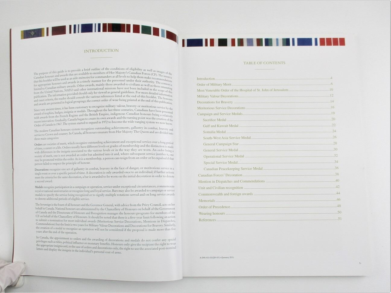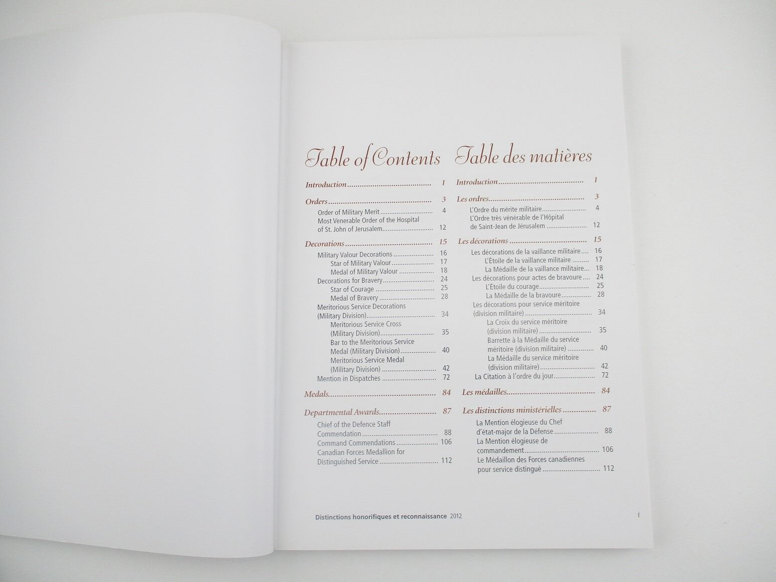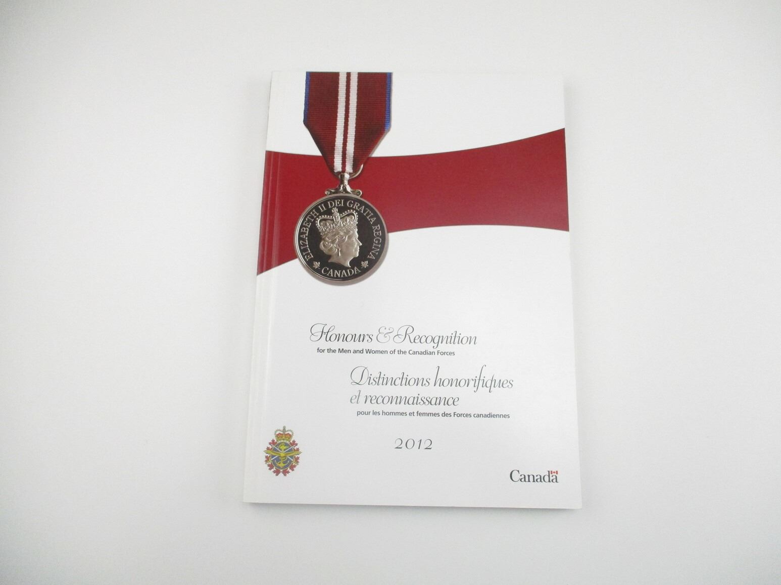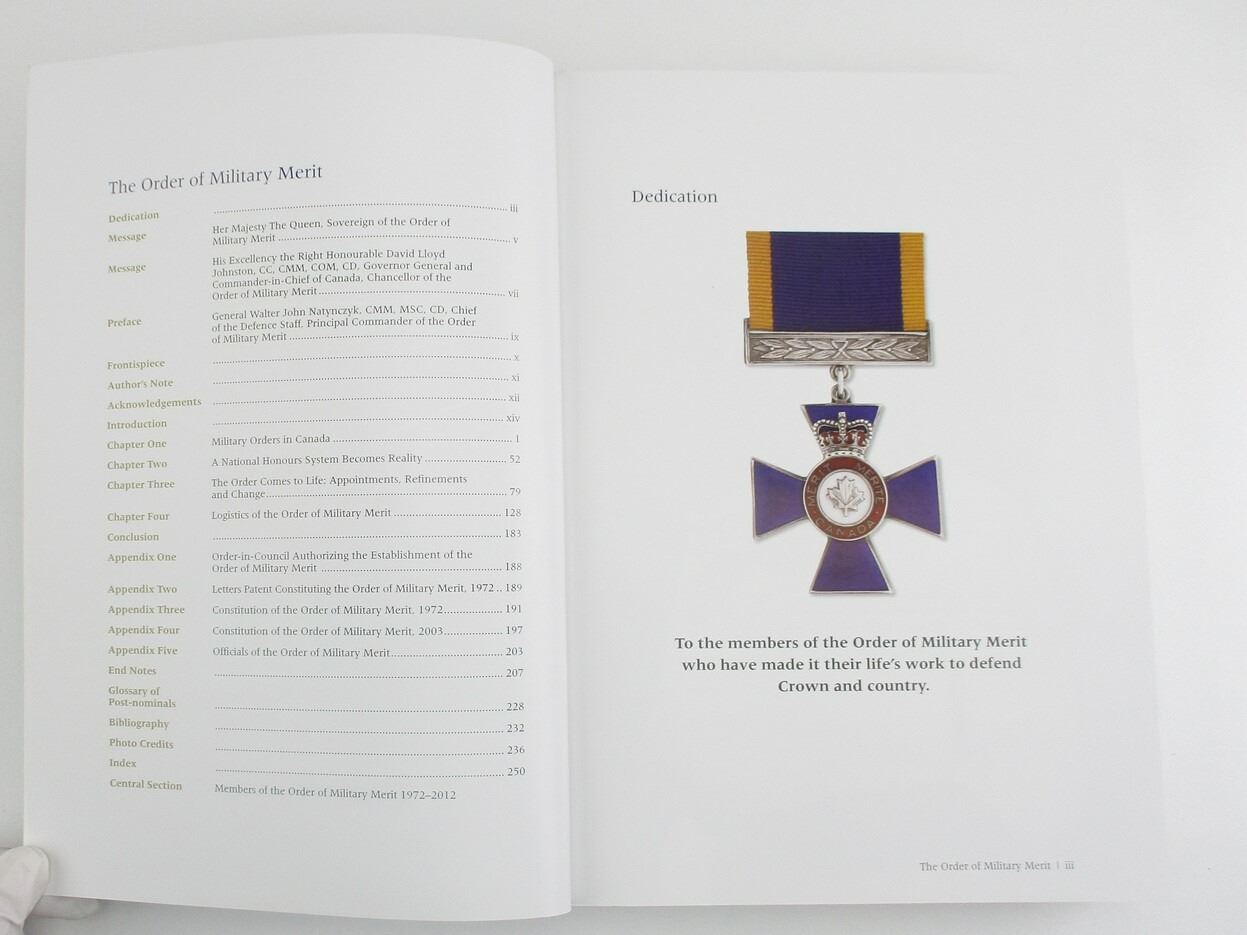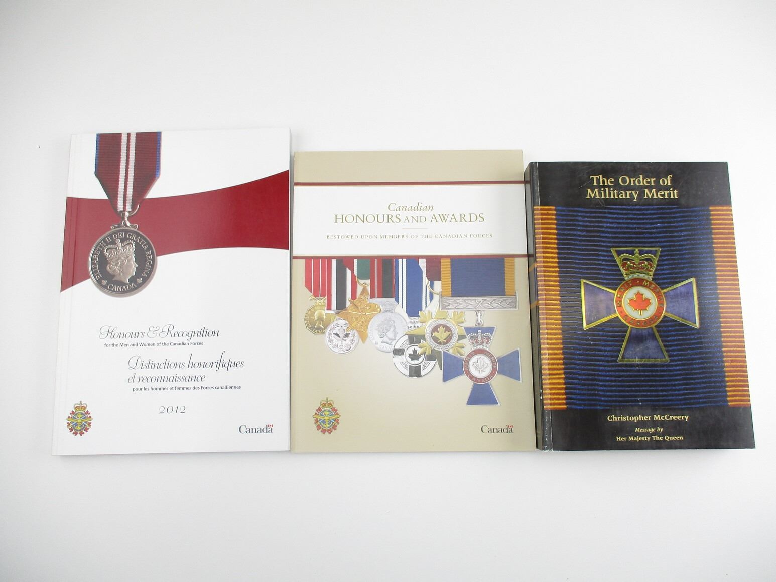 ASSORTED MILITARY BOOK LOT, LOT INCLUDES; (1) "THE ORDER OF MILITARY MERIT" BY CHRISTOPHER MCCREERY, 2012, ENGLISH & FRENCH EDITION, ISBN 9781100542935; (1) "CANADIAN HONOURS AND AWARDS BESTOWED UPON MEMBERS OF THE CANADIAN FORCES" NATIONAL DEFENCE CANADA, 2011 & (1) "HONOURS & RECOGNITION FOR THE MEN AND WOMEN OF THE CANADIAN FORCES" NATIONAL DEFENCE CANADA, 2012, SEE PHOTOS