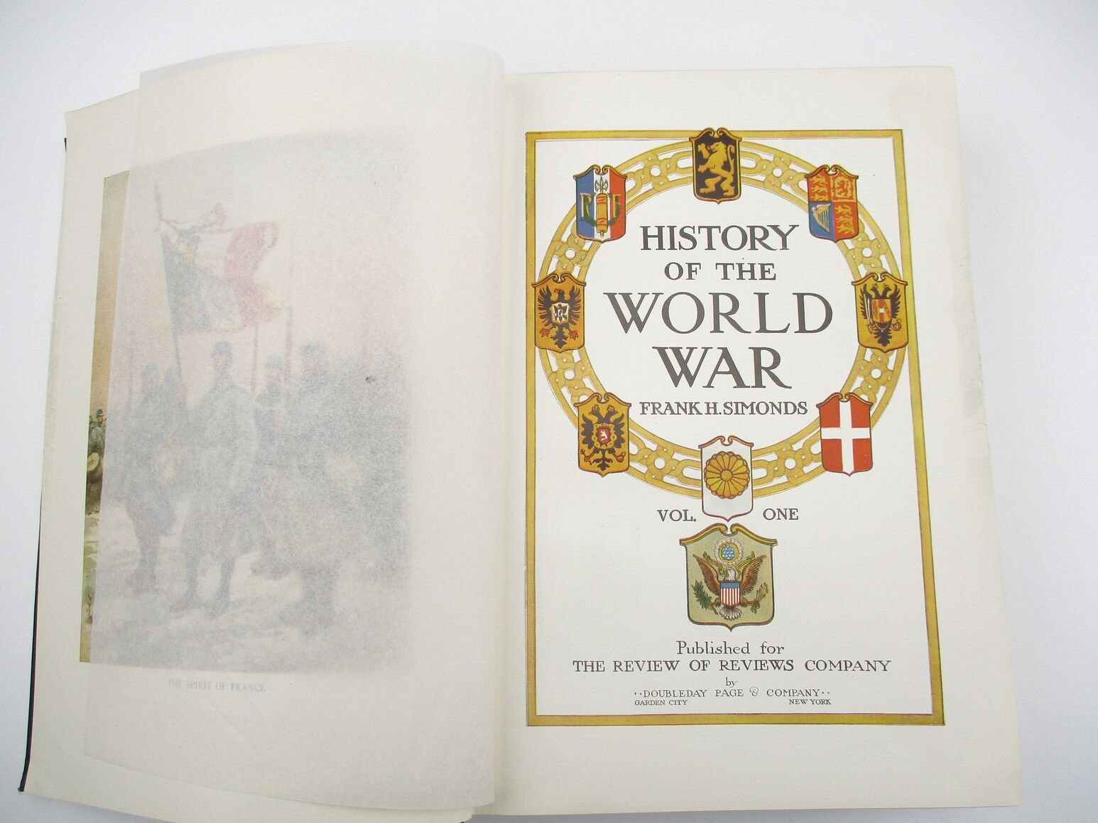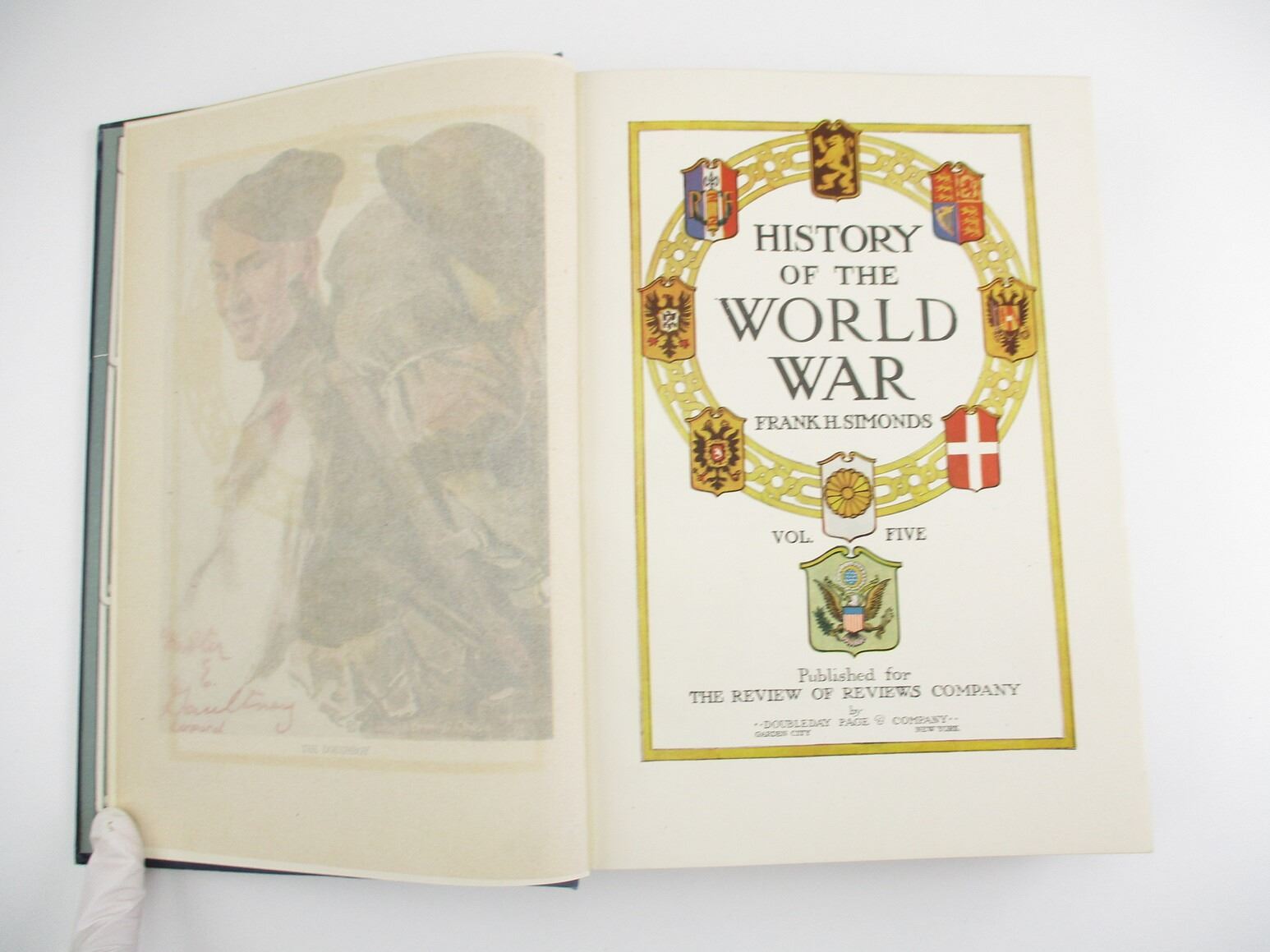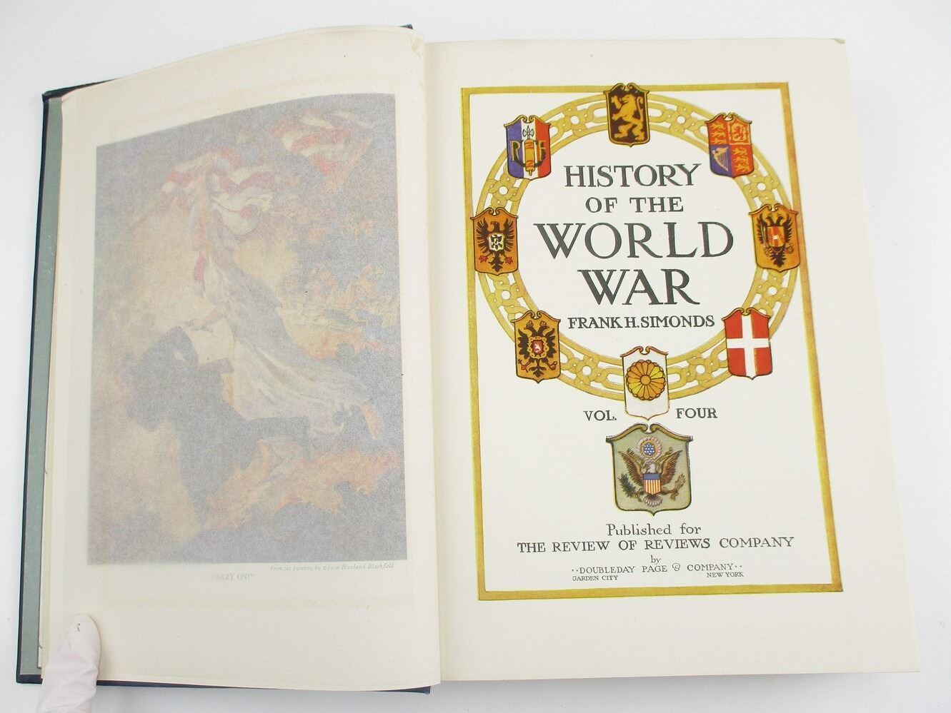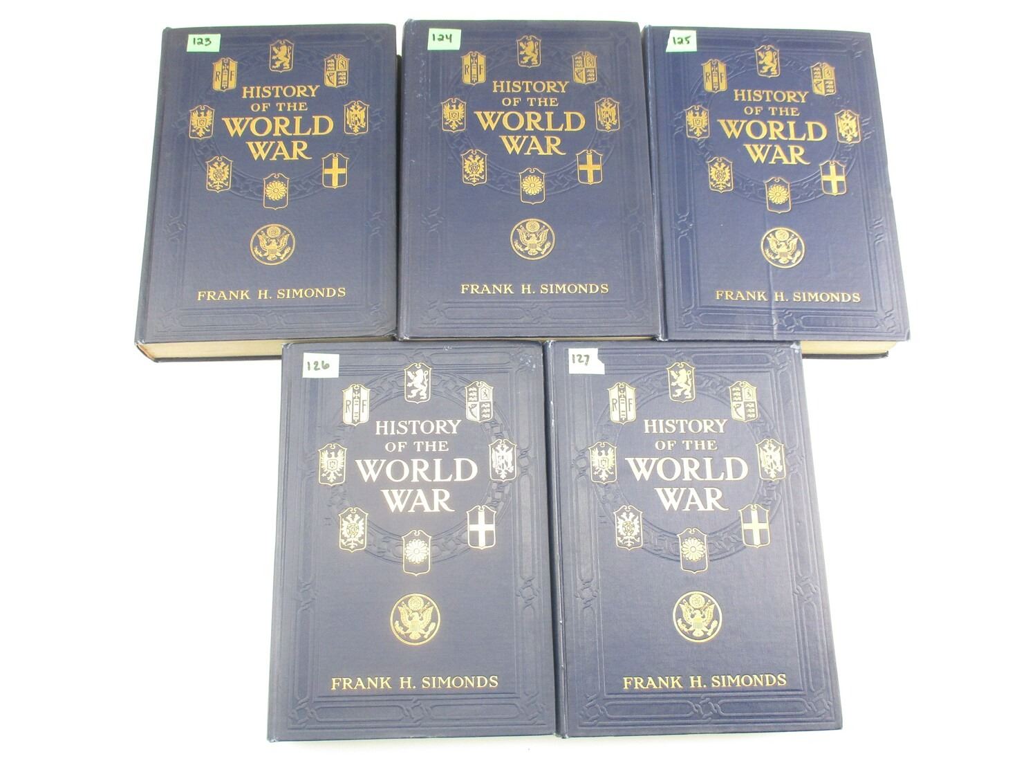 WORLD WAR BOOK LOT, LOT INCLUDES VOLUMES 1 THROUGH 5 OF "HISTORY OF THE WORLD WAR" BY FRANK H. SIMONDS, VOL. 1 COPYRIGHTED IN 1917, VOLUME 5 COPYRIGHTED IN 1920, PUBLISHED BY DOUBLEDAY PAGE & COMPANY, BOOKS WRITTEN IN CLOSE TO REAL TIME WITH W.W.I EVENTS, SEE PHOTOS