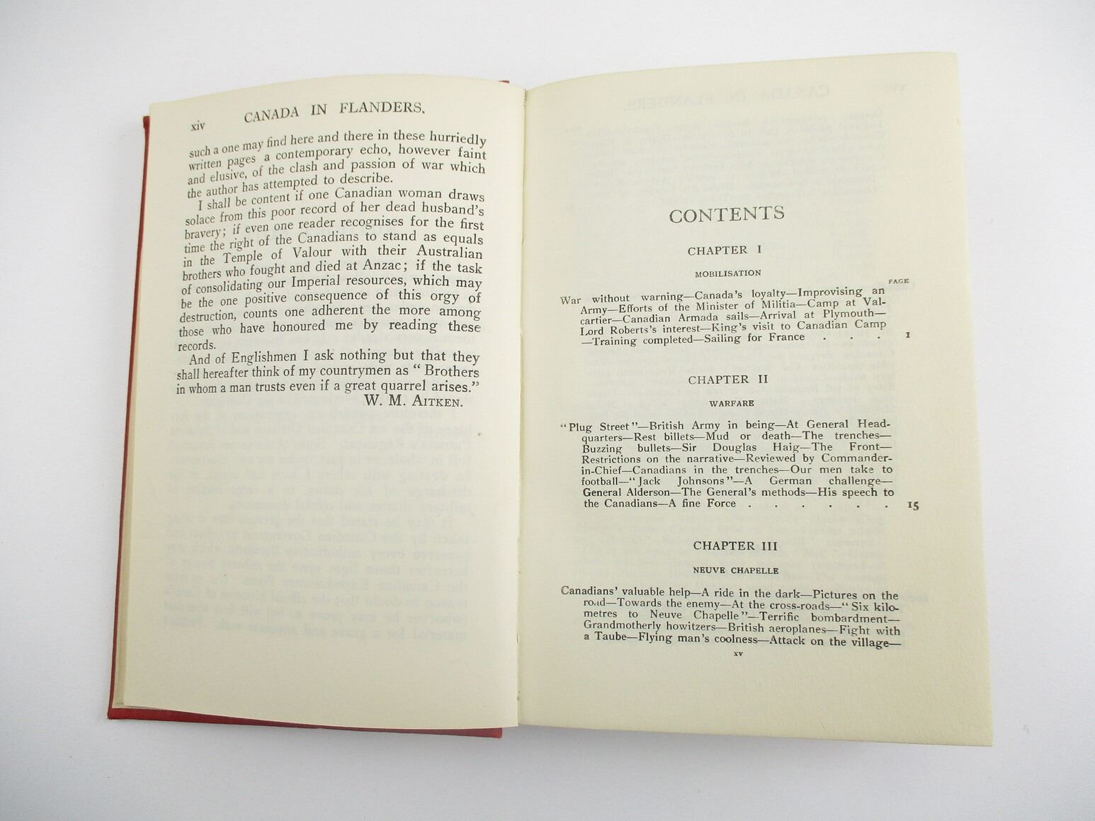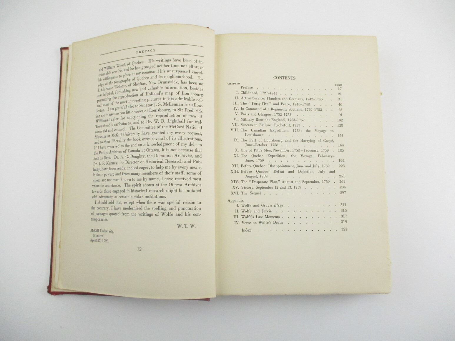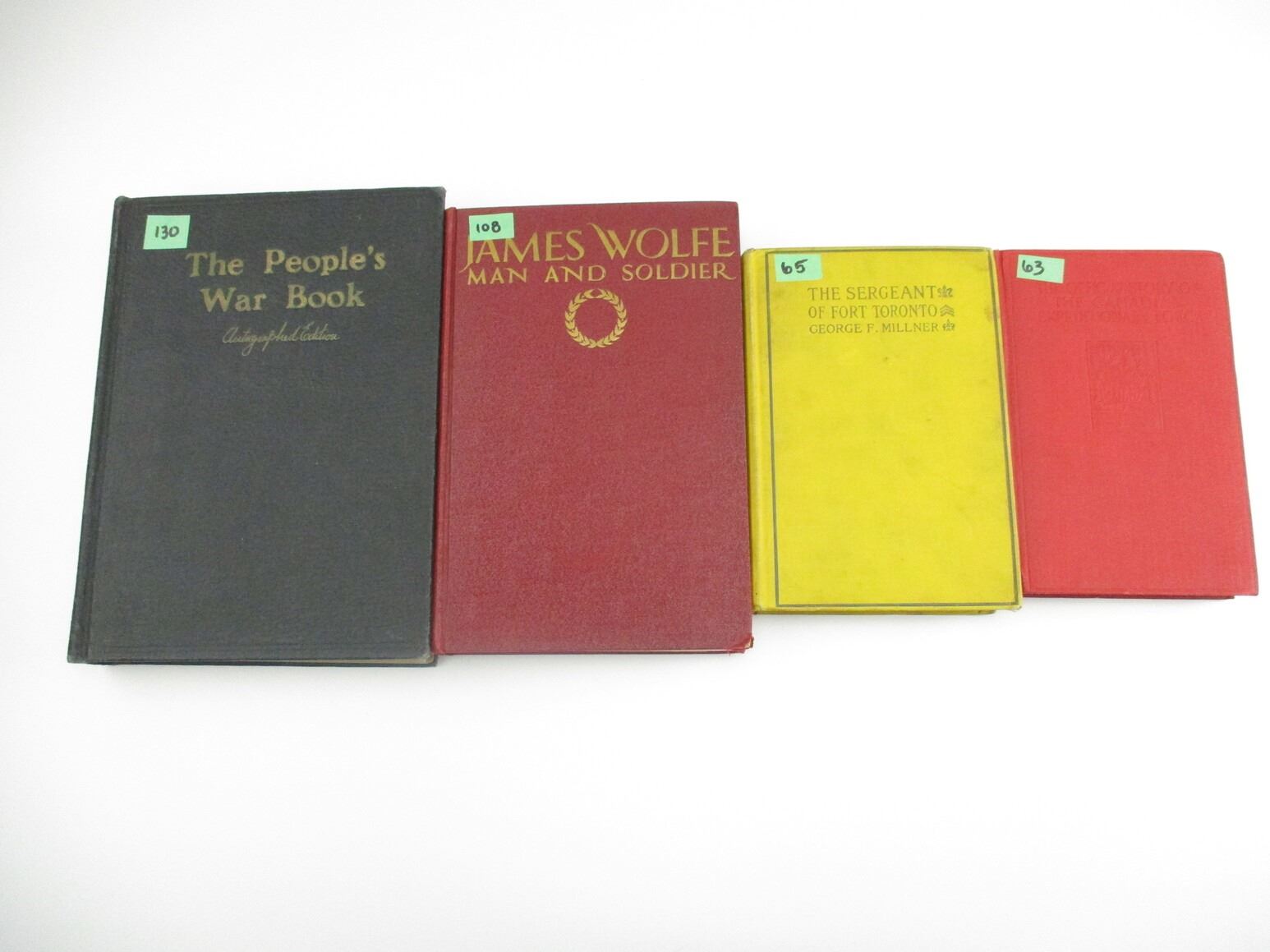 ASSORTED MILITARY BOOK LOT, LOT INCLUDES; (1) "THE SERGEANT OF FORT TORONTO" BY GEORGE F. MILLNER, 1914; (1) "JAMES WOLFE MAN AND SOLDIER" BY W.T. WAUGH, 1928; (1) "CANADA IN FLANDERS" BY SIR MAX AITKEN, 1916 & (1) "THE PEOPLE'S WAR BOOK HISTORY, CYCLOPAEDIA AND CHRONOLOGY OF THE GREAT WORLD WAR AND CANADA'S PART IN THE WAR" BY JAMES MARTIN MILLER, H.S. CANFIELD & W.R. PLEWMAN, 1920, PUBLISHED BY R.C. BARNUM CO., F.B.DICKERSON CO., BETTER FARMING ASS'N & IMPERIAL PUBLISHING CO., SEE PHOTOS