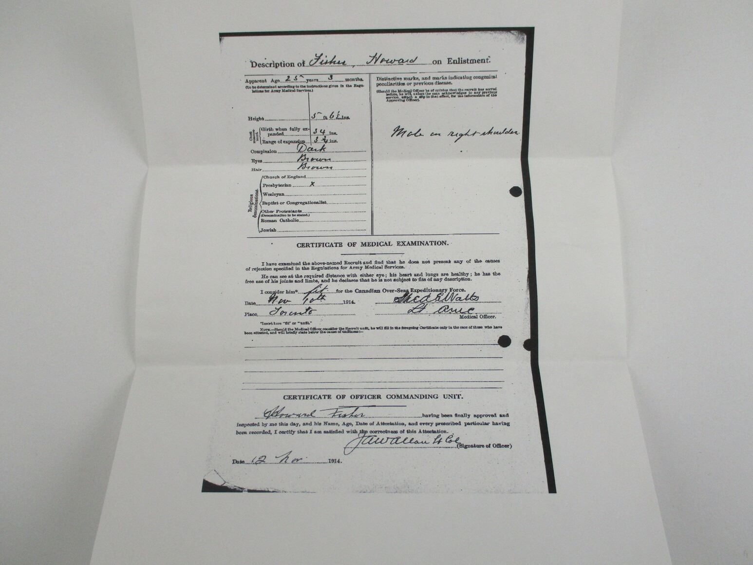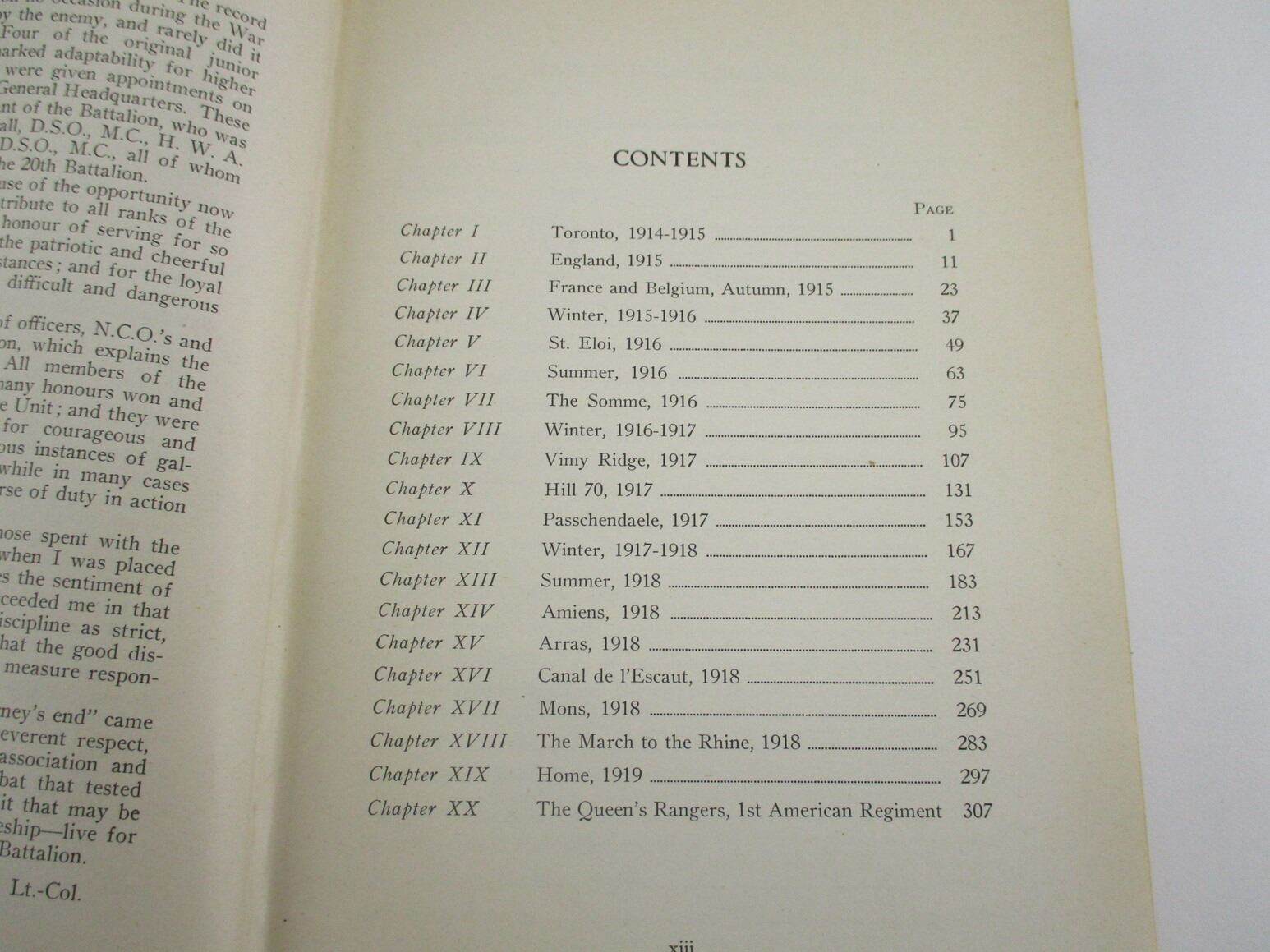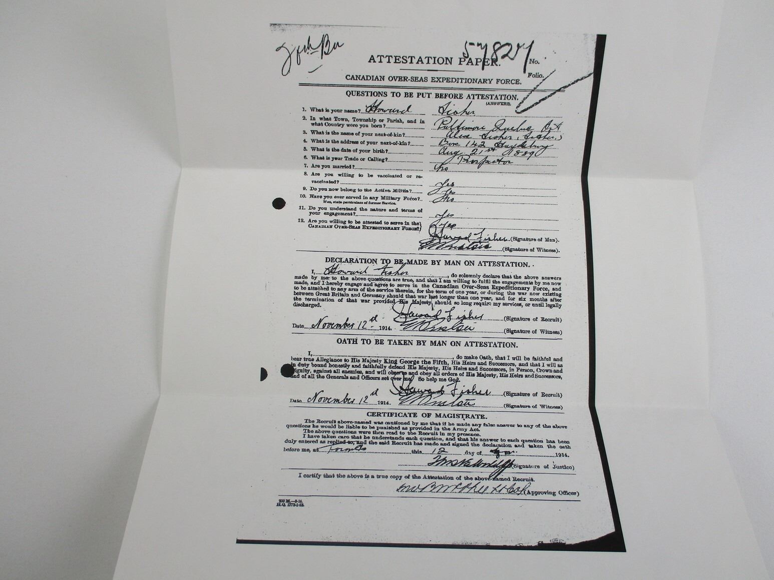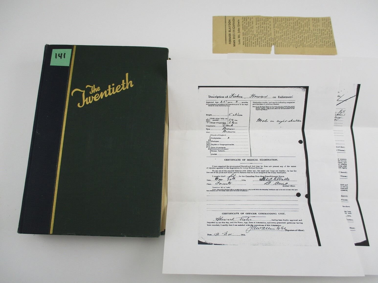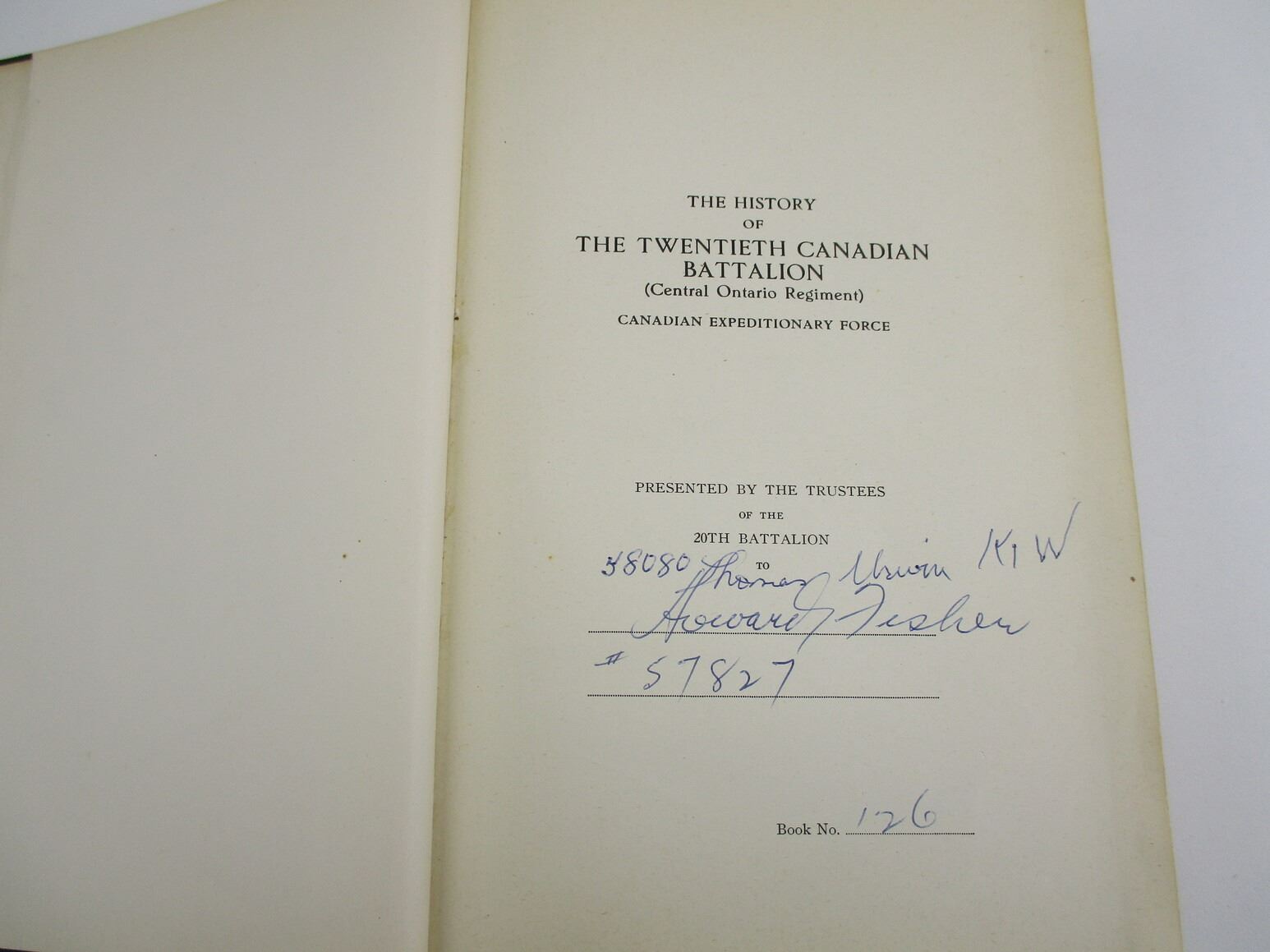 CANADIAN EXPEDITIONARY FORCE BOOK LOT, " THE HISTORY OF THE TWENTIETH CANADIAN BATTALION (CENTRAL ONTARIO REGIMENT) CANADIAN EXPEDITIONARY FORCE" BY MAJOR D.J. CORRIGALL, 1936, SIGNED PRESENTATION TO MEMBER OF THE BATTALION, HOWARD FISHER, BOOK # 126, INCLUDES COPIES OF PERSONAL ENLISTMENT PAPERS, SEE PHOTOS