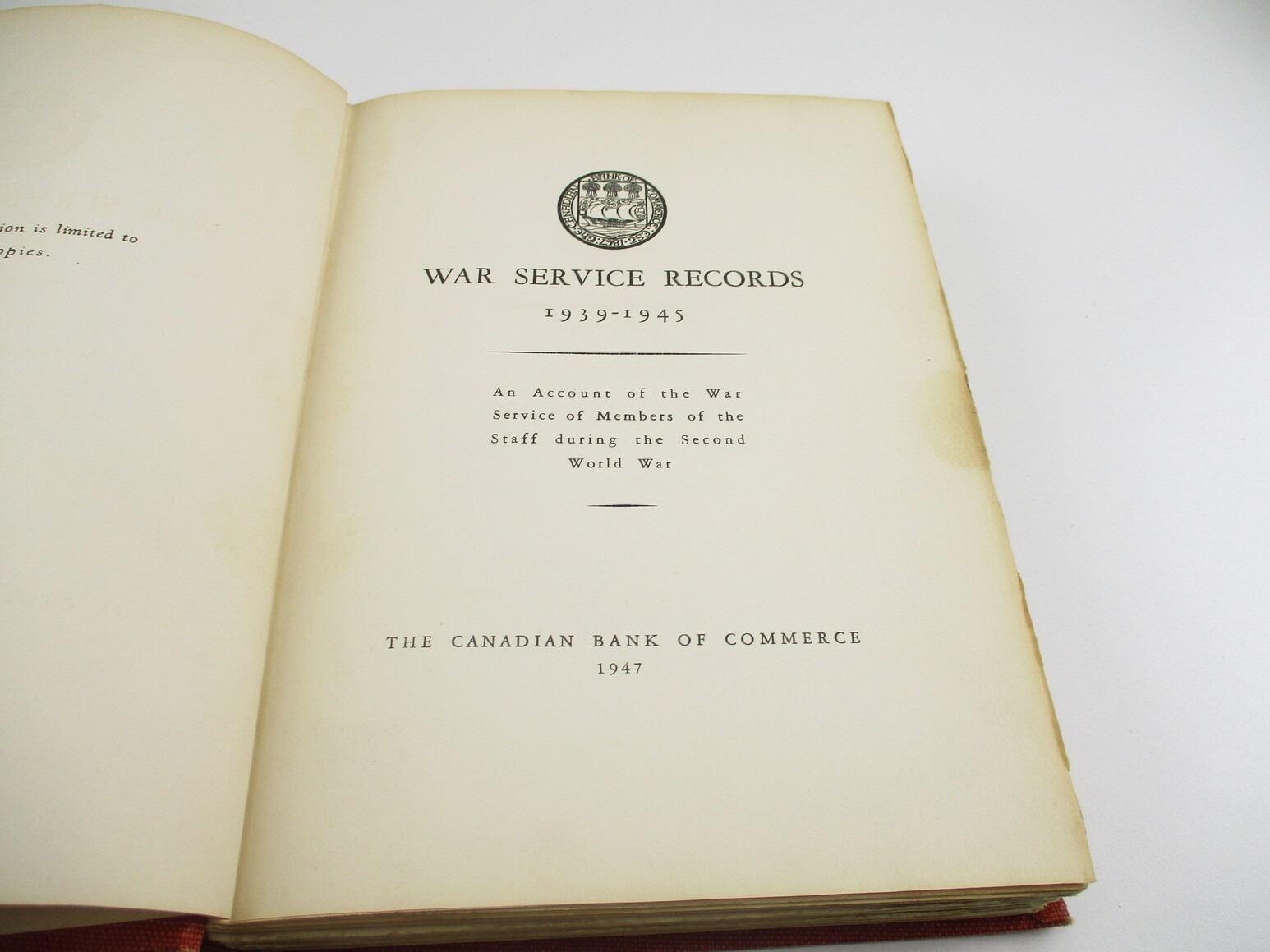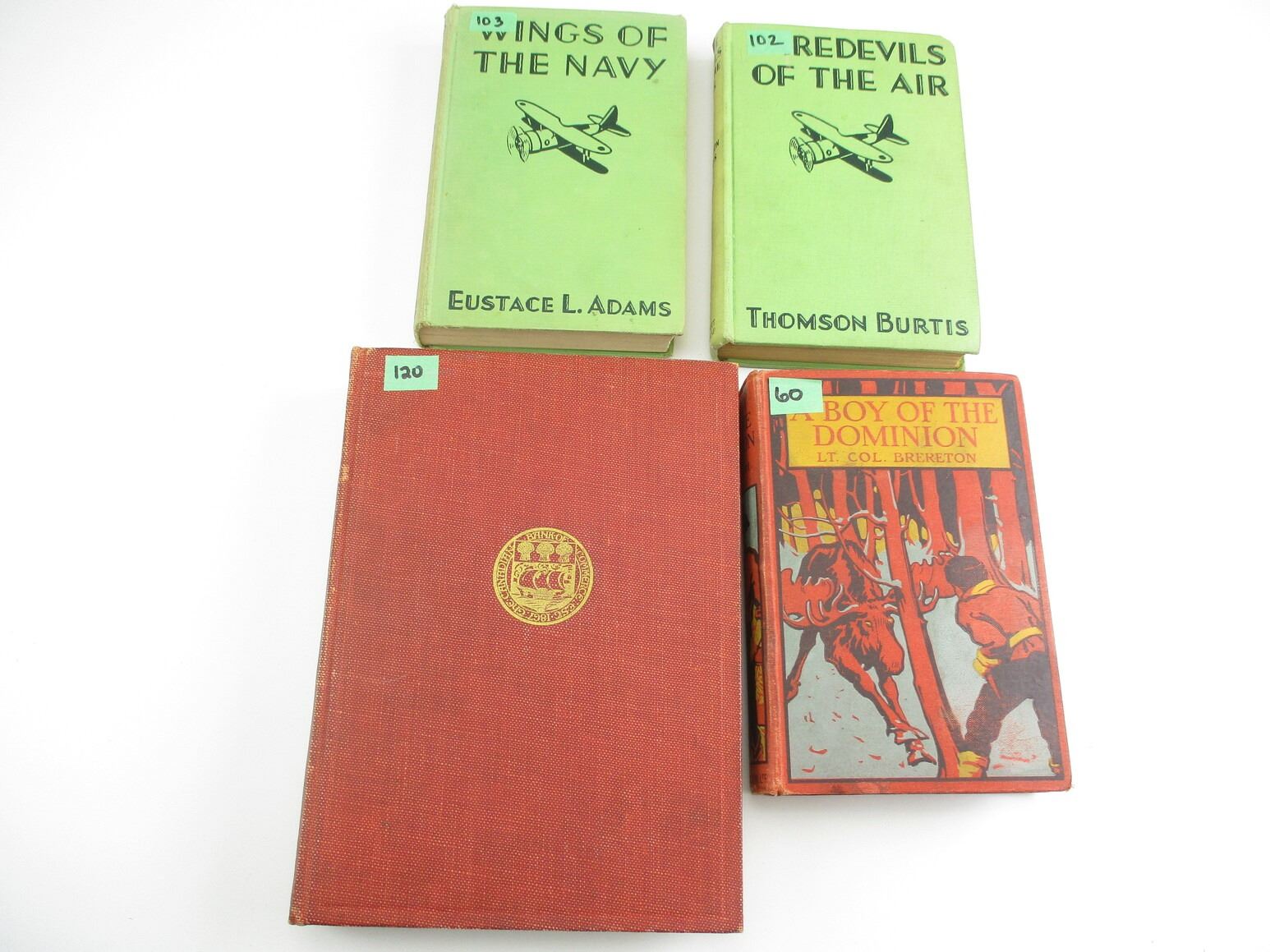 ASSORTED MILITARY BOOK LOT, LOT OF 4: (1) "WAR SERVICE RECORDS 1939-1945" PUBLISHED BY THE CANADIAN BANK OF COMMERCE, 1947; (1) "A BOY OF THE DOMINION" BY LT. COL. BRERETON; (1) "DAREDEVILS OF THE AIR" BY THOMSON BURTIS, 1932; (1) "WINGS OF THE NAVY" BY EUSTACE L. ADAMS, 1936, SEE PHOTOS