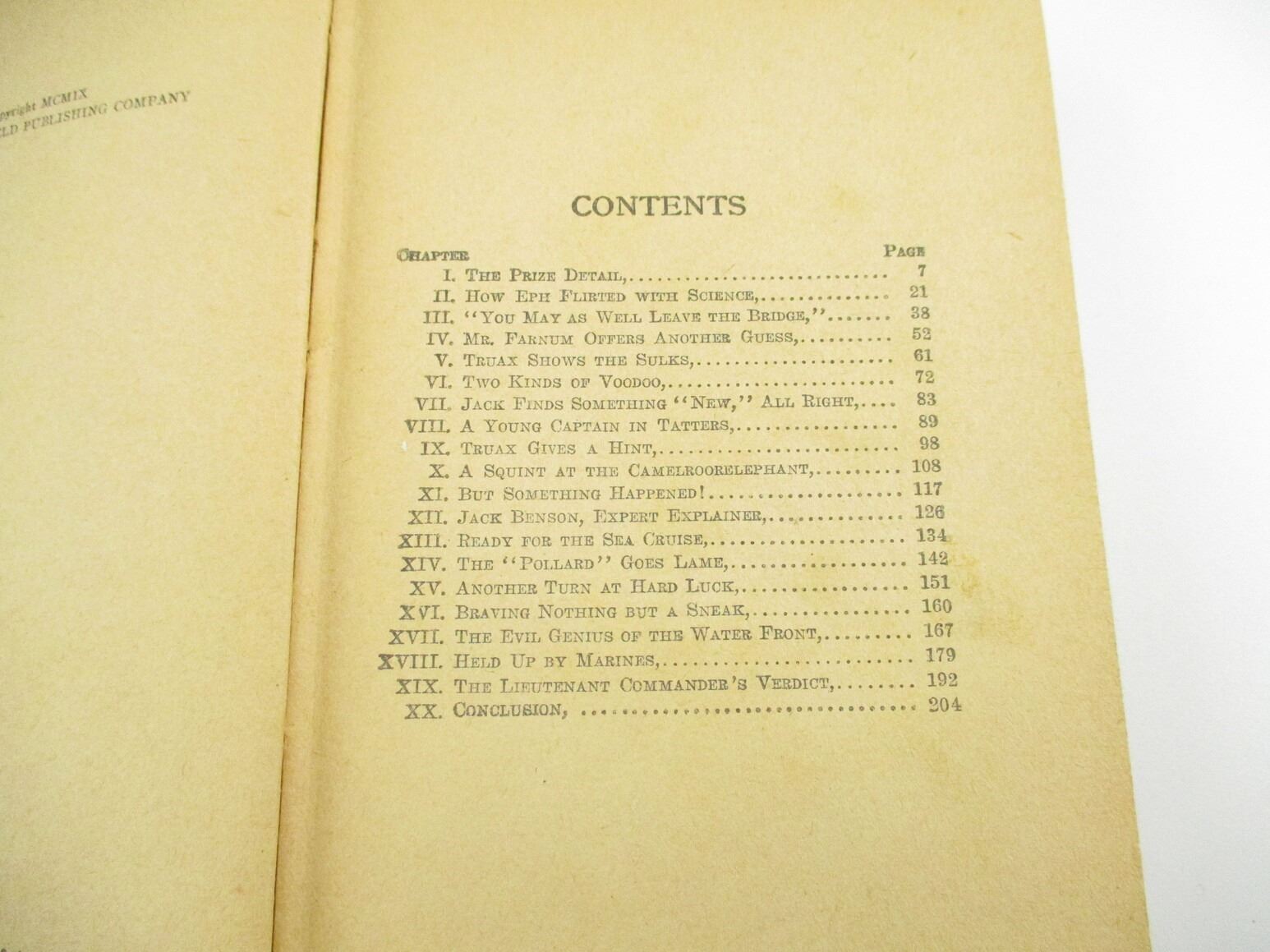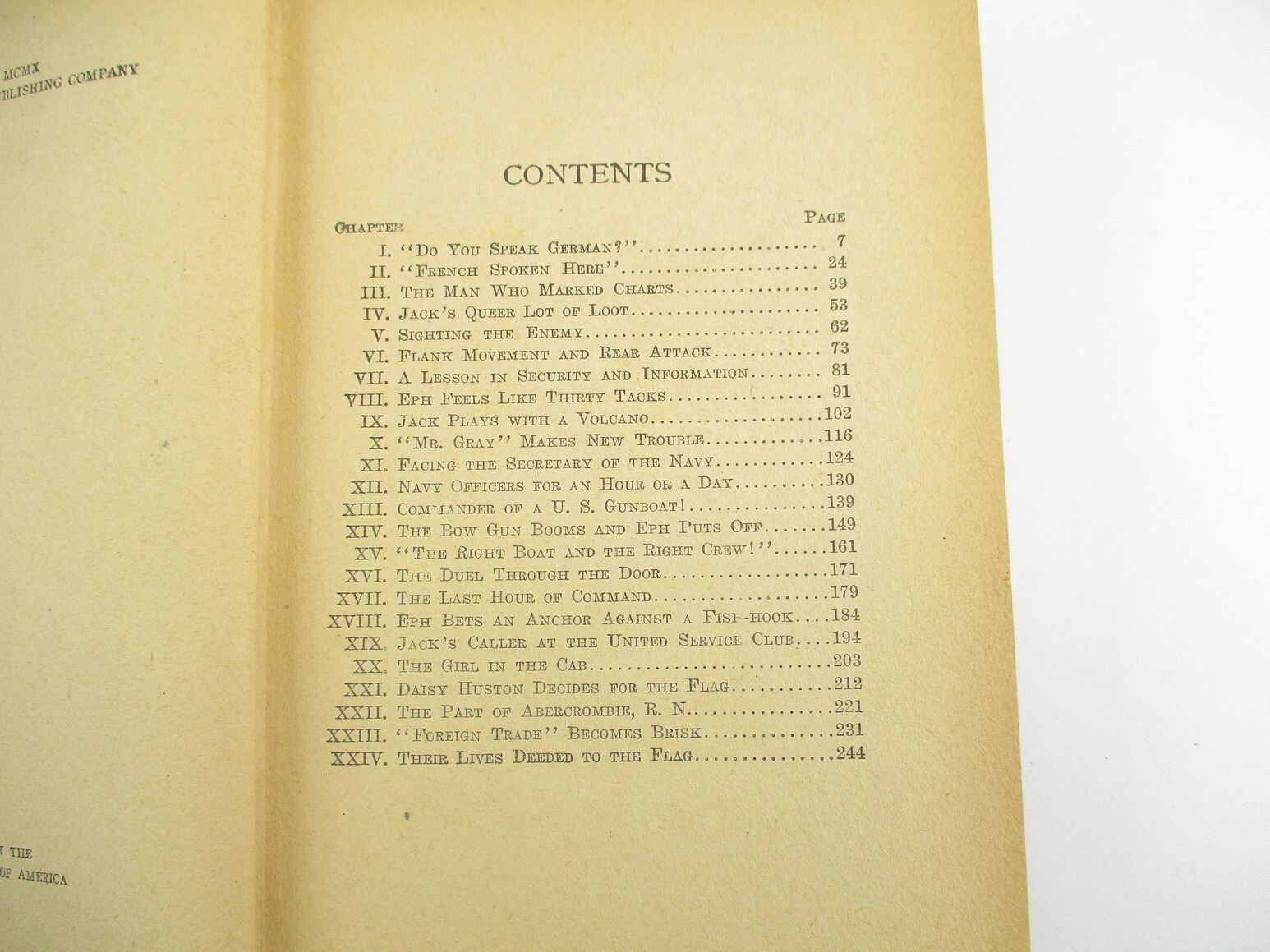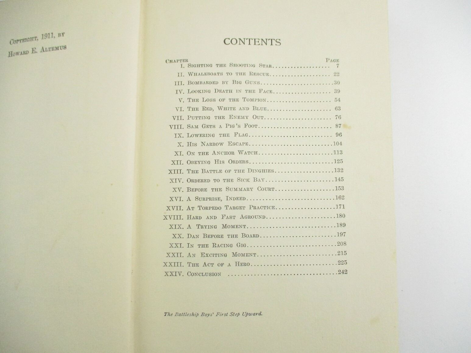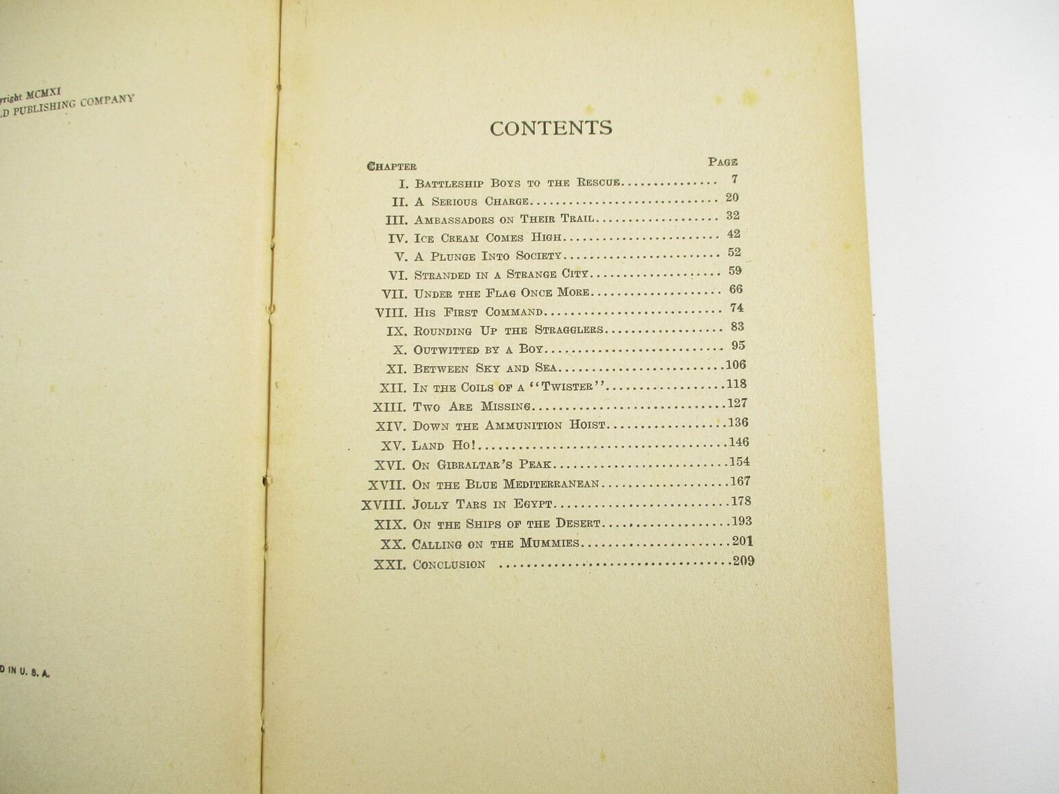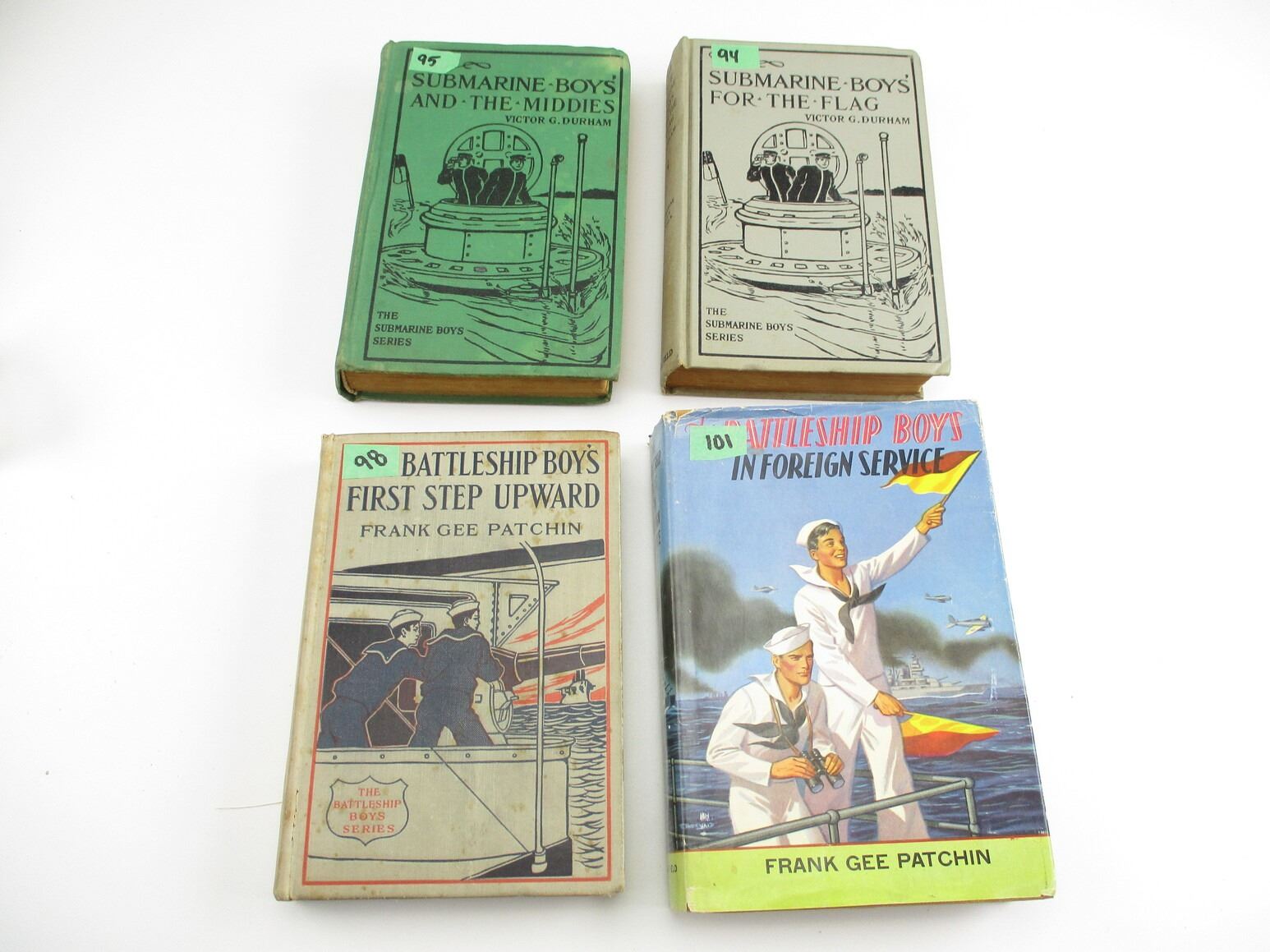 ASSORTED MILITARY BOOK LOT, LOT OF 4: (1) "THE SUBMARINE BOYS' FOR THE FLAG" BY VICTOR G. DURHAM; (1) "THE SUBMARINE BOYS' AND THE MIDDIES" BY VICTOR G. DURHAM; (1) "THE BATTLESHIP BOYS IN FOREIGN SERVICE" BY FRANK G. PATCHIN; (1) "THE BATTLESHIP BOYS FIRST STEP UPWARD" BY FRANK GEE PATCHIN, 1911, SEE PHOTOS