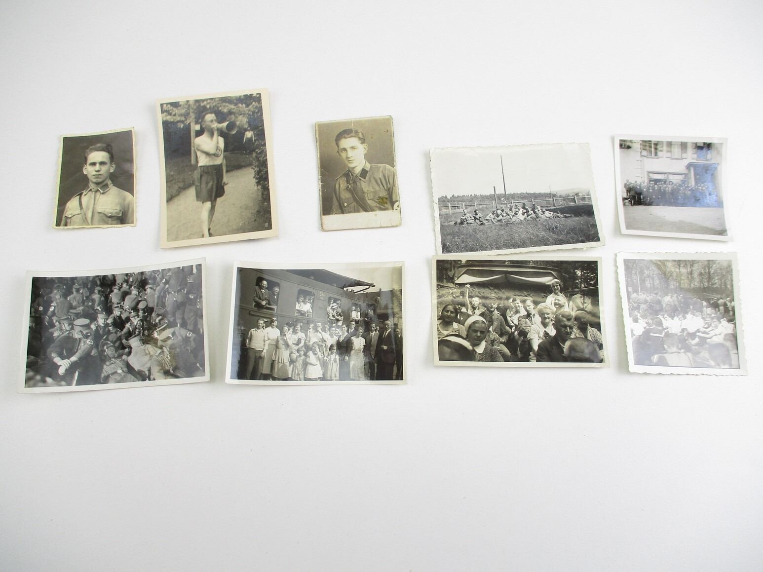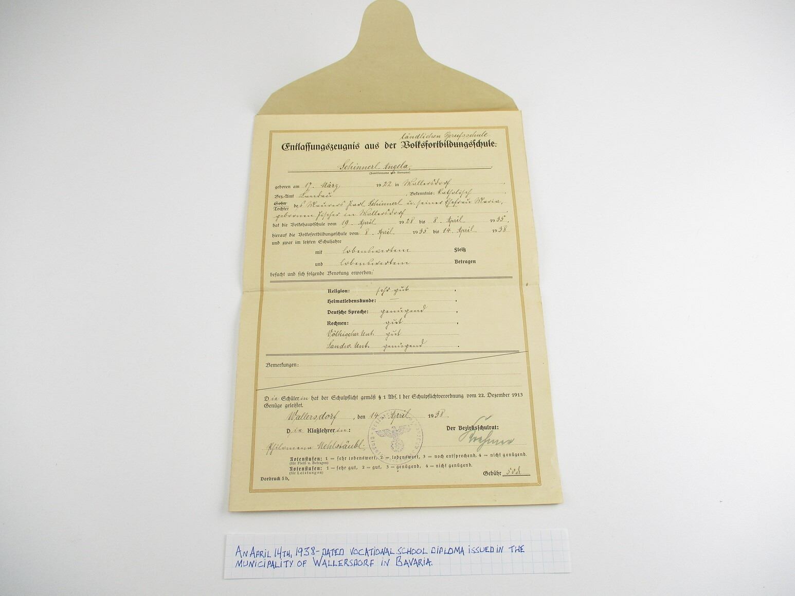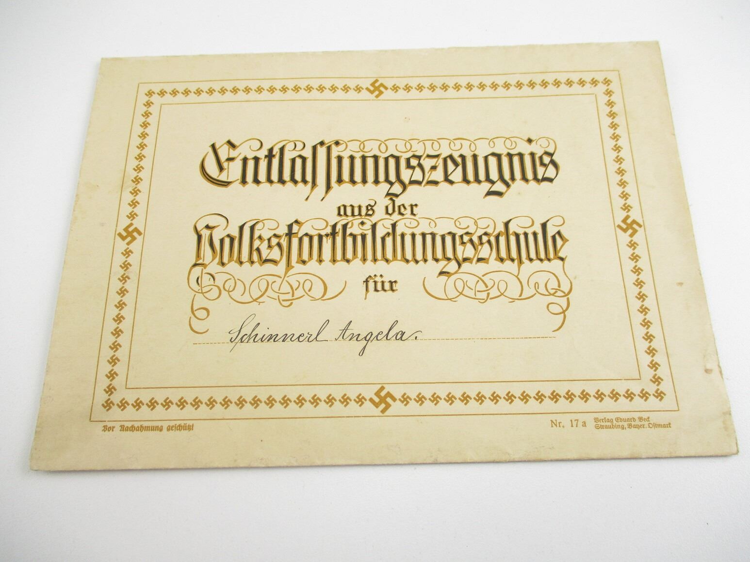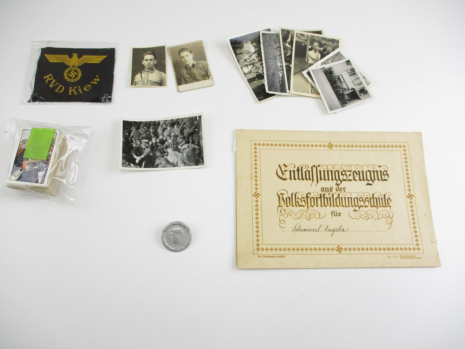 ASSORTED MILITARIA DOCUMENT LOT, LOT INCLUDES ORIGINAL THIRD REICH GERMANY ITEMS: (1)CIVILIAN VOCATIONAL SCHOOL DIPLOMA, DATED 1938;(1) DEUTSCHES REICHSBAHN RVD (REICH TRAFFIC DIRECTORATE) KIEW (KYIV, UKRAINE) ARM INSIGNIA; (1) ADOLF HITLER DONATION BADGE, DATED 1935/1936, MARKED WHW; (9) STURMABTEILUNG PHOTOS, SOME DATED AND/OR INSCRIBED ON BACK; APPROX. 116 STURMABTEILUNG CIGARETTE CARD COLLECTION, SEE PHOTOS