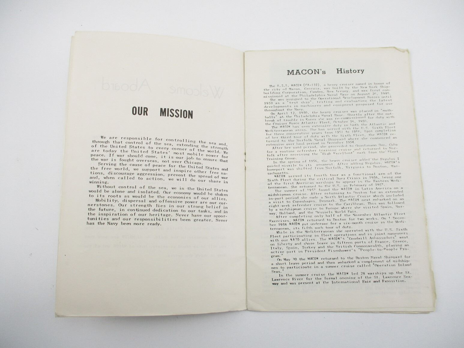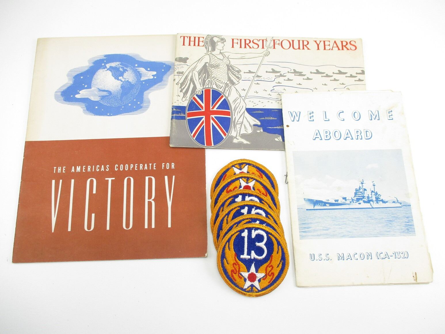 MILITARIA BOOK LOT, LOT INCLUDES: (1) "THE AMERICA'S COOPERATE FOR VICTORY" BOOKLET ISSUED BY THE U.S.A.; (1) "WELCOME ABOARD: U.S.S.MACON (CA-132)" BOOKLET ISSUED BY THE U.S.A.; (1) "THE FIRST FOUR YEARS" ISSUED BY THE U.S.A; (6) POST W.W.2 U.S. AIR FORCE PATCHES, 1950'S, SEE PHOTOS