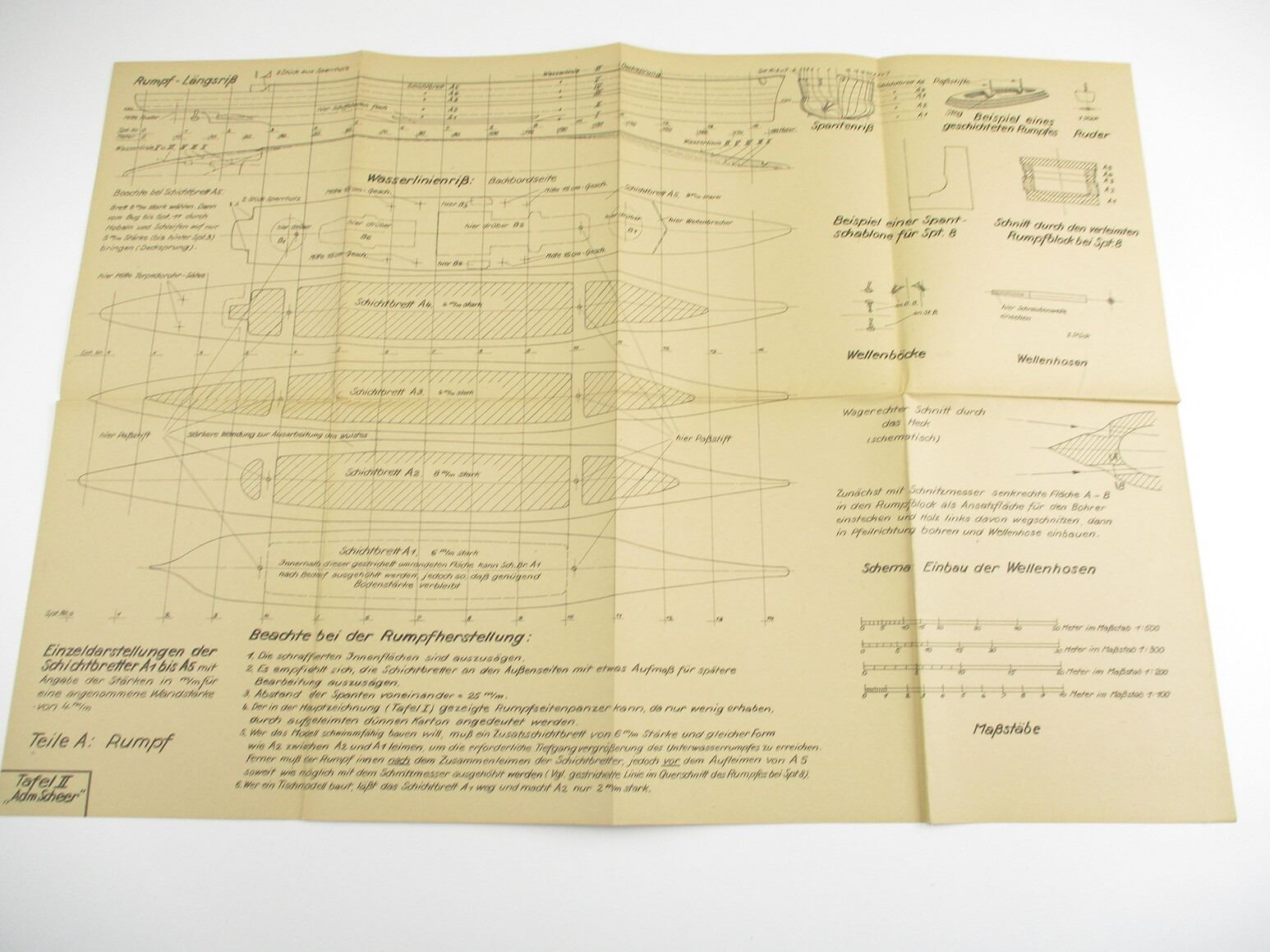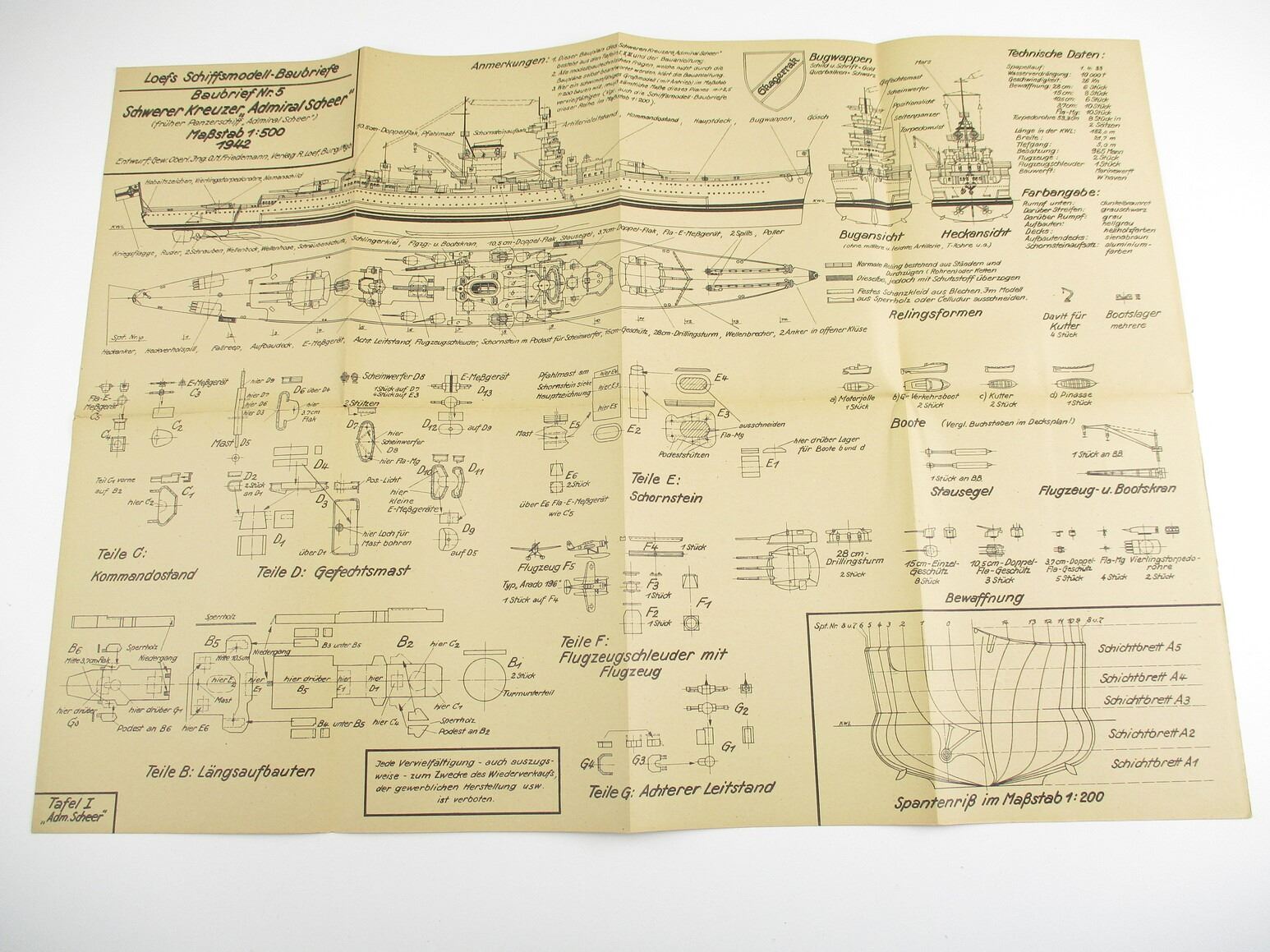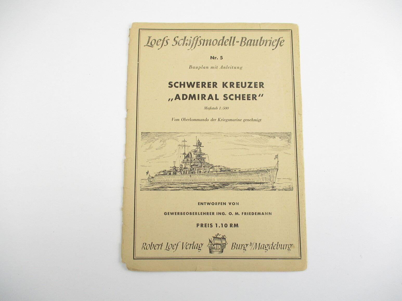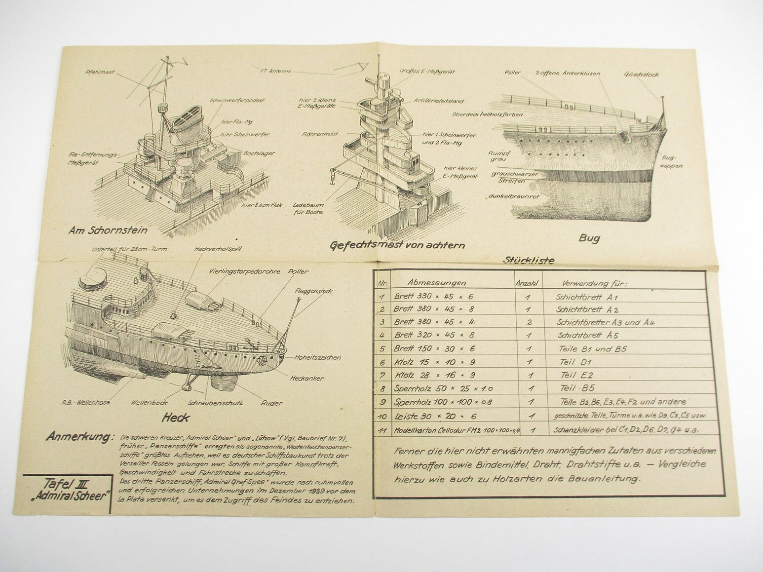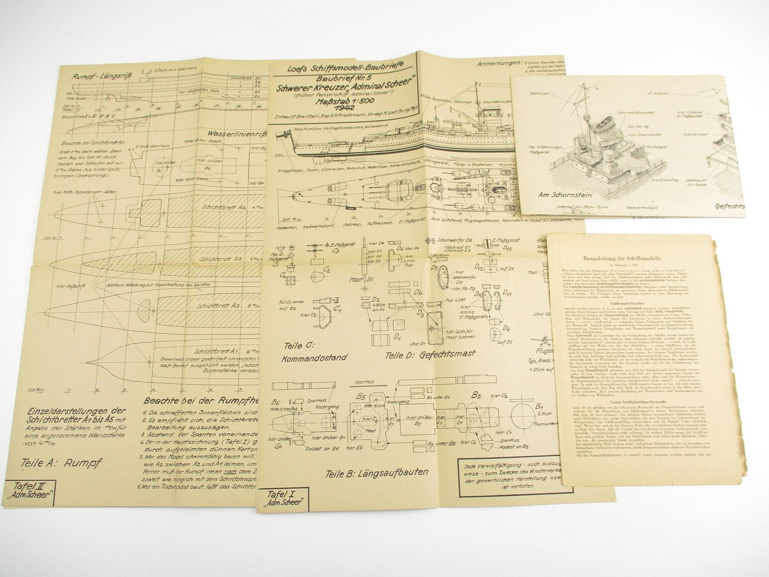 MILITARIA DOCUMENT LOT, " SCHEER KREUZER "ADMIRAL SCHEER", LOEFS SCHIFFSMODELL-BAUBRIEFE, 1:500 SCALE, KRIEGSMARINE MODEL SHIP PLANS TO BUILD A REPLICA OF THE WW 2 HEAVY CRUISER "ADMIRAL SCHEER", SEE PHOTOS