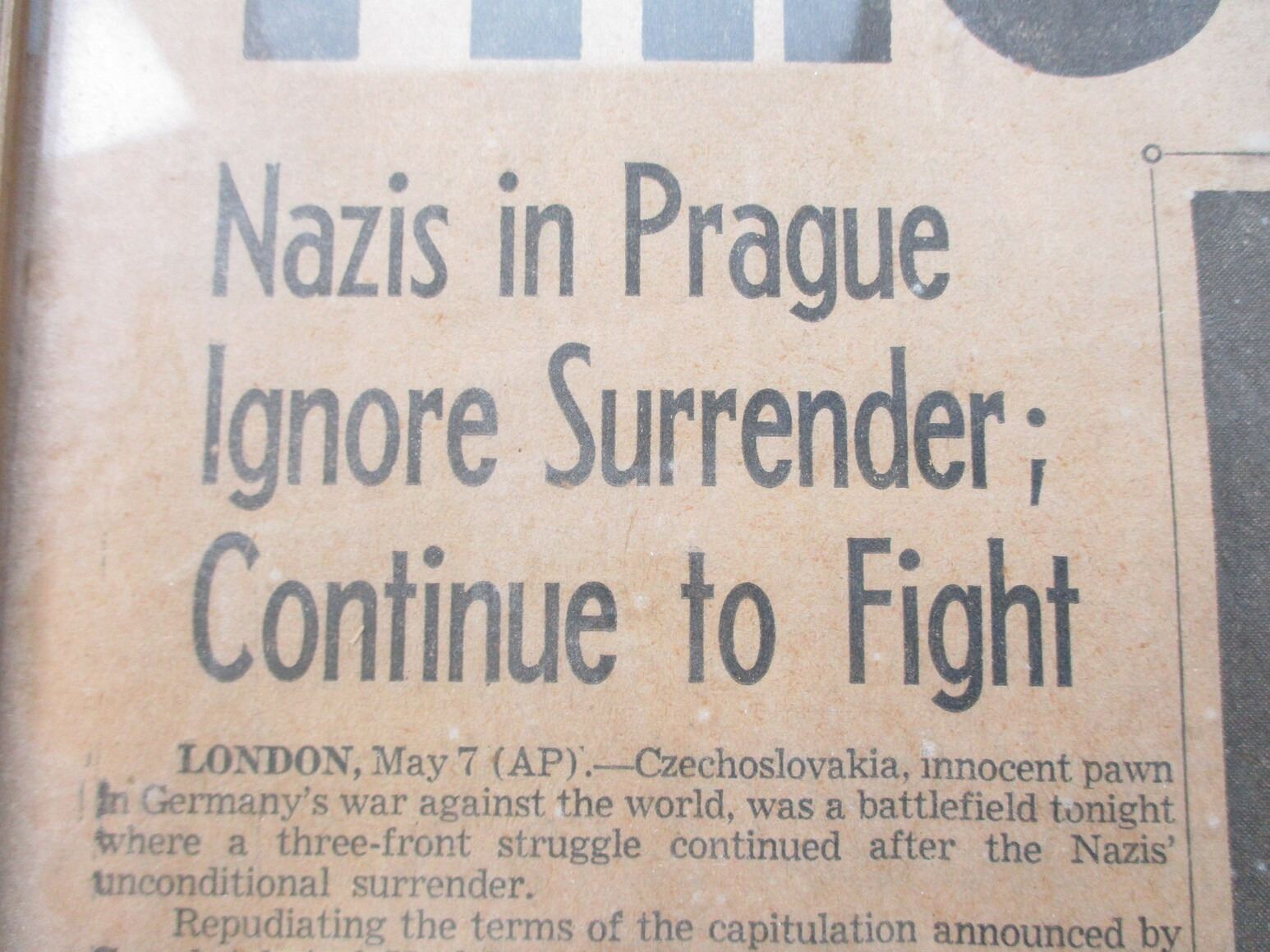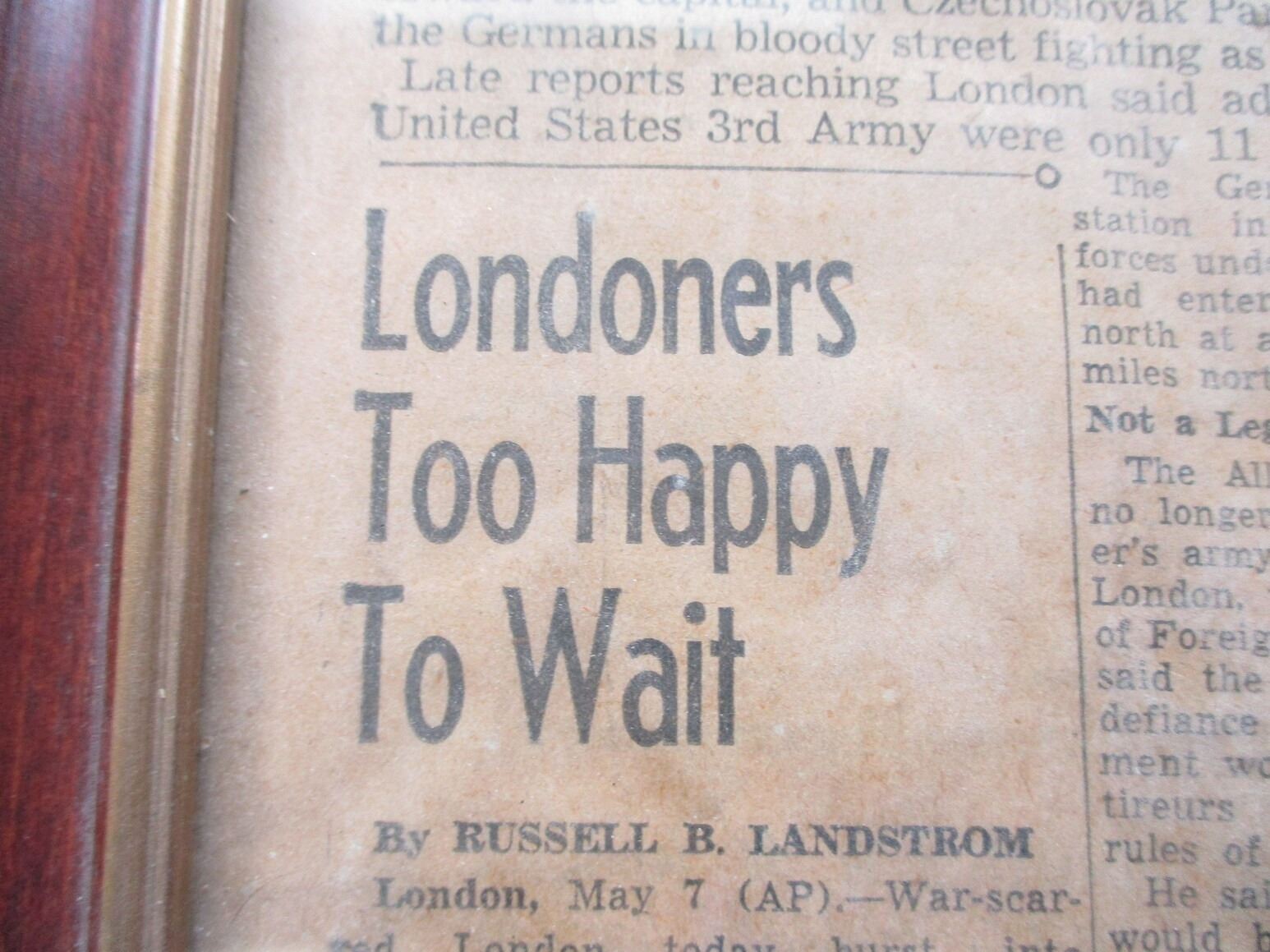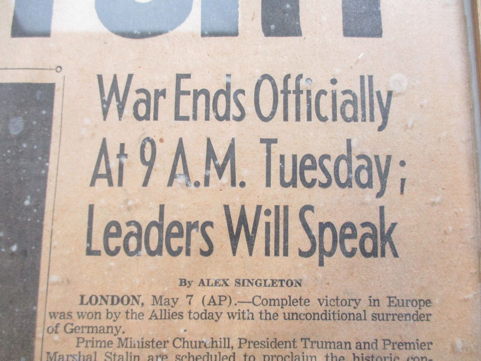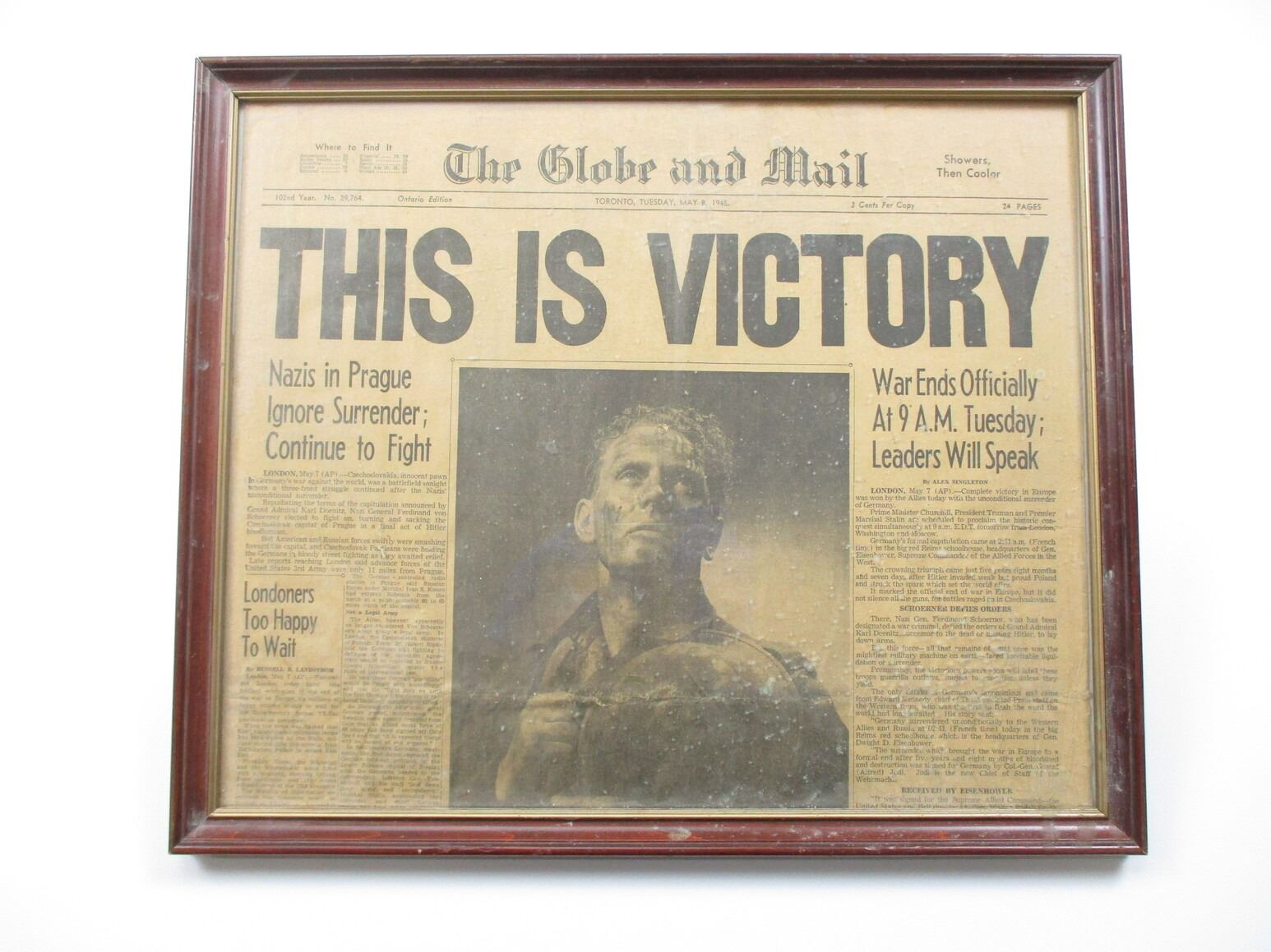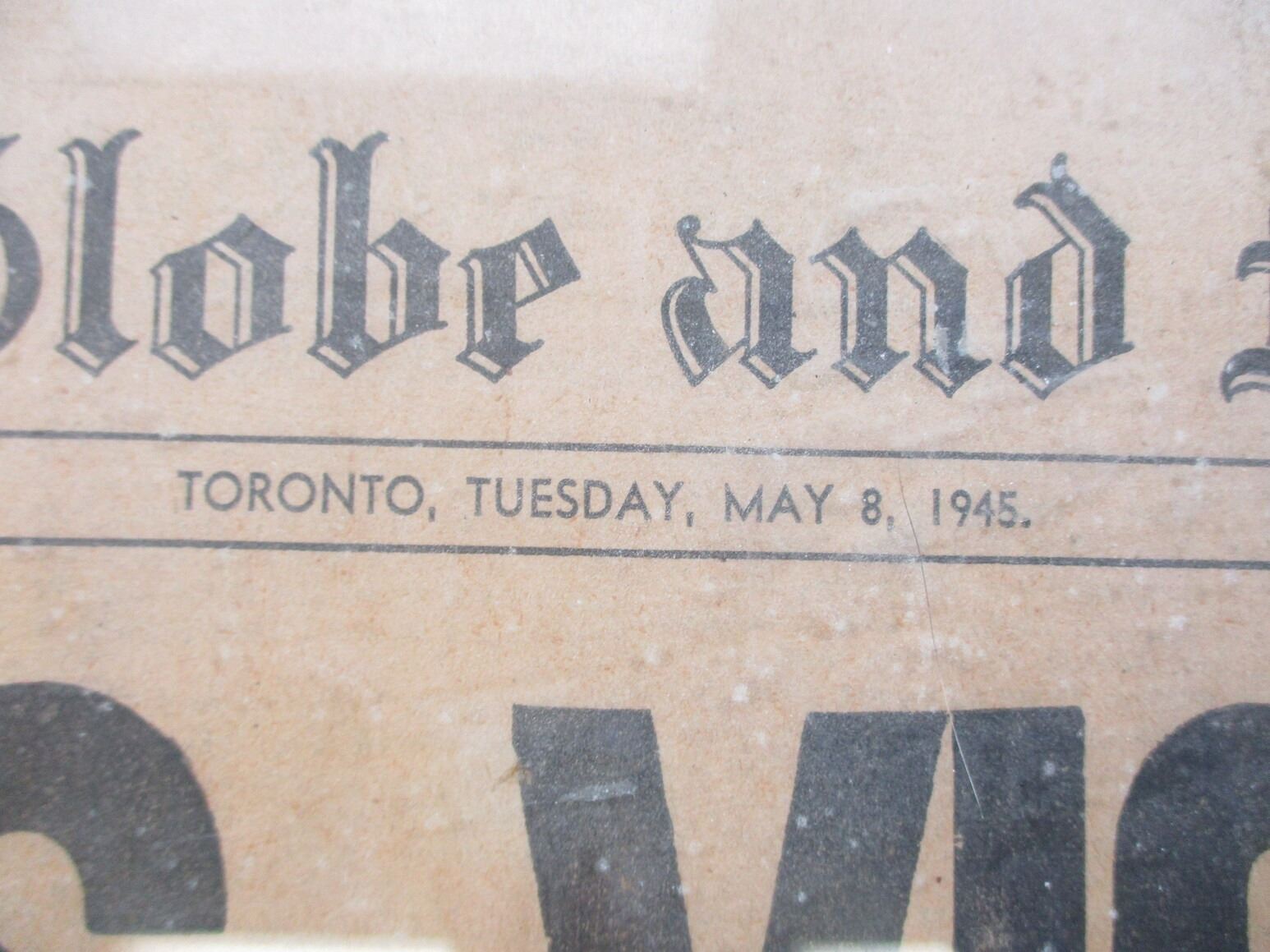 GLOBE & MAIL END OF THE WAR NEWSPAPER CLIPPING, (1) TORONTO GLOBE & MAIL HEADLINE PAGE FROM MAY 8, 1945 DECLARING VICTORY OVER NAZI GERMANY, ONTARIO EDITION, FRAMED, APPROX. 18.5" X 15.5". SEE PHOTOS. *GLASS NOT GUARANTEED DURING SHIPPING*