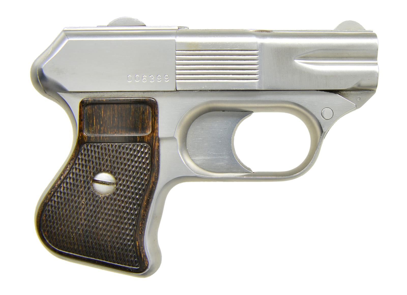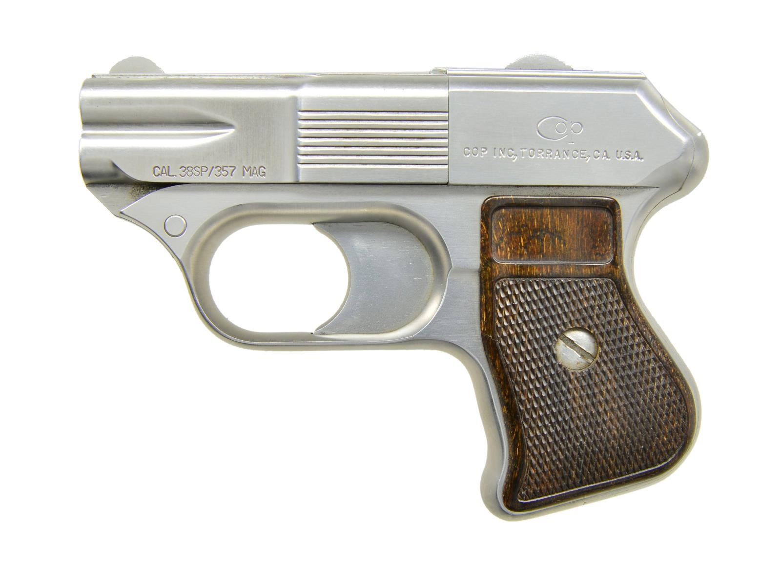 Cal. 357 Mag. S# 006399. Bbl. 3". An interesting 4-barreled pistol, w/ a tip-up design, marketed as a deep concealment piece. The company, COP, Inc. was an acronym for "Compact Off Duty Police" as was its design intention. It uses a ratcheting, rotating internal hammer mechanism that strikes one pin / chamber at a time. It is constructed of stainless steel w/ fixed sights. Checkered 2pc. wooden grips. CONDITION: As typical when these interesting firearms surface, there is not much sign of actual use. Fire control mechanism appears to function correctly when cycled by hand. (22-4736/JZ). MODERN. $400-600.