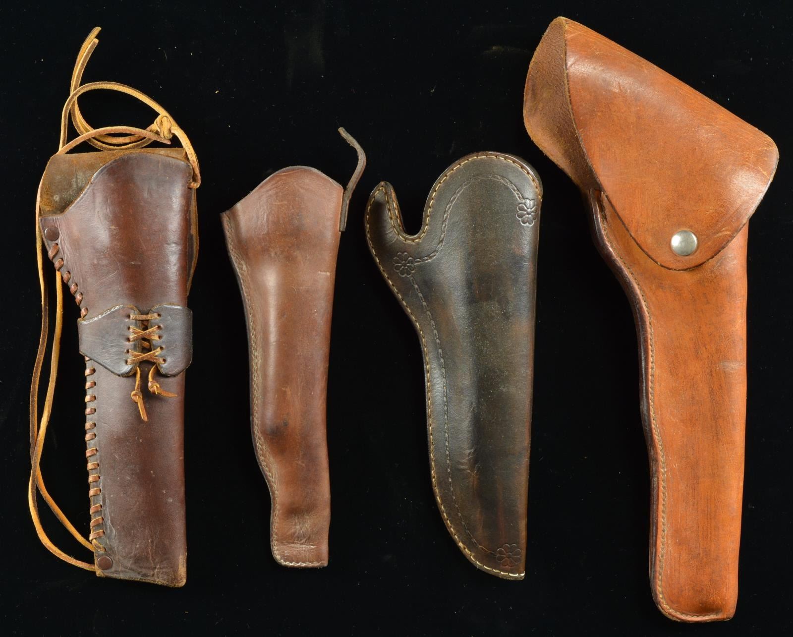 Holsters: (2) Brauer Bros H30 6 1/2. / S.D. Myres Challenger S&W 22 46. / (3) Bucheimer Federal Man: B410, 410, 670. / George Lawrence 30 6. / Brown leather H 30 5 1/2. / Brown leather 740. / S>D> Myres brown flap style. / slim brown unmarked open top. / HB dark brown open top large frame SAA. / unmarked brown rawhide laced open top large frame SAA. /
