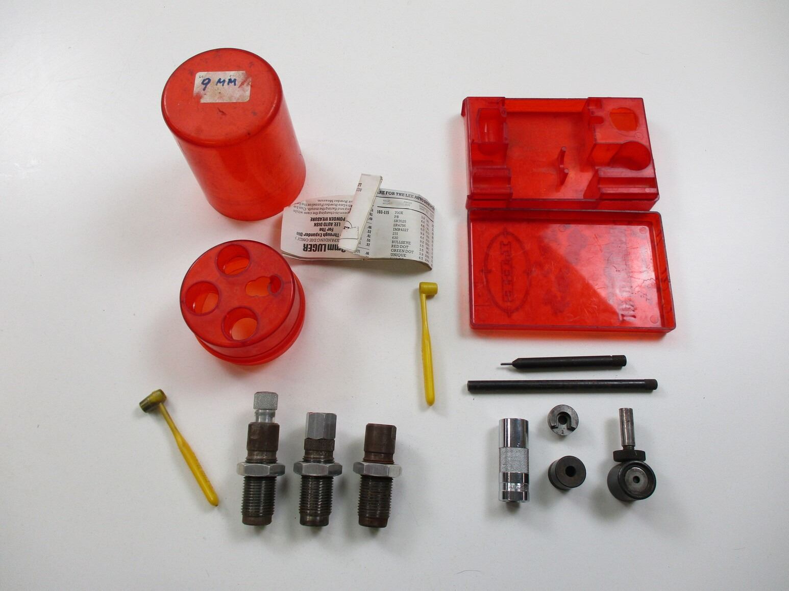 LEE 9MM RELOADING DIES LOT, LOT INCLUDES; (1) 3-PIECE RELOADING DIES & (1) RELOADING KIT, MAY NOT BE COMPLETE. SEE PHOTOS.