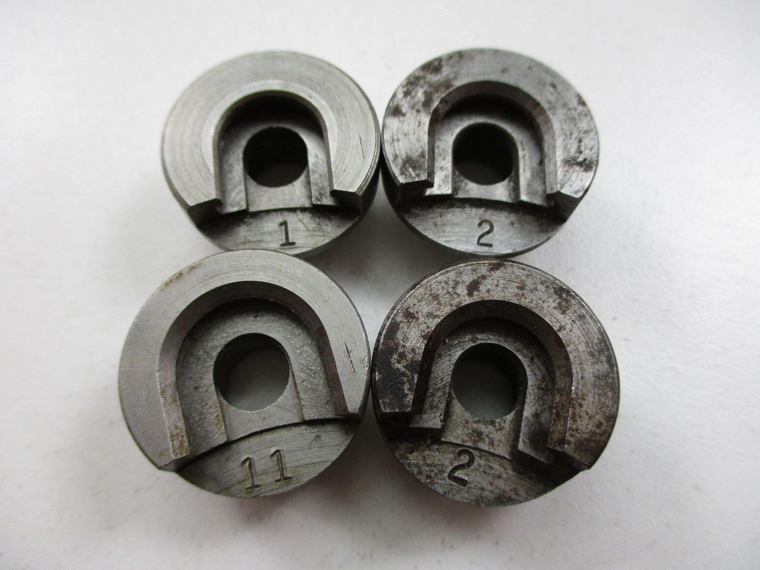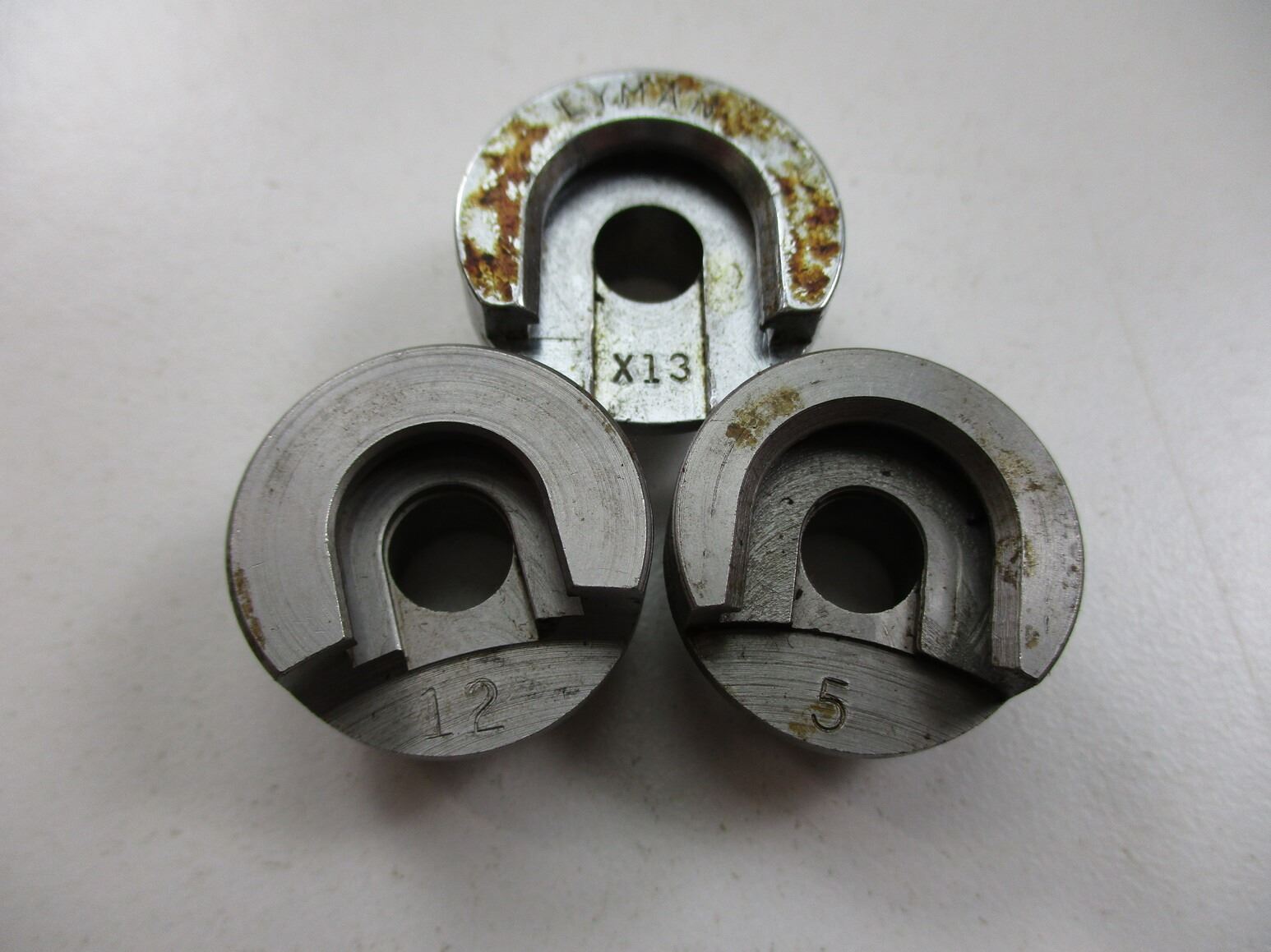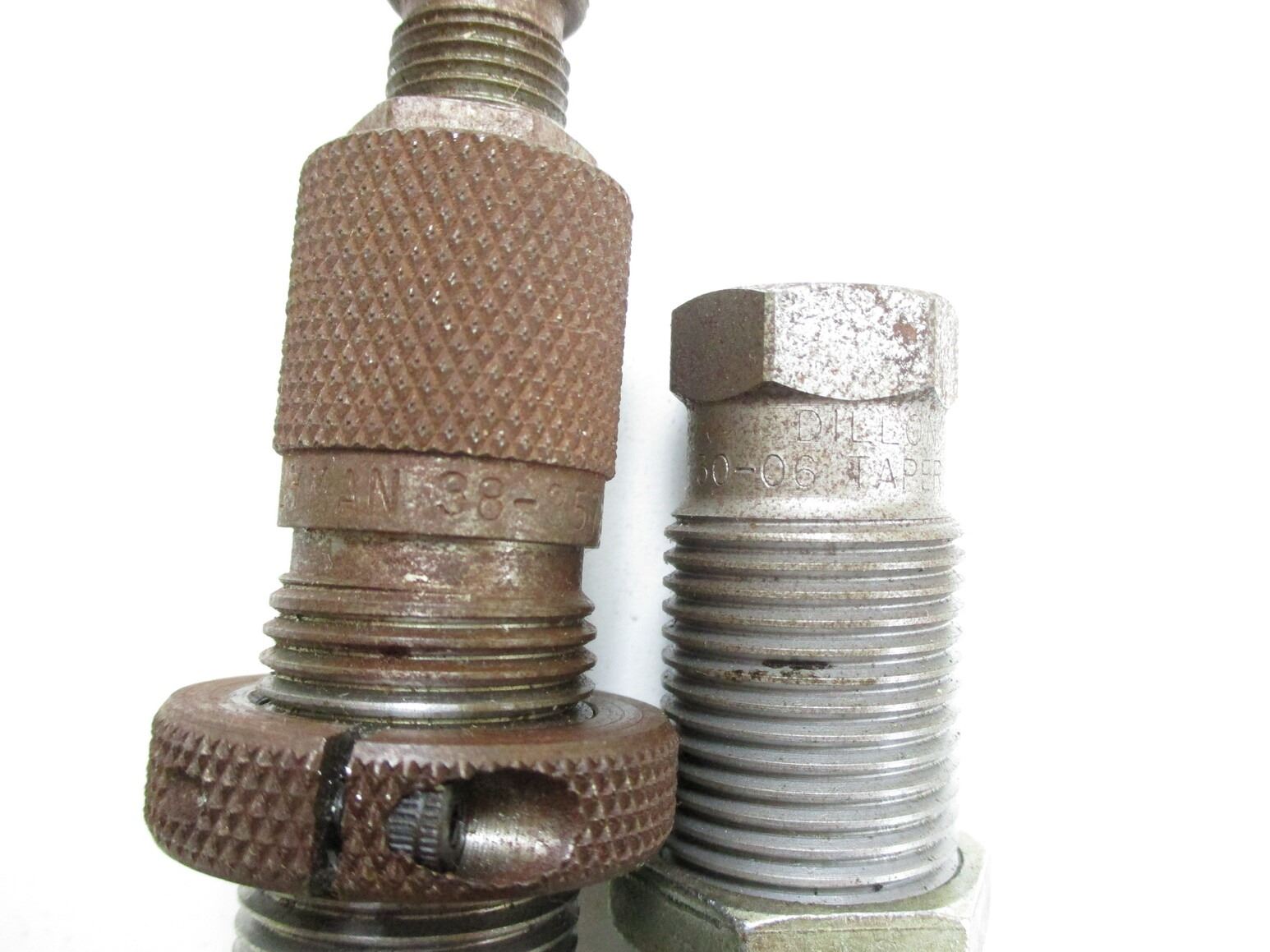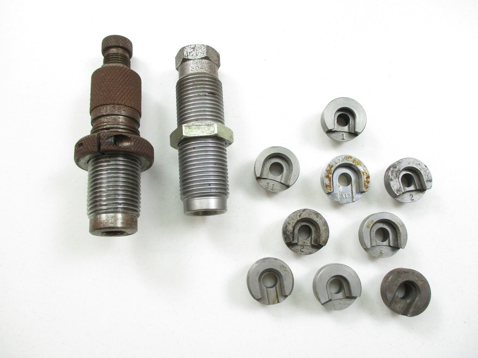 ASSORTED SHELL HOLDER AND RELOADING DIES LOT, LOT INCLUDES; (11) SHELL HOLDERS (#1, #2 (TWO), #5, #10, #11, #12, #X13 & TWO WITH SOME CORROSION), (1) LYMAN .38 / .357 SEATING DIE (SOME RUST / CORROSION) & (1) DILLON .30-06 CRIMP DIE. SEE PHOTOS.