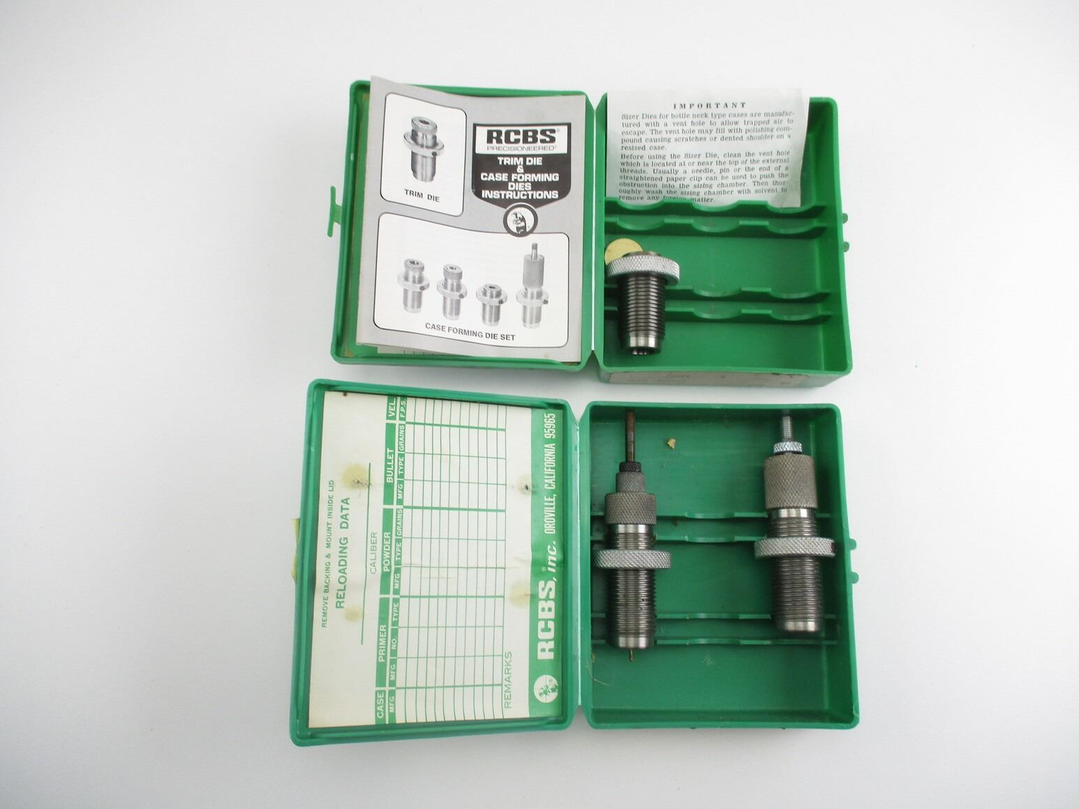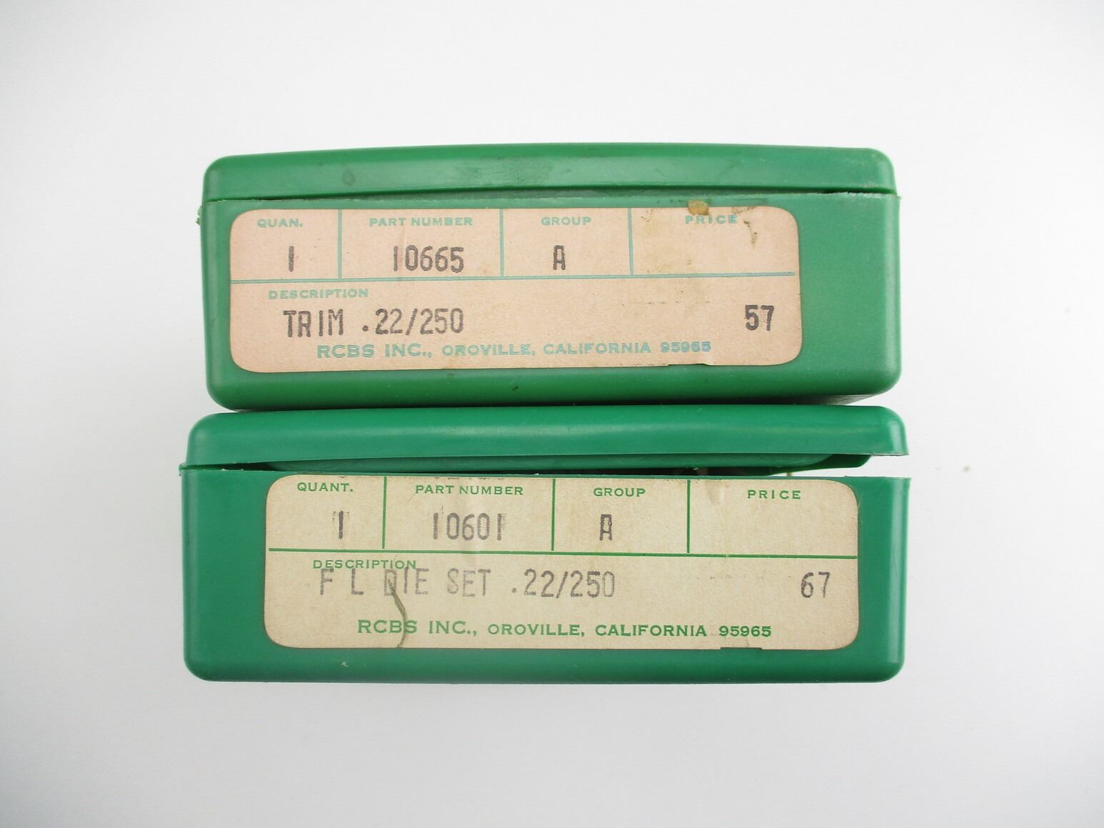 RCBS .22 / .250 RELOADING DIES LOT, LOT INCLUDES; (1) 2-PIECE DIES & (1) 1-PIECE TRIM DIE. SEE PHOTOS.