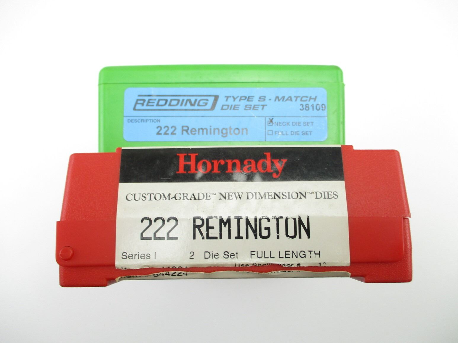 ASSORTED .222 REM RELOADING DIES LOT, LOT INCLUDES; (1) 2-PIECE HORNADY RELOADING DIES & (1) 2-PIECE REDDING RELOADING DIES. SEE PHOTOS.